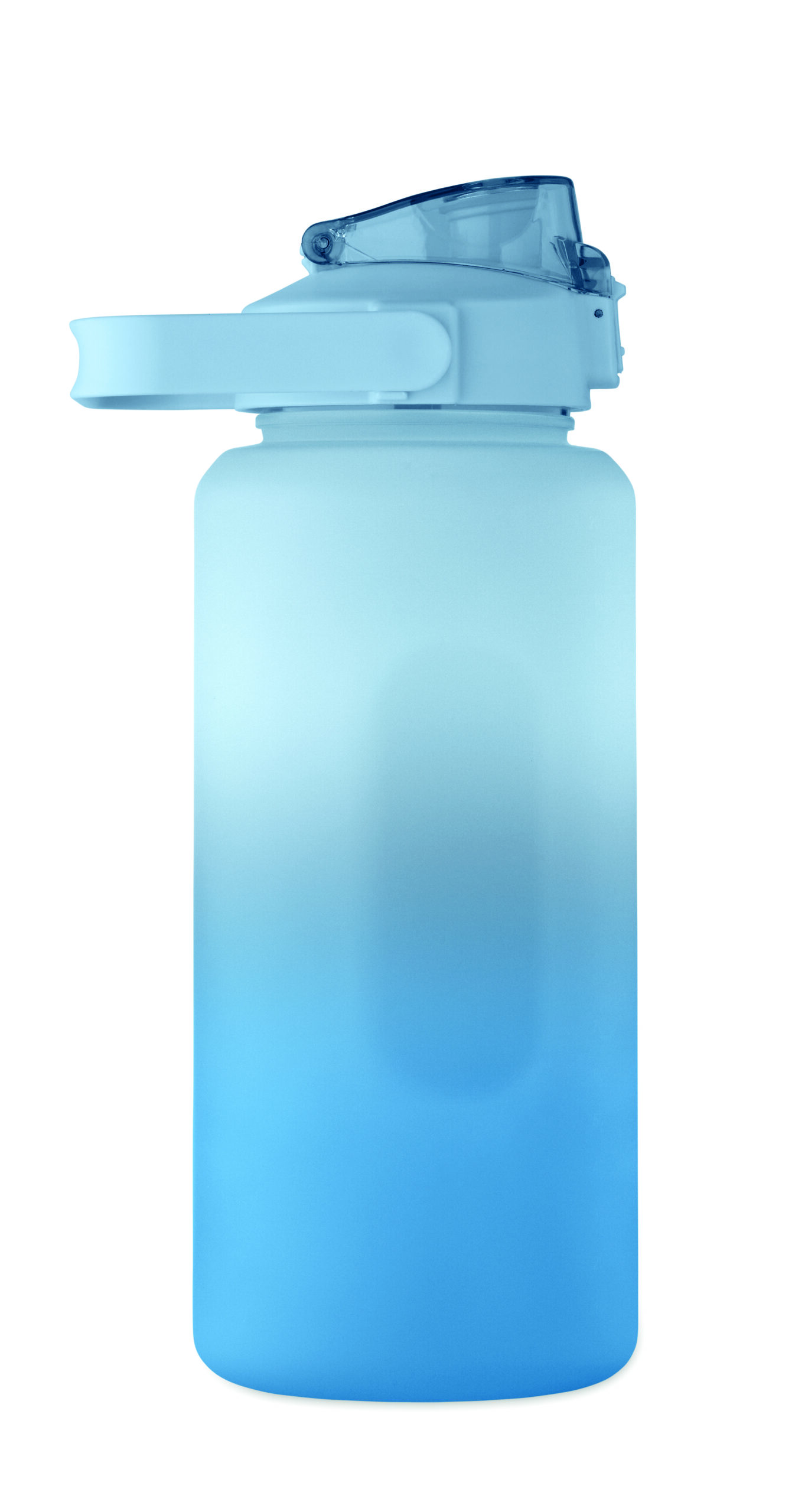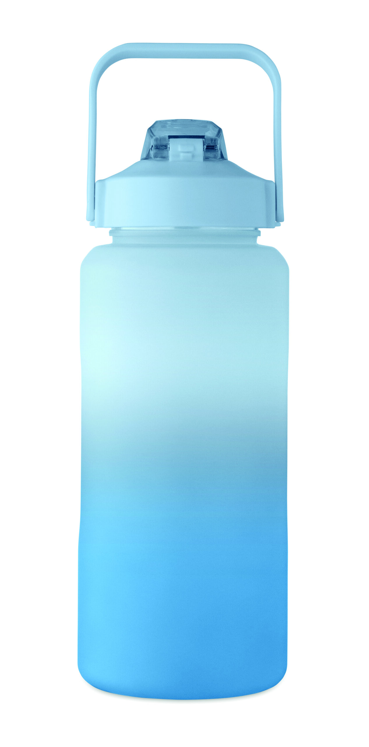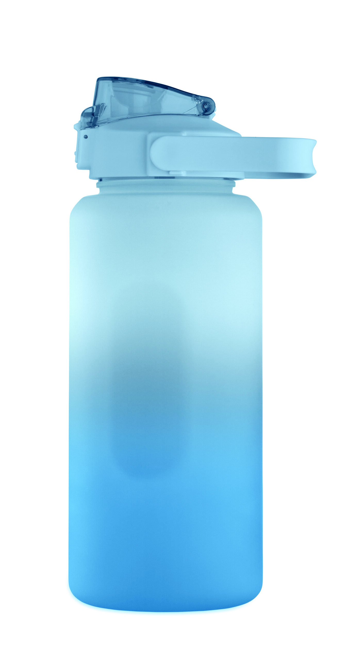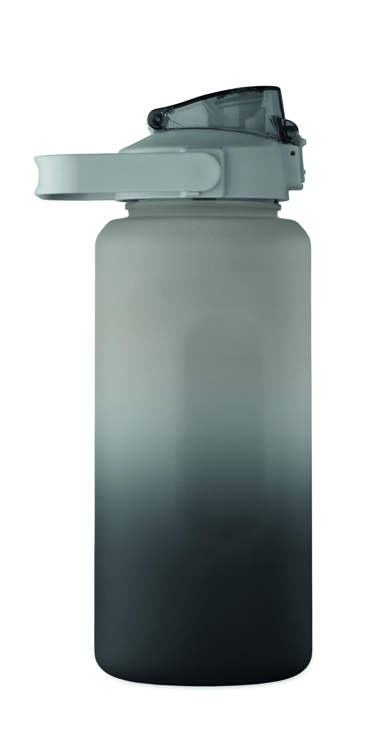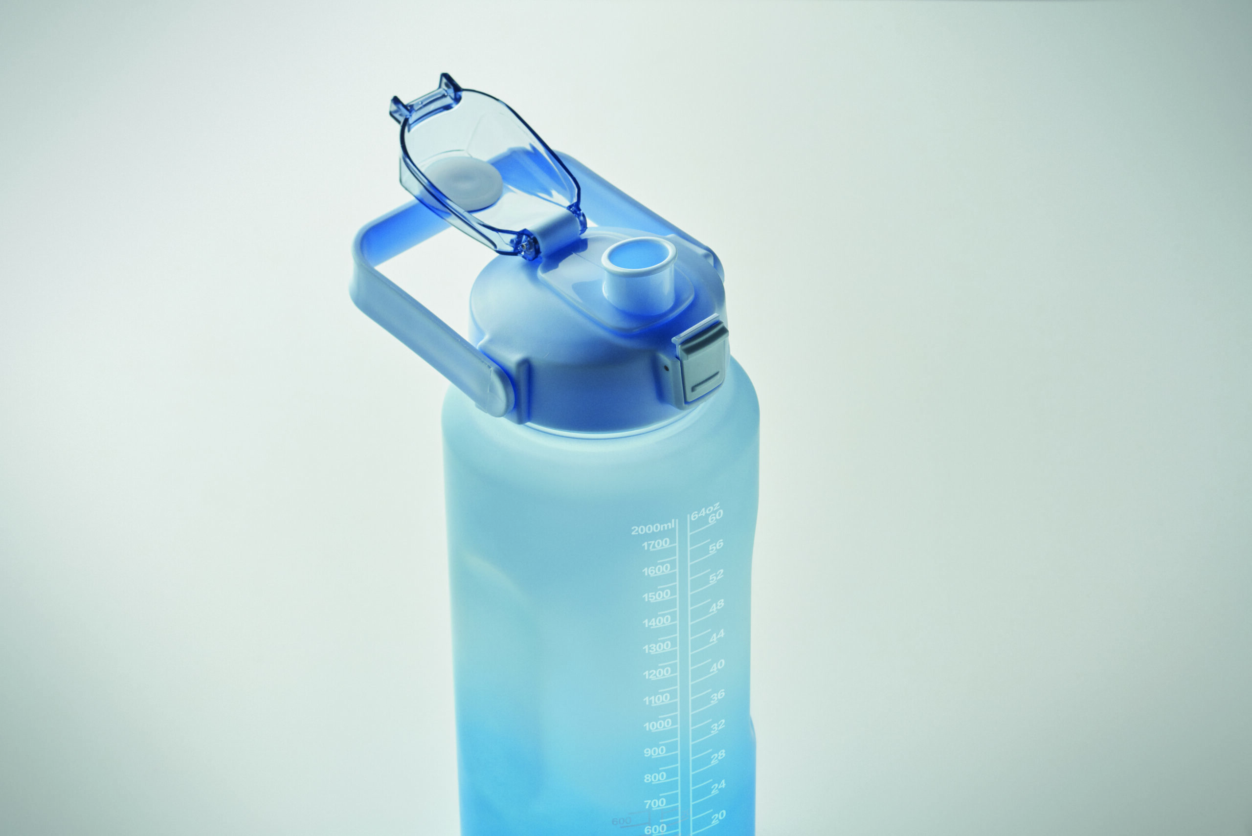 Motywacyjna butelka na wodę z RPET. Posiada otwieraną jedną ręką klapkę ze słomką, blokadę bezpieczeństwa i uchwyt. Nie przecieka. Pojemność: 2000 ml
