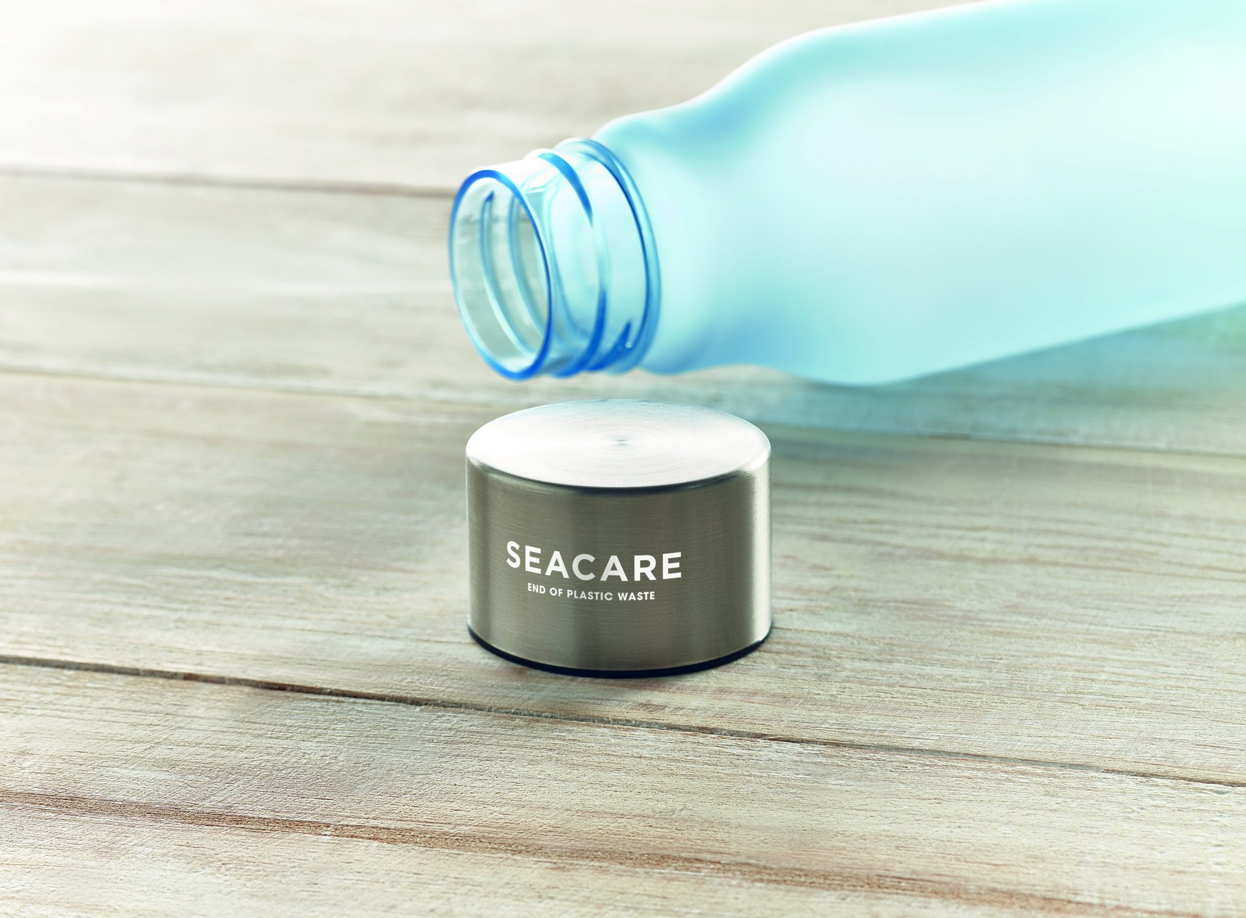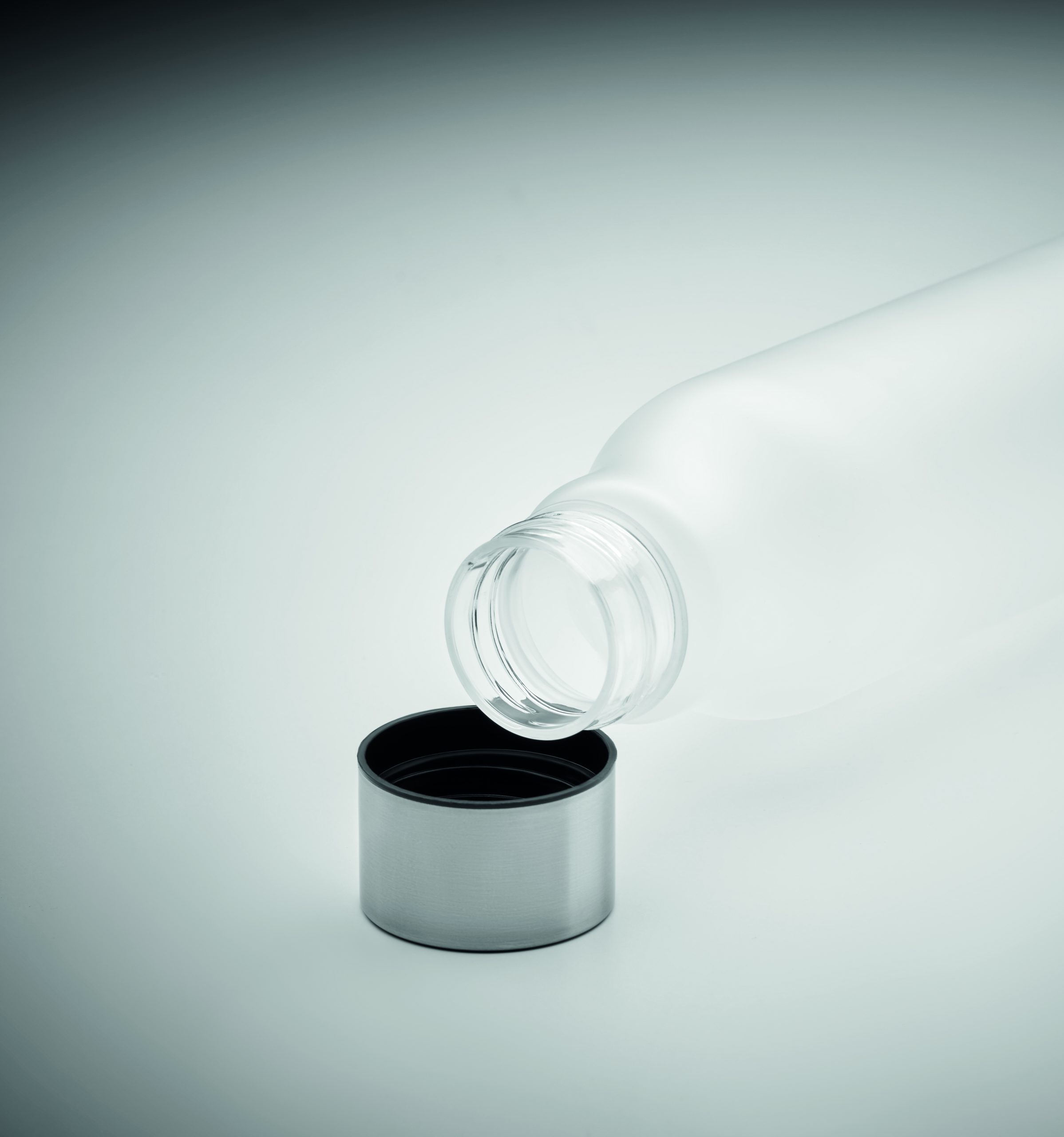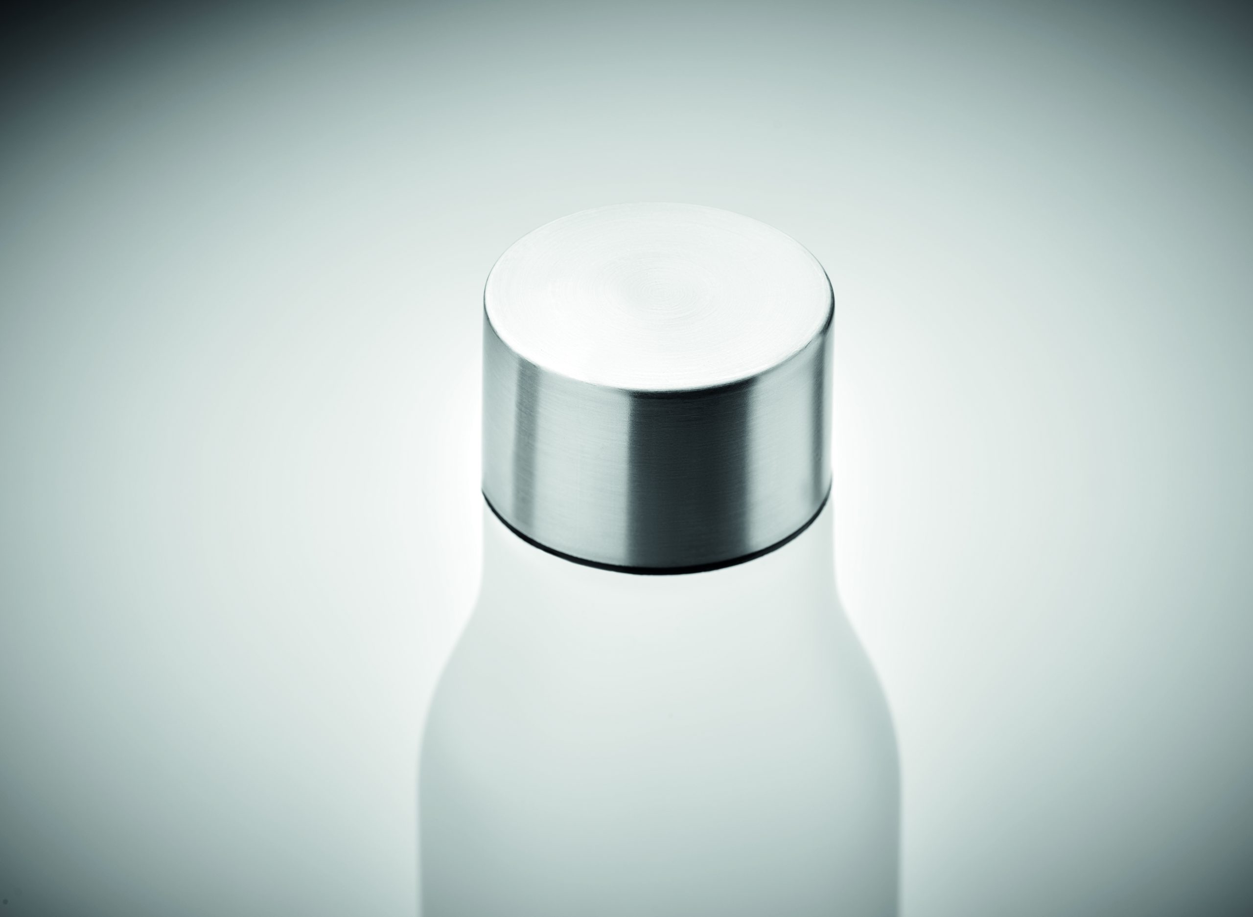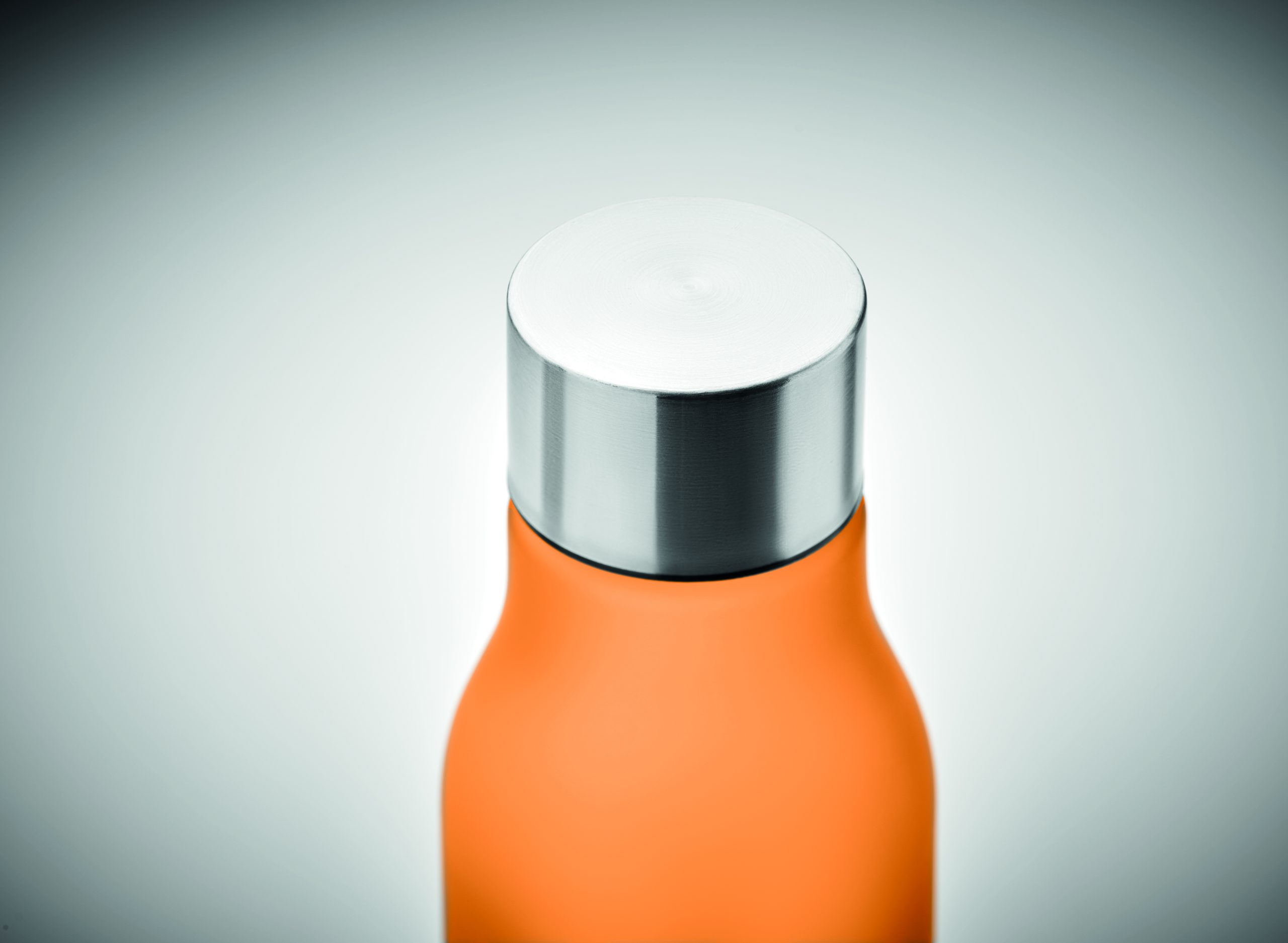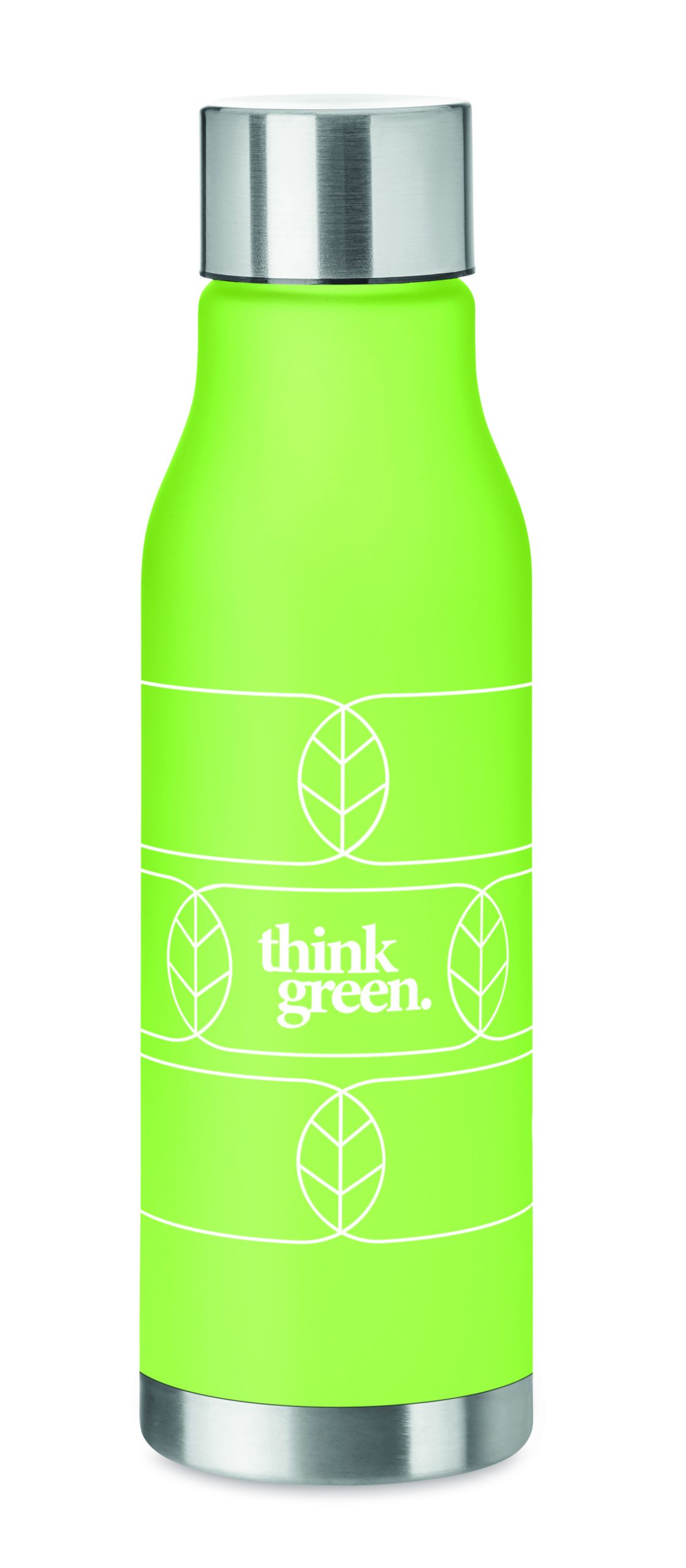 Butelka z RPET z gumowanym wykończeniem, zakrętka ze stali nierdzewnej z silikonowym pierścieniem. Bez BPA. Szczelna. Pojemność: 600 ml. Nie nadaje się do napojów gazowanych.