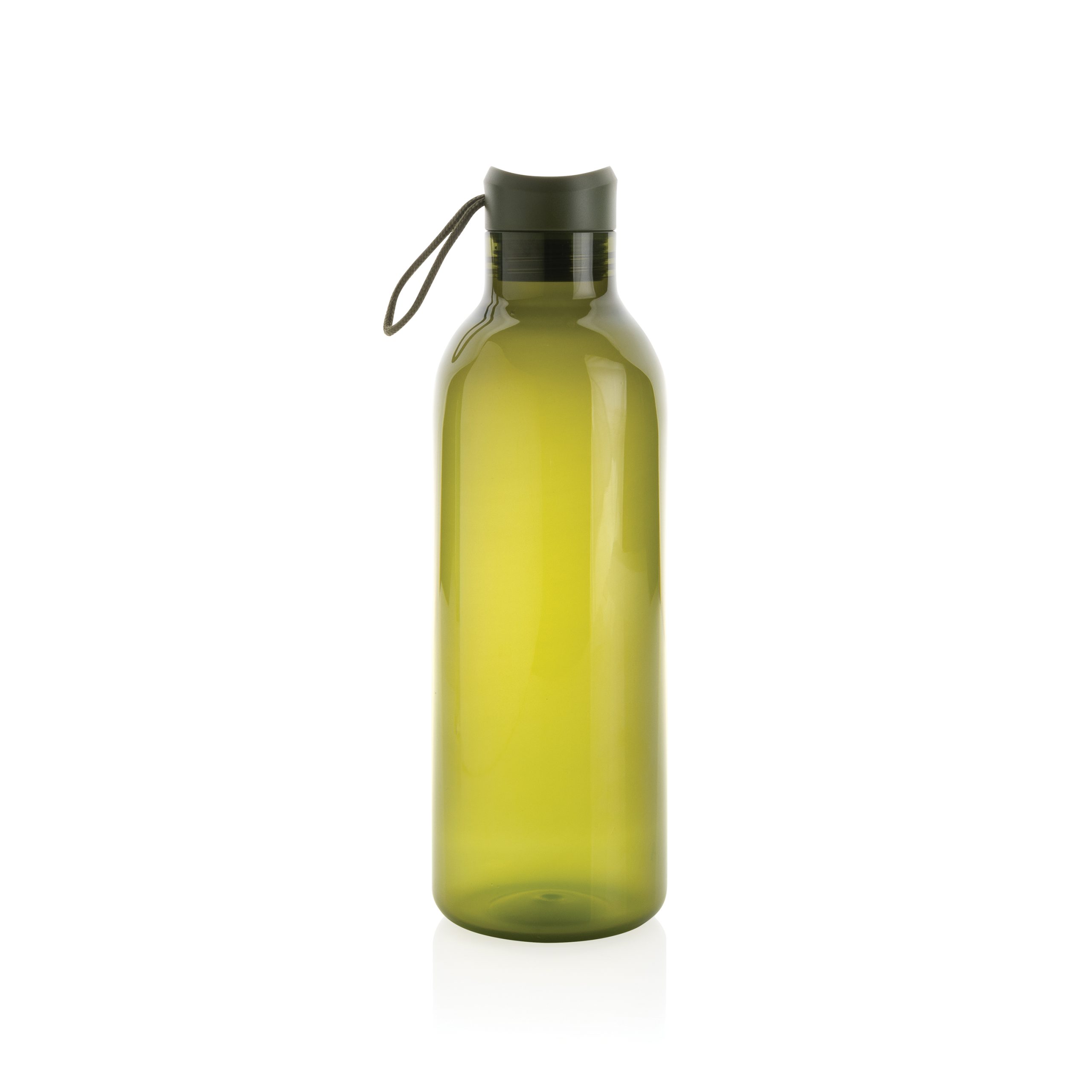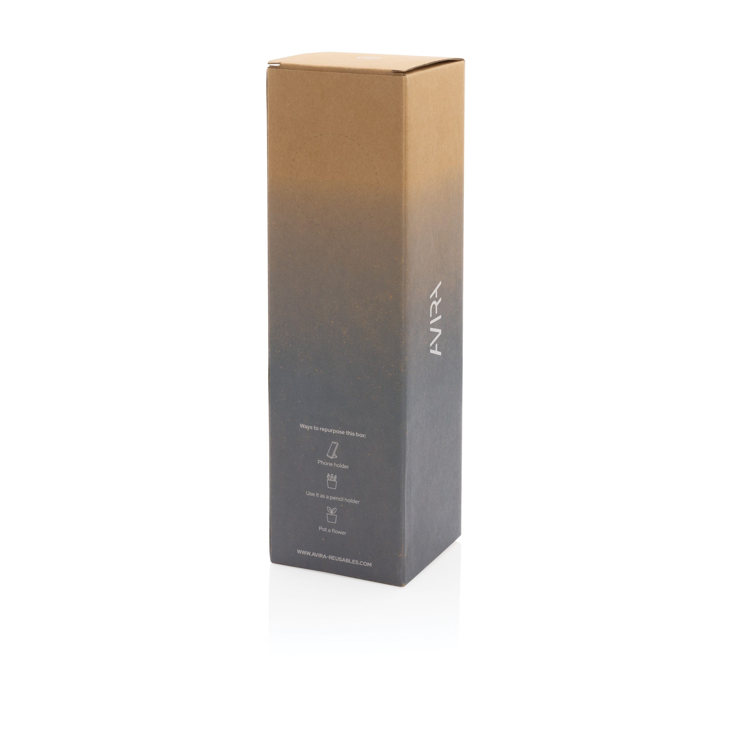 Butelka sportowa 1000 ml, wykonana z RPET z certyfikatem RCS, całkowita zawartość materiałów z recyklingu obliczona na podstawie wagi całkowitej przedmiotu: 86%, w pudełku z papieru kraftowego z certyfikatem FSC®, zalecana do zimnych napojów, wyłącznie mycie ręczne, pudełko można wykorzystać jako stojak na telefon lub doniczkę