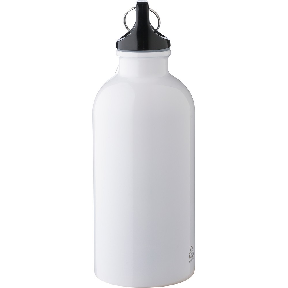 Butelka sportowa 400 ml, ikona recyklingu na produkcie, nie nadaje się do mycia w zmywarce, produkt wykonany ze stali nierdzewnej z recyklingu, nakrętka z PP, srebrny aluminiowy karabińczyk