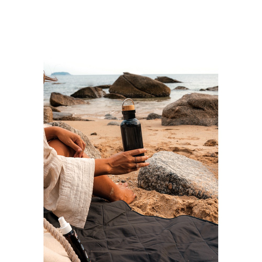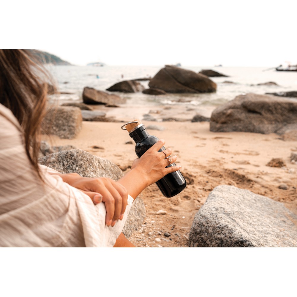Butelka sportowa 680 ml z uchwytem, korpus wykonany z RPET z certyfikatem RCS który gwarantuje, że wykorzystane materiały pochodzą z recyklingu, zakrętka wykonana z bambusa z certyfikatem FSC® (Forest Stewardship Council), całkowita zawartość materiału z recyklingu obliczona w oparciu o wagę całkowitą przedmiotu: 56%, wyłącznie do zimnych napojów, nie należy myć w zmywarce, w pudełku z papieru kraftowego z certyfikatem FSC®
