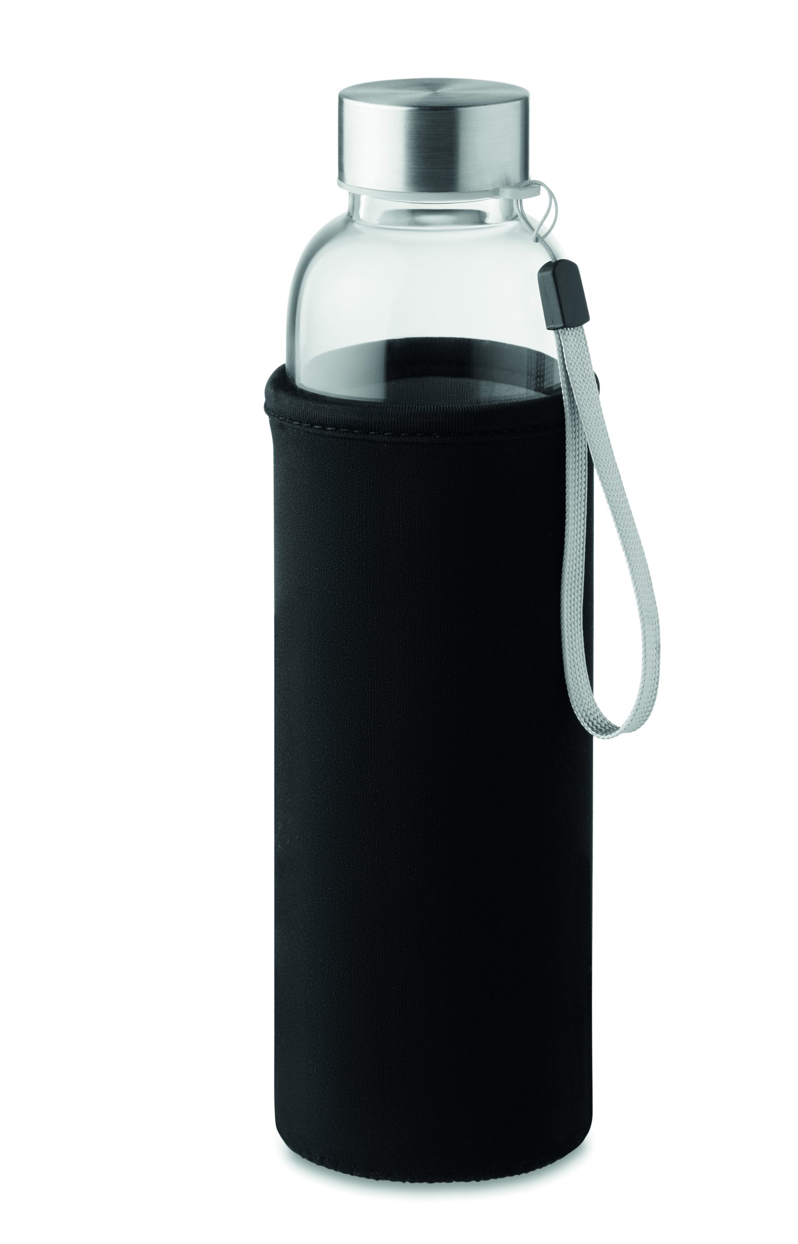 Wysokiej jakości szklana butelka ze szkła borokrzemianowego z zaparzaczem do herbaty i woreczkiem z neoprenu. Pojemność 500 ml. Nie nadaje się do napojów gazowanych. Szczelna. Grawerowanie laserowe nie jest możliwe na szkle borokrzemowym.