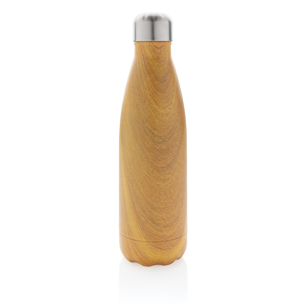 Butelka termiczna 500 ml z nadrukiem drewna, podwójne ścianki ze stali nierdzewnej z próżnią pomiędzy, utrzymuje temperaturę napojów gorących do 20 godzin oraz zimnych do 15 godzin