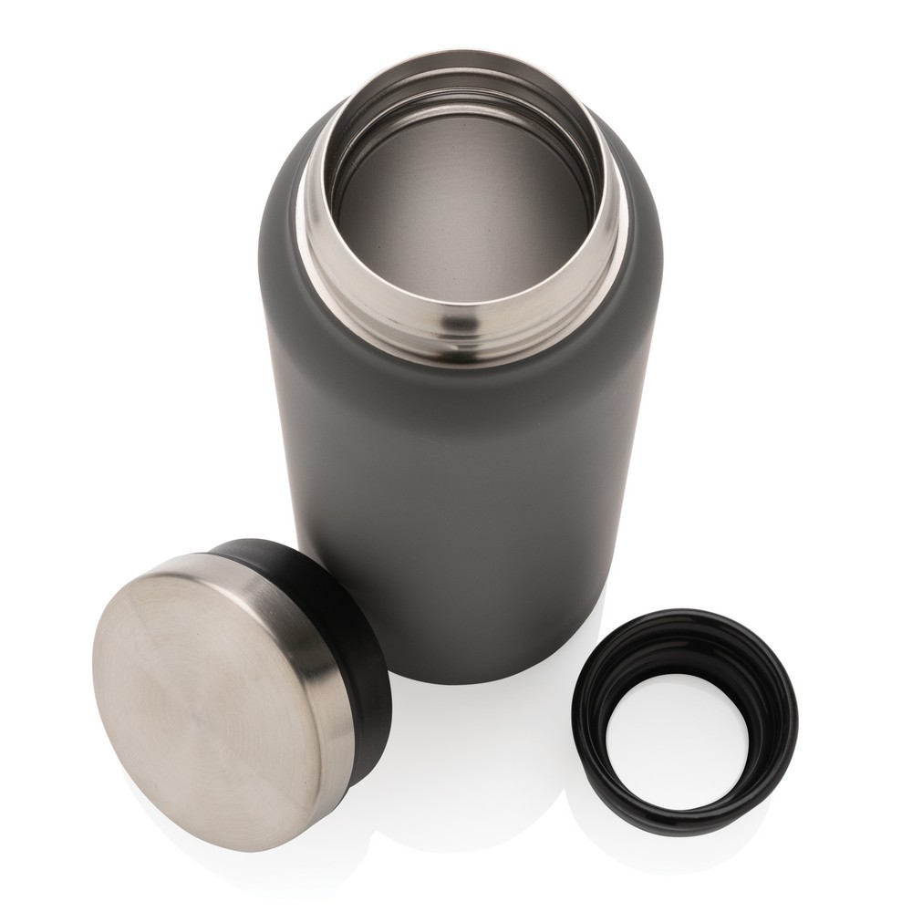 Butelka termiczna 600 ml, podwójne ścianki z próżnią pomiędzy, szczelna, szeroki otwór ułatwiający mycie i napełnianie, wykonana ze stali nierdzewnej z recyklingu z certyfikatem RSC (Recycled Claim Standard) który gwarantuje, że wykorzystane materiały pochodzą z recyklingu, całkowita zawartość materiału z recyklingu obliczona w oparciu o wagę całkowitą przedmiotu: 81%, w pudełku z papieru kraftowego z certyfikatem FSC® (Forest Stewardship Council), utrzymuje temperaturę napojów gorących do 20 godzin oraz zimnych do 15 godzin