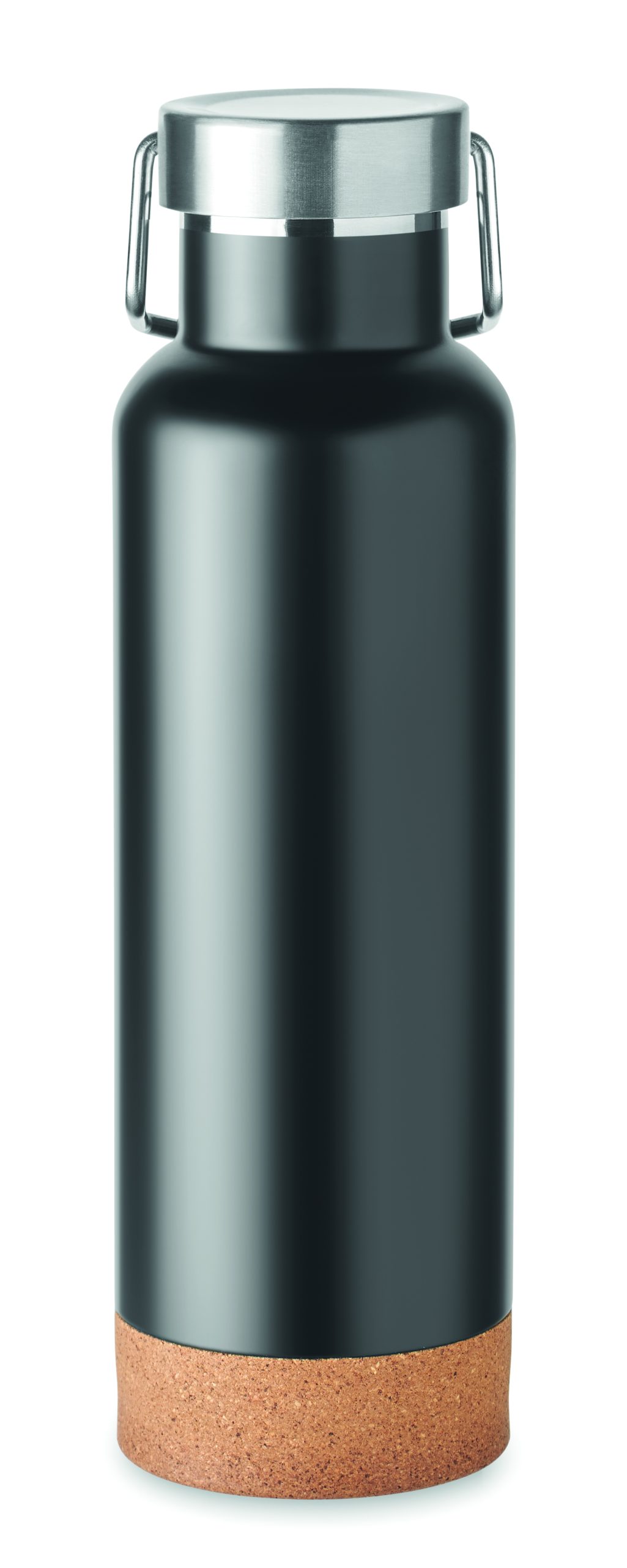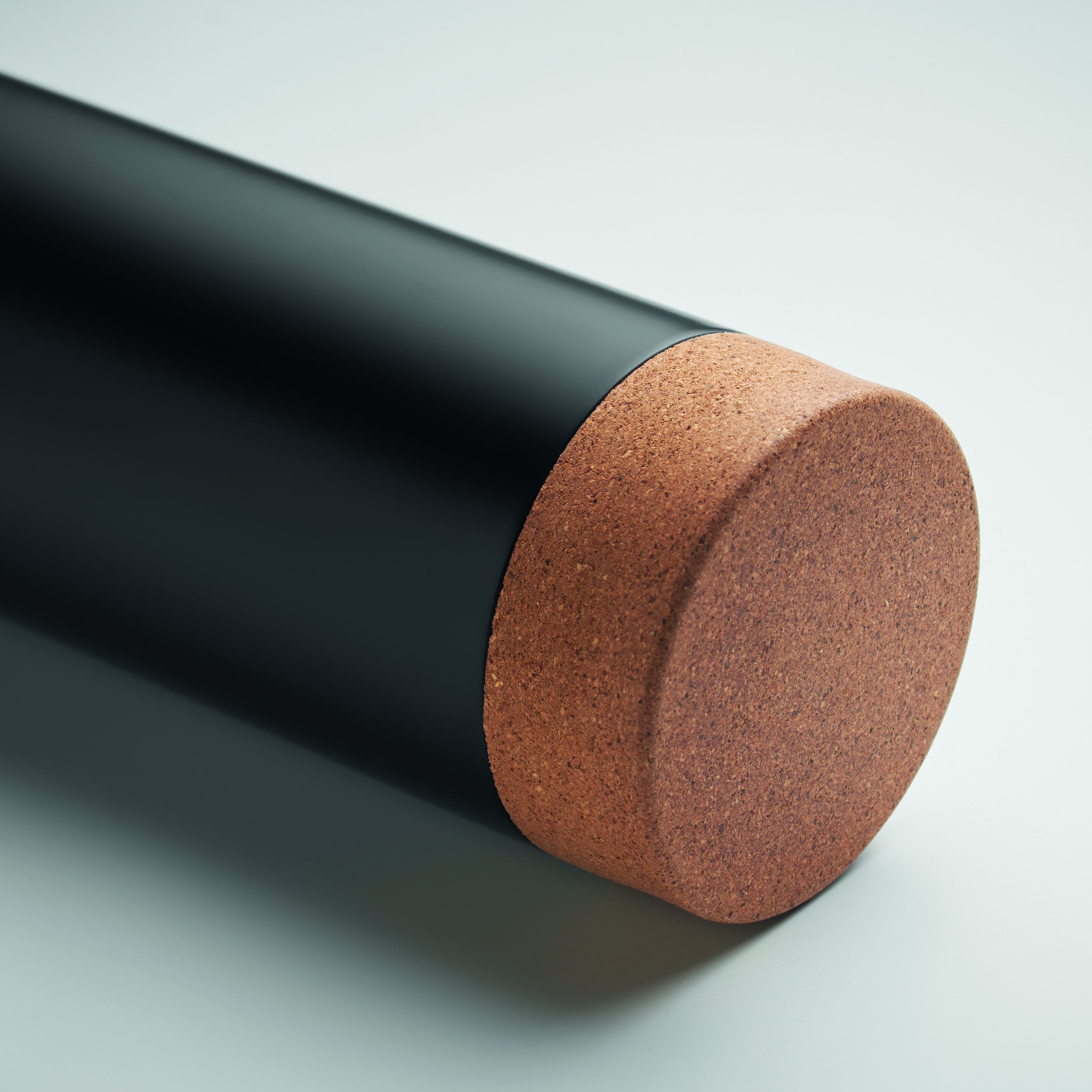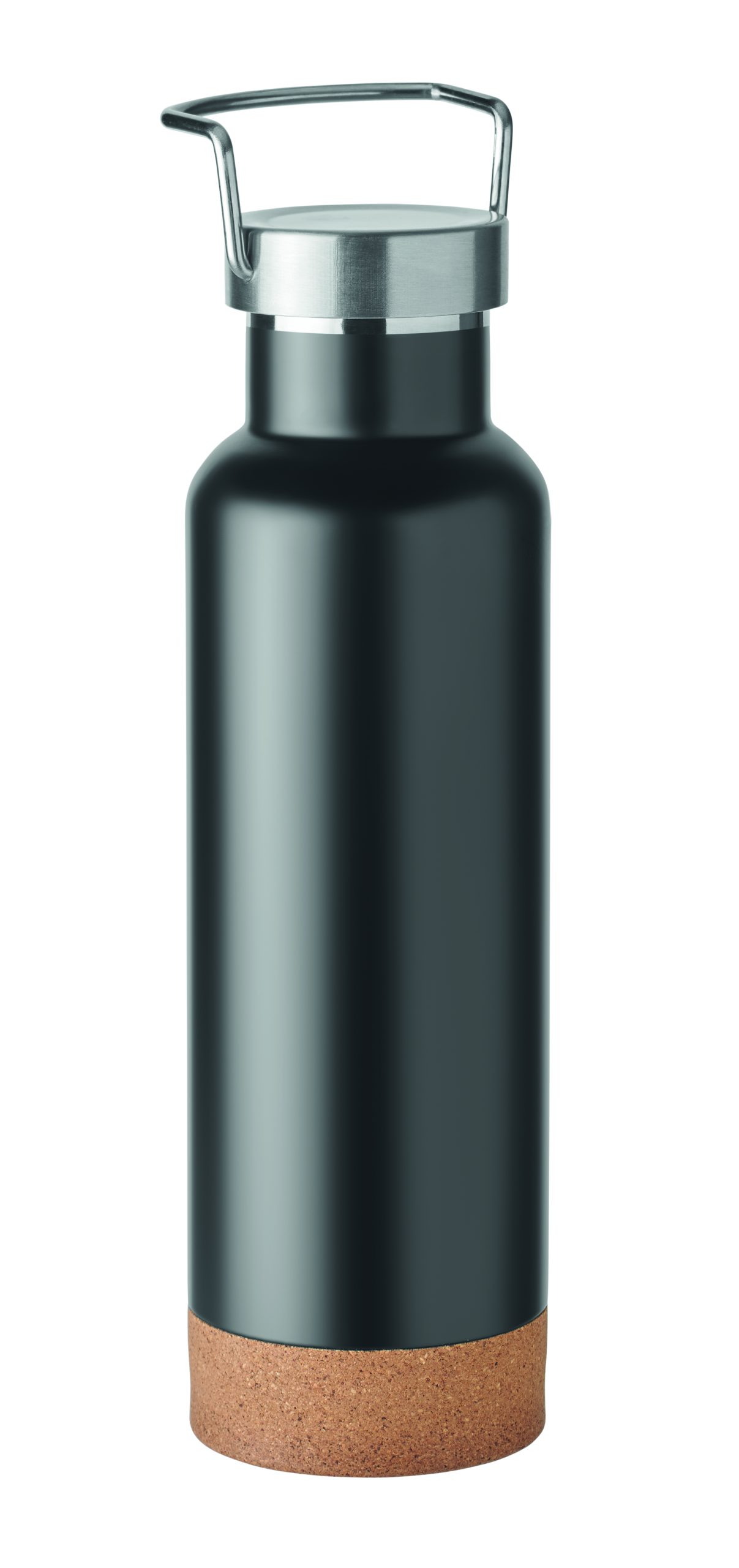 Dwuścienna, izolowana próżniowo butelka z recyklingowanej stali nierdzewnej z pokrywką z uchwytem i korkową podstawą. Nie przecieka. Pojemność: 500 ml. (90% stali nierdzewnej z recyklingu i 10% stali nierdzewnej).