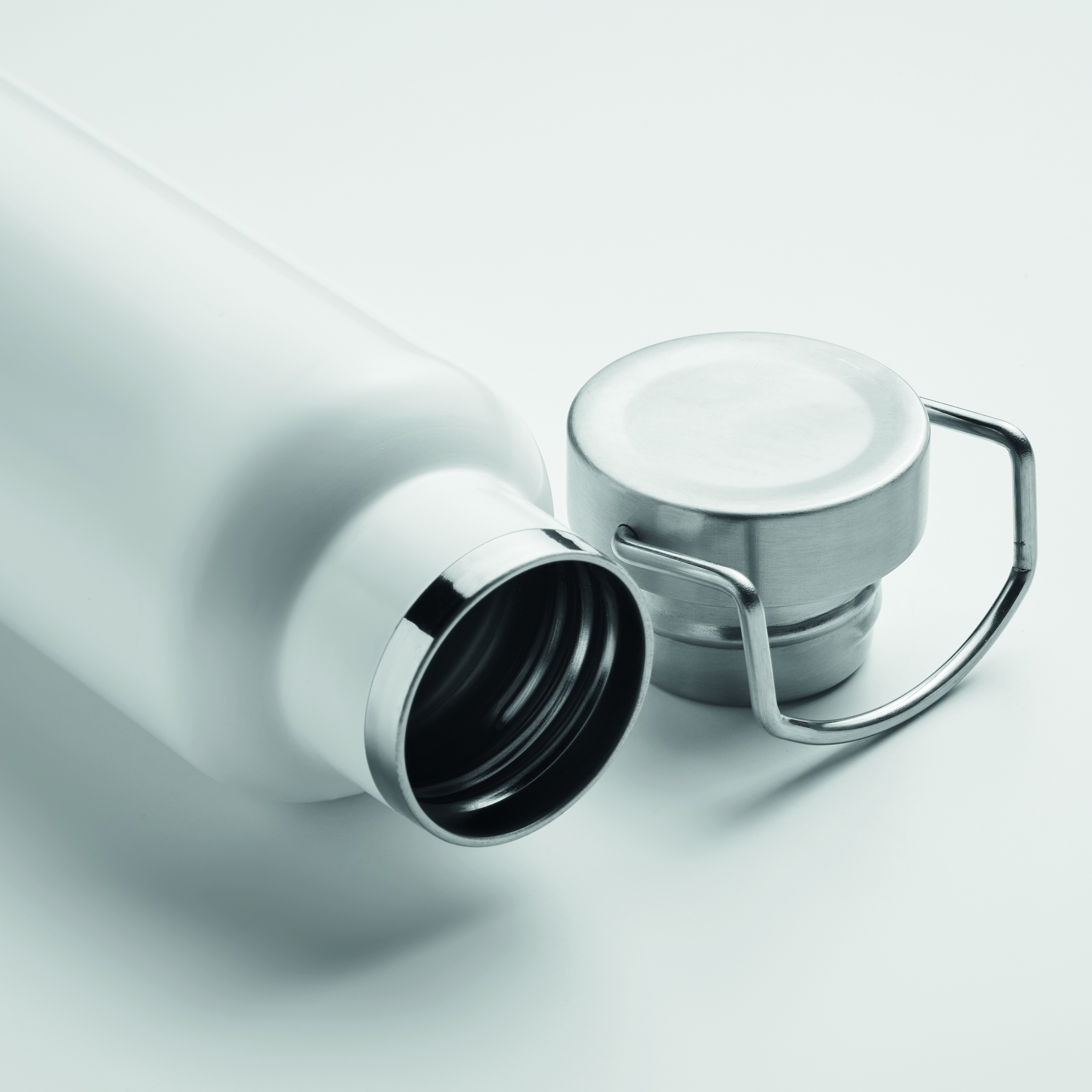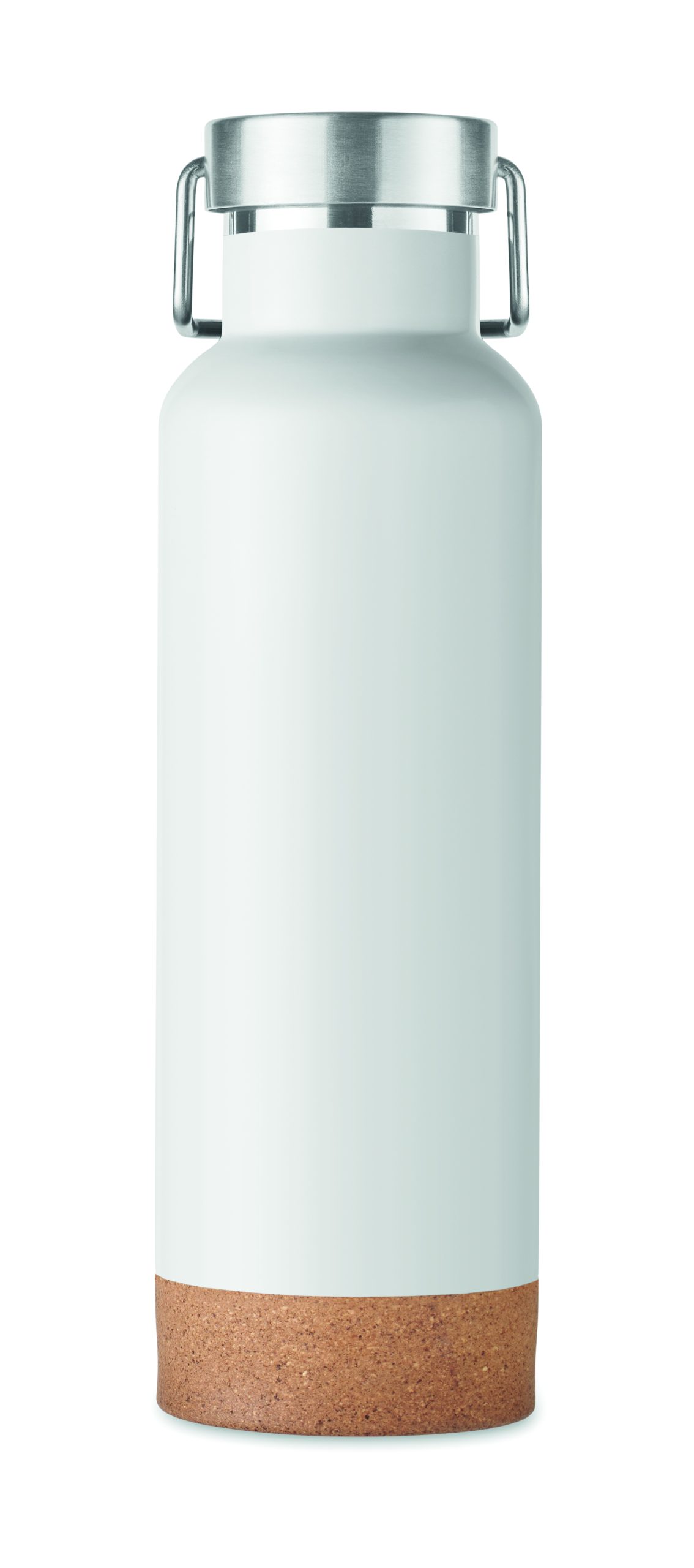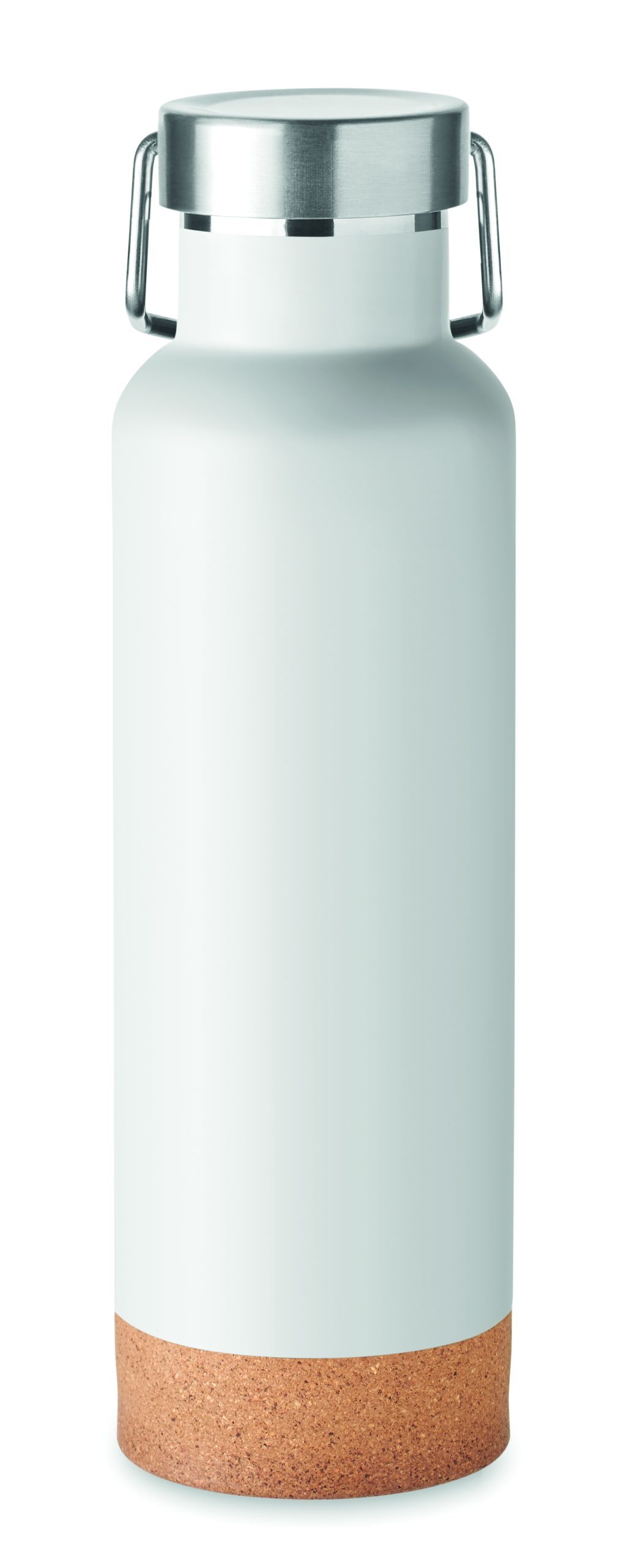Dwuścienna, izolowana próżniowo butelka z recyklingowanej stali nierdzewnej z pokrywką z uchwytem i korkową podstawą. Nie przecieka. Pojemność: 500 ml. (90% stali nierdzewnej z recyklingu i 10% stali nierdzewnej).