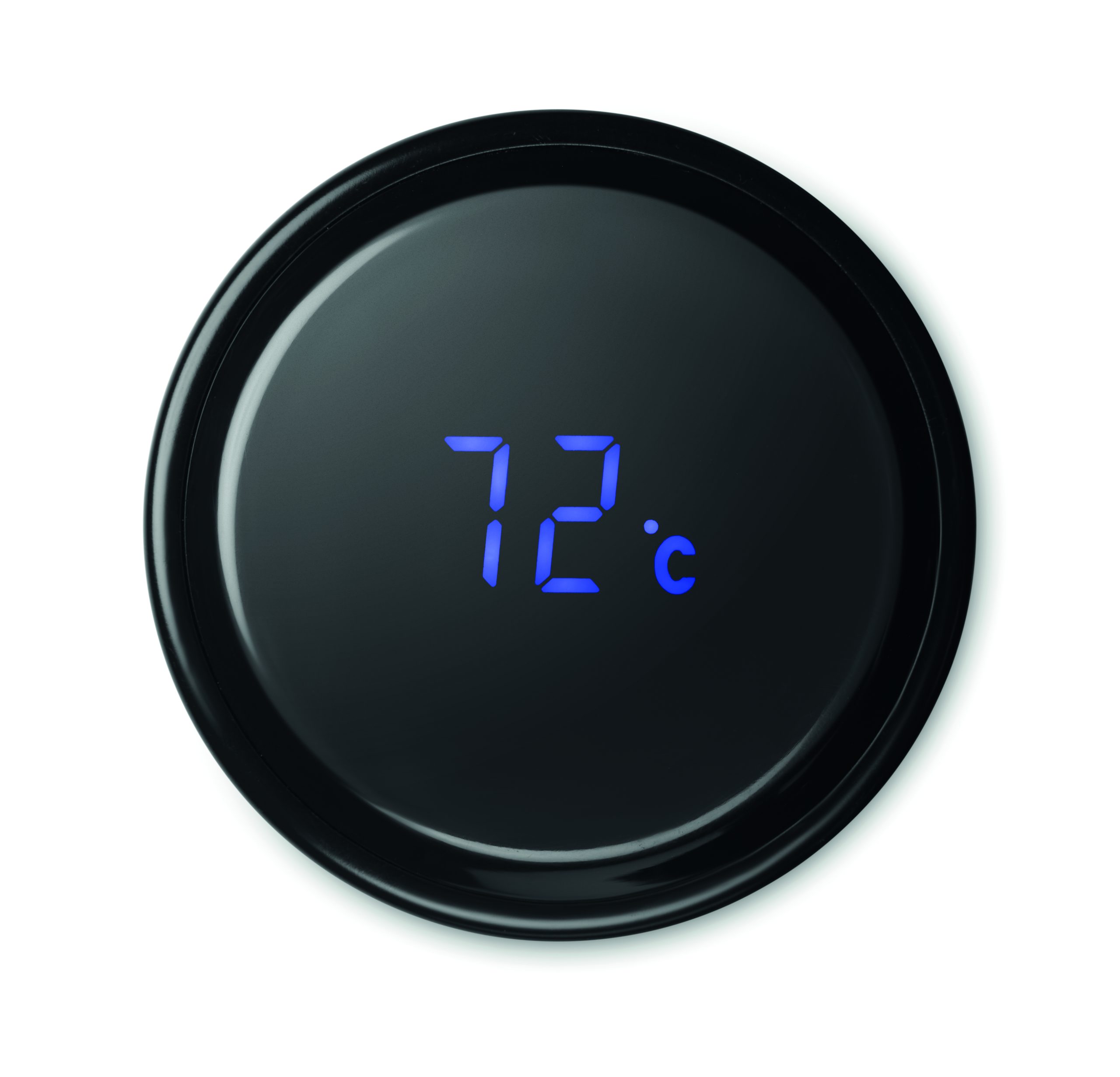 Butelka ze stali nierdzewnej, posiada podwójne ścianki z izolacyjną komorą próżniową. Wbudowany dotykowy termometr LED na pokrywie i zaparzacz do herbaty.Zawiera 1 wymienną bateria CR2032. Szczelna. Poj. 450 ml. Szczelna.