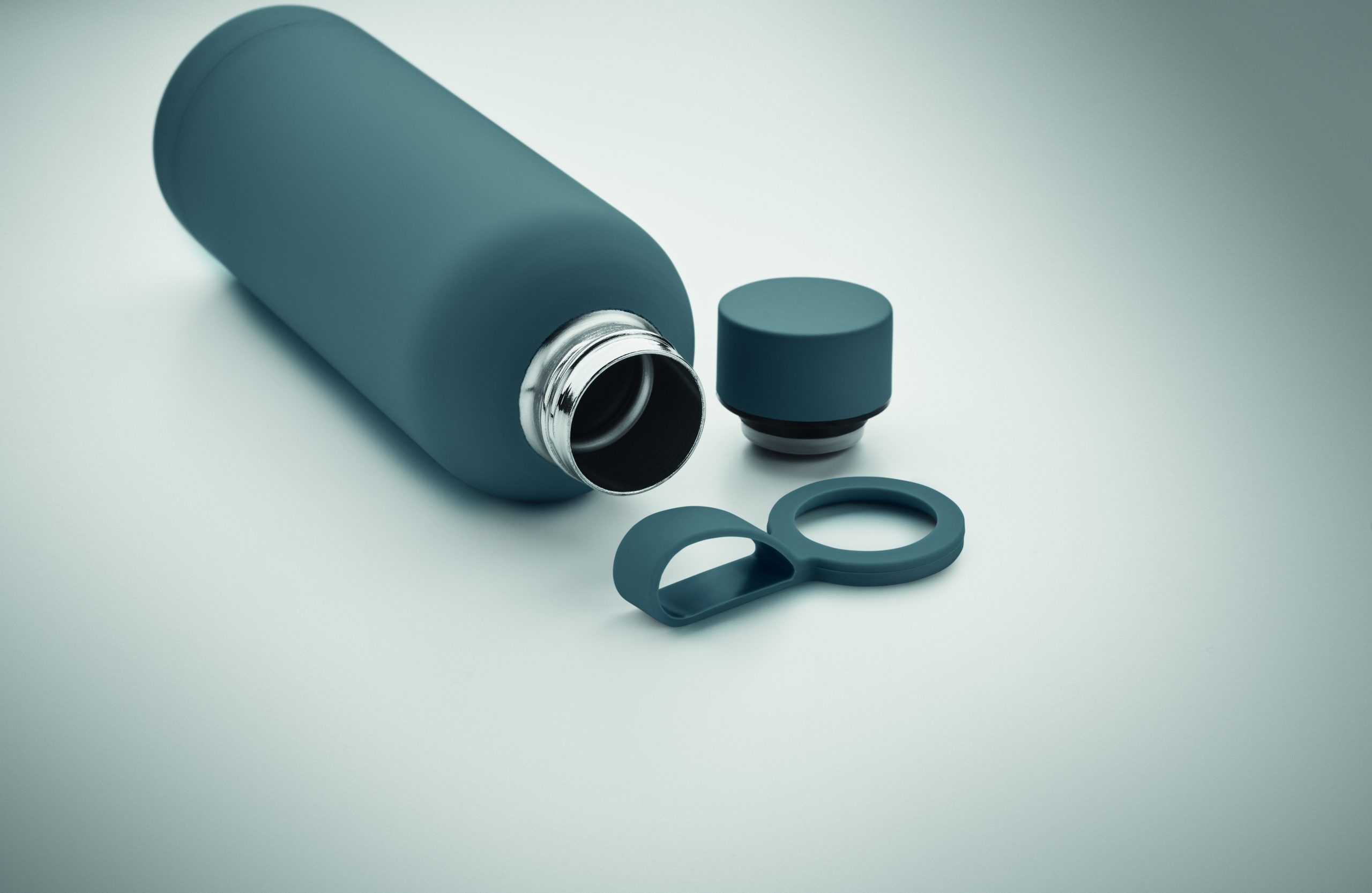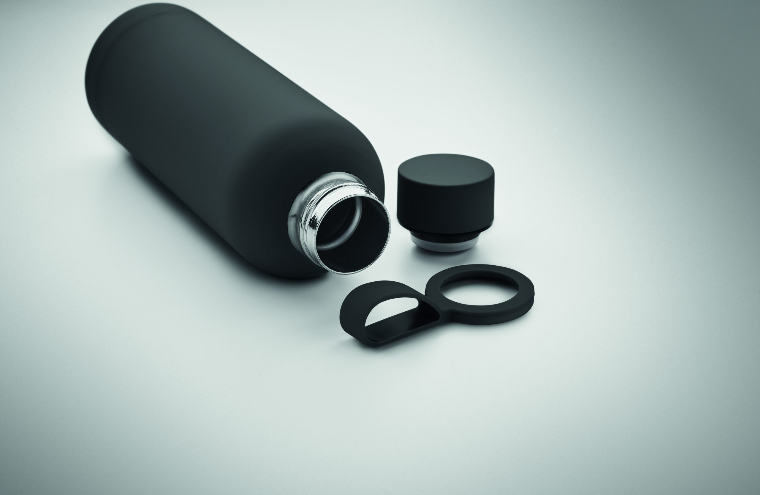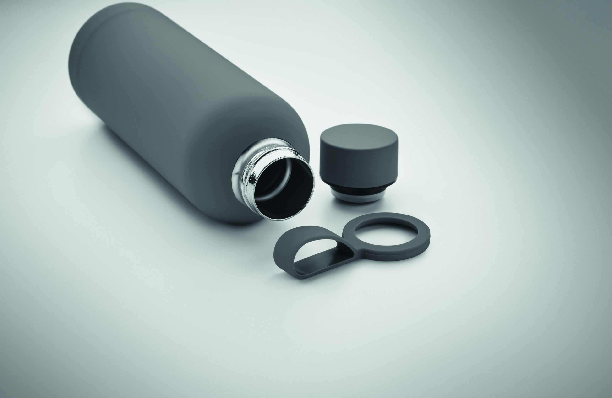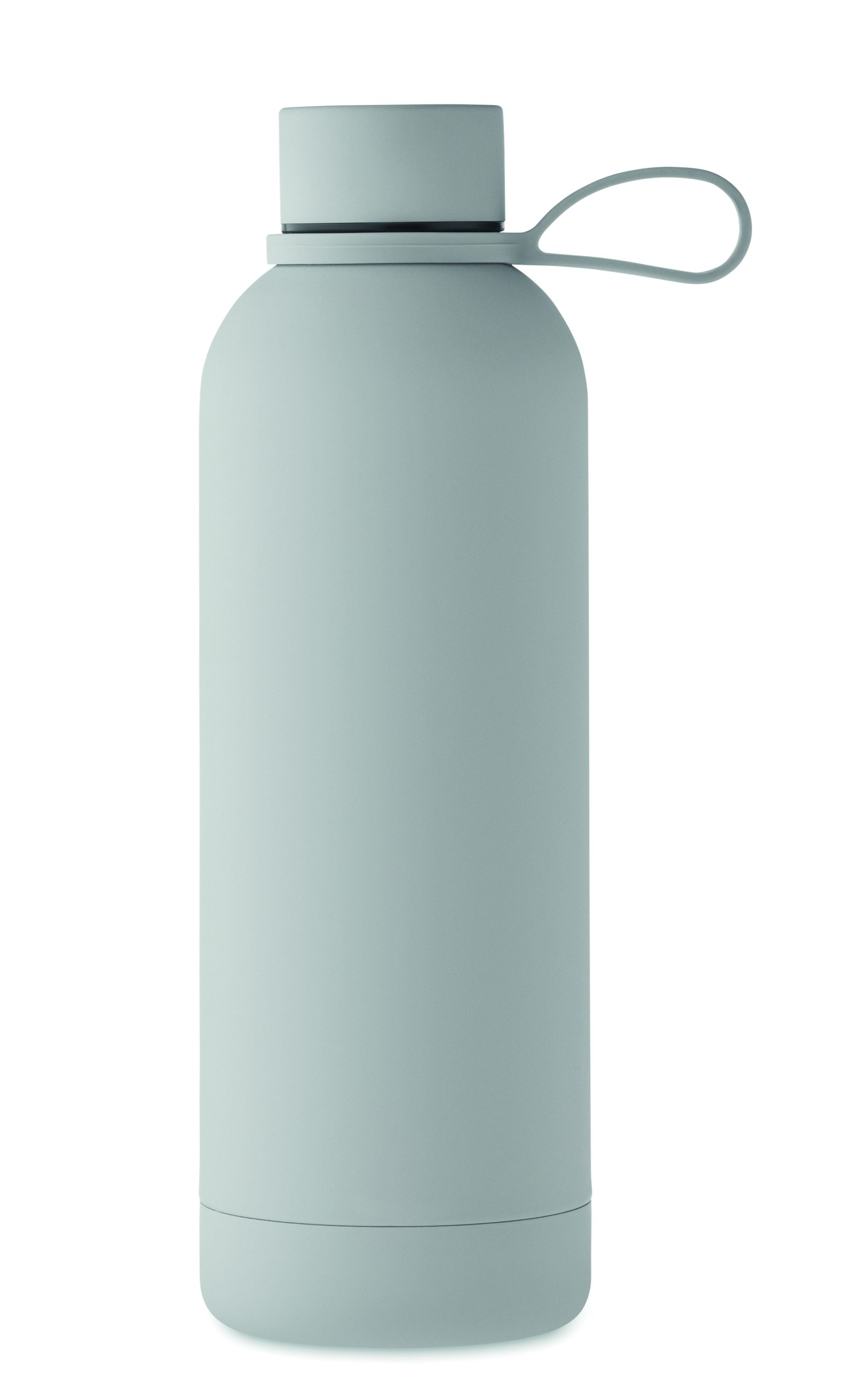 Dwuścienna butelka z izolacją próżniową z recyklingowanej stali nierdzewnej (90% z recyklingowanej stali nierdzewnej i 10% ze stali nierdzewnej) z gumowym wykończeniem i silikonowym uchwytem. Pojemność: 500 ml.