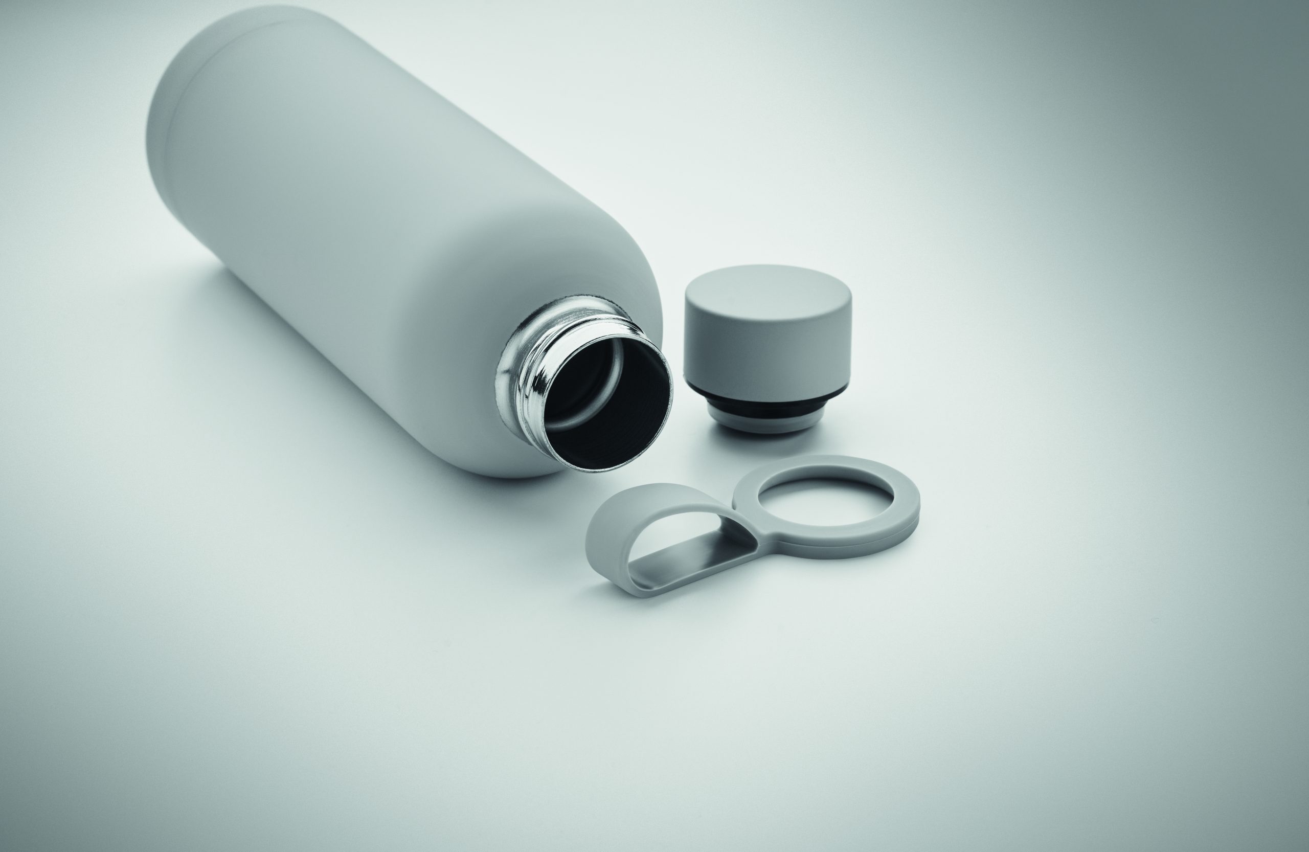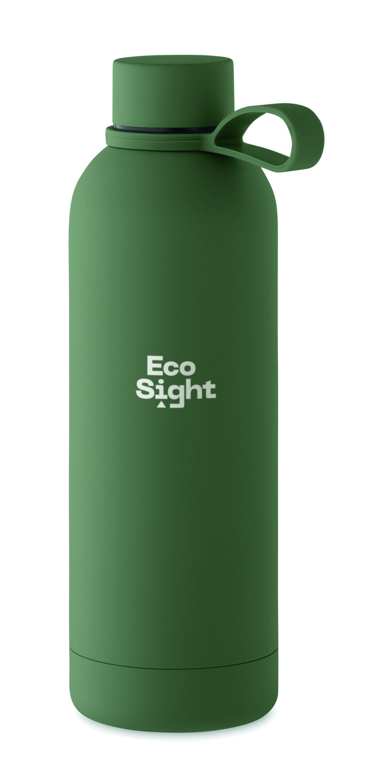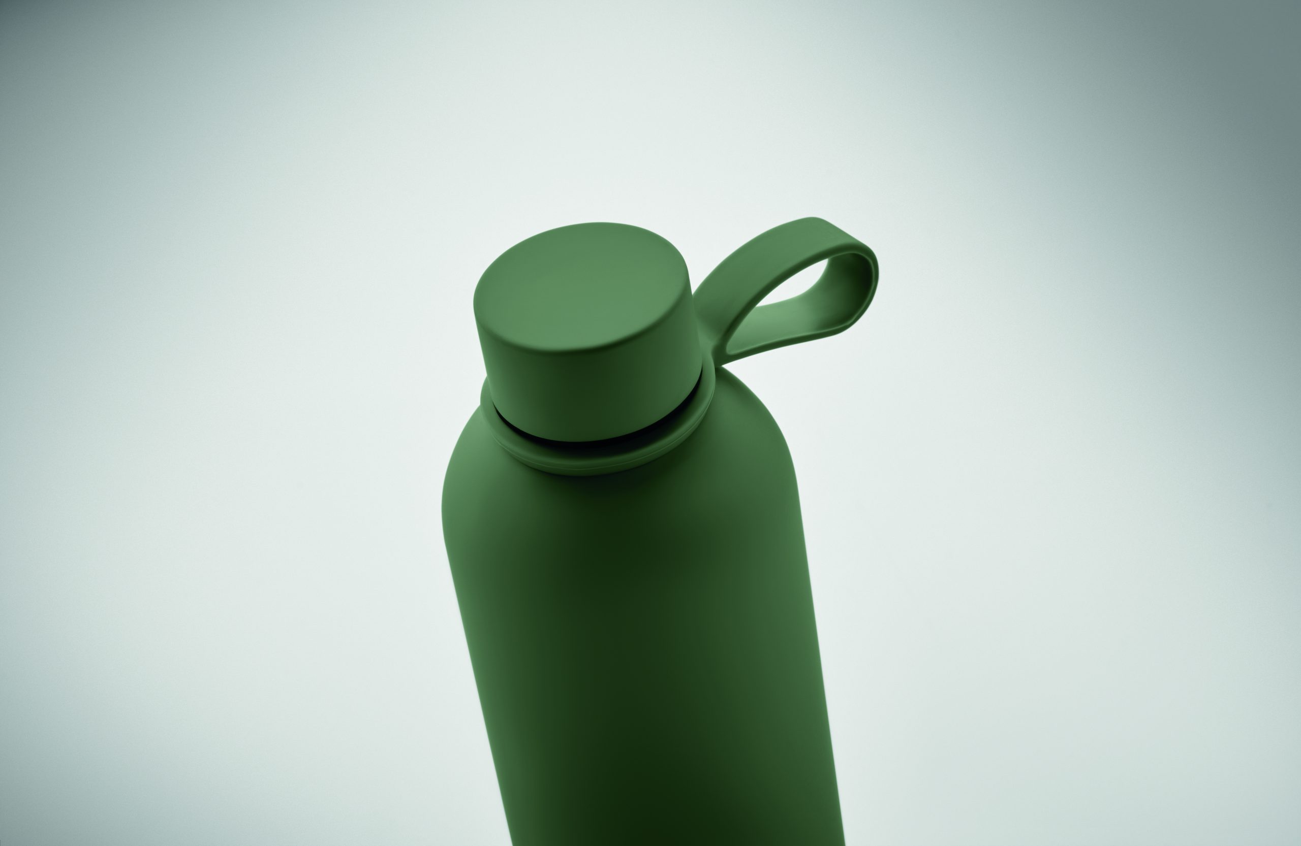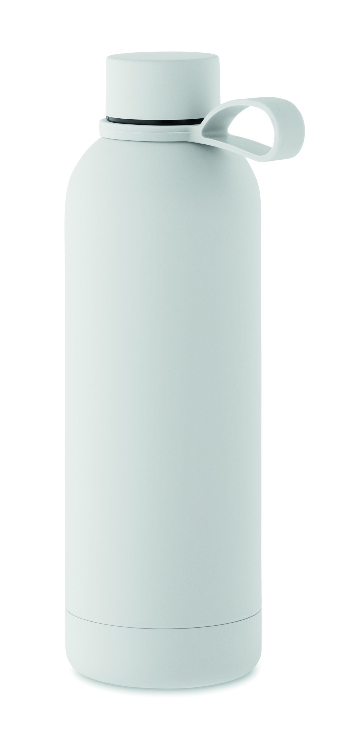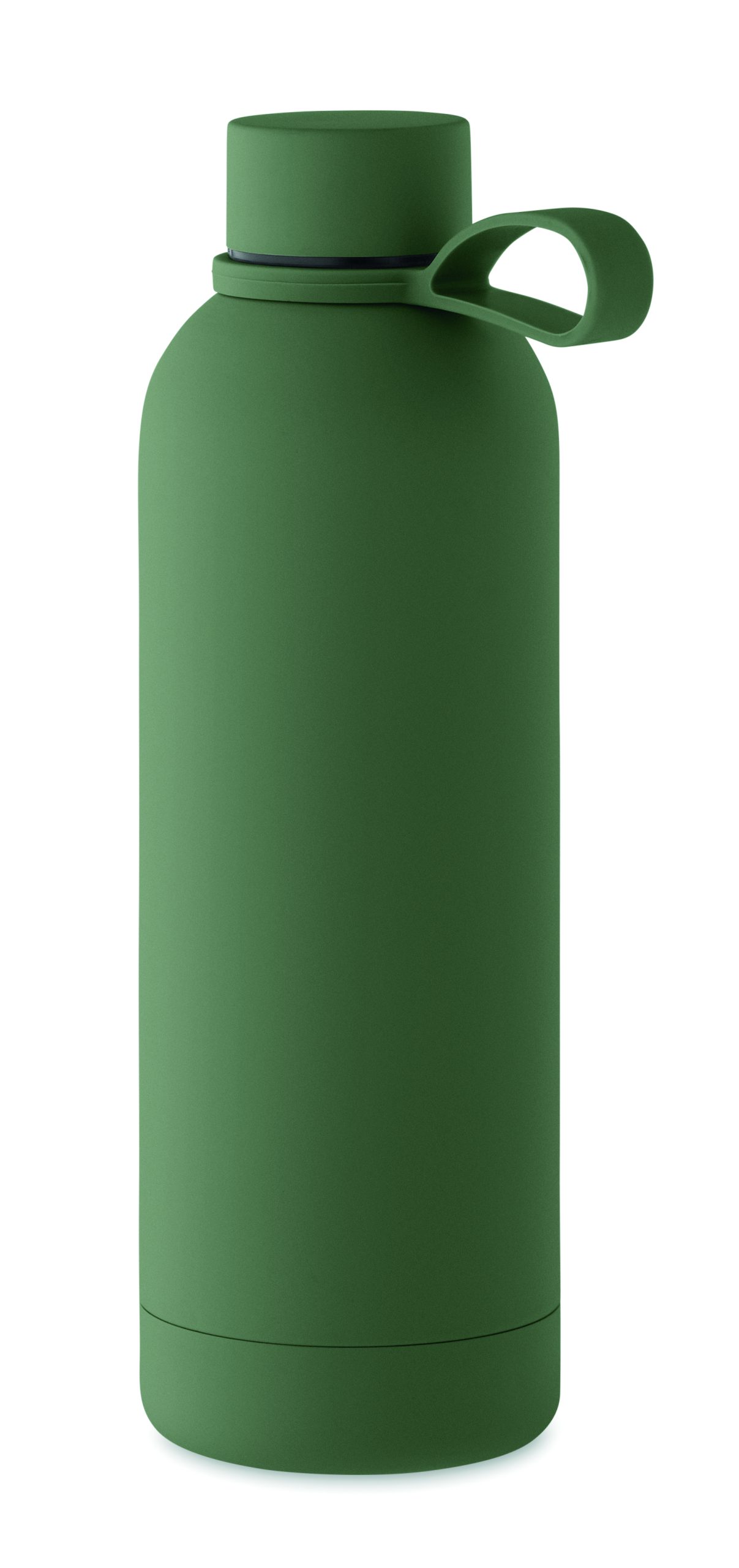 Dwuścienna butelka z izolacją próżniową z recyklingowanej stali nierdzewnej (90% z recyklingowanej stali nierdzewnej i 10% ze stali nierdzewnej) z gumowym wykończeniem i silikonowym uchwytem. Pojemność: 500 ml.