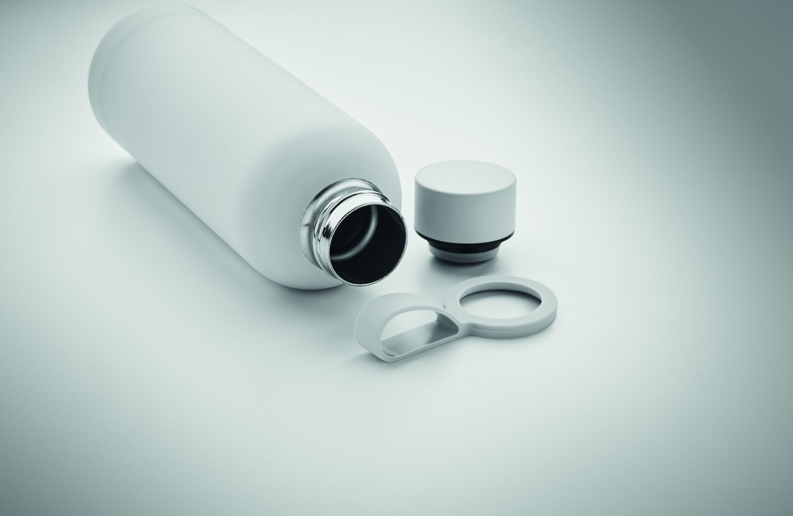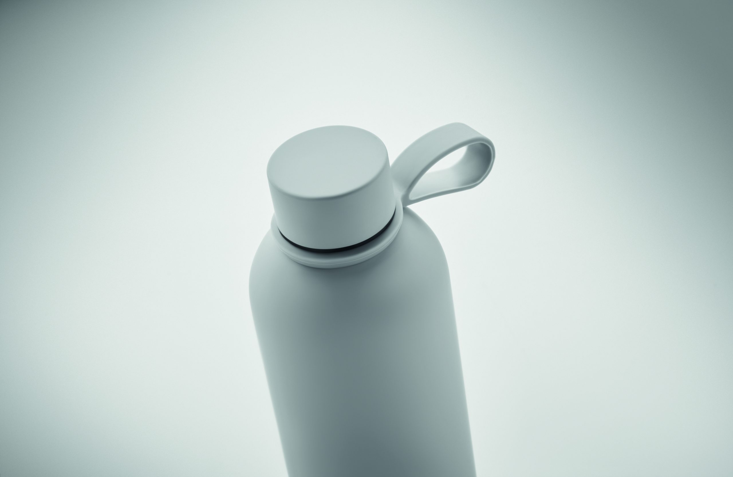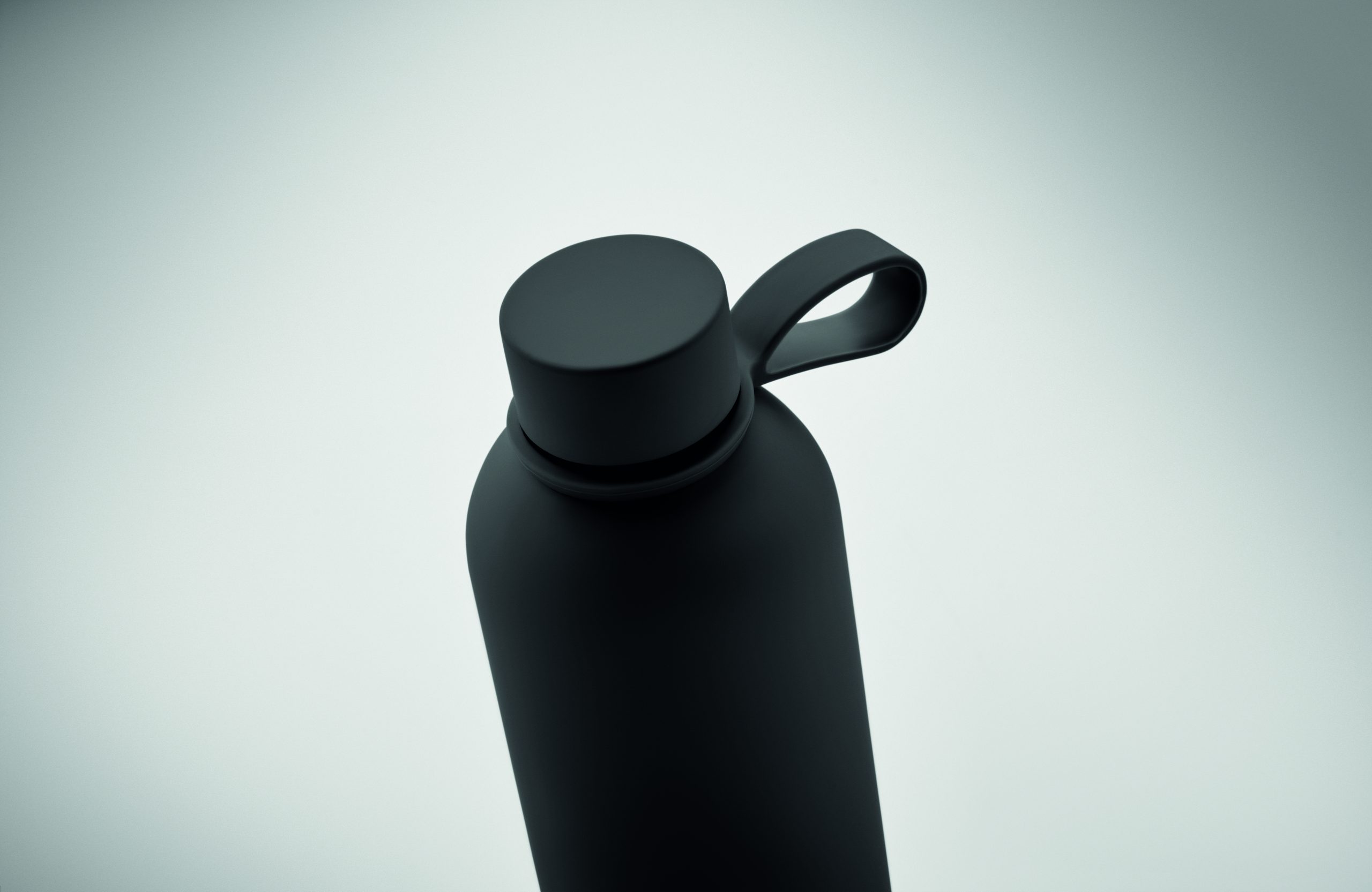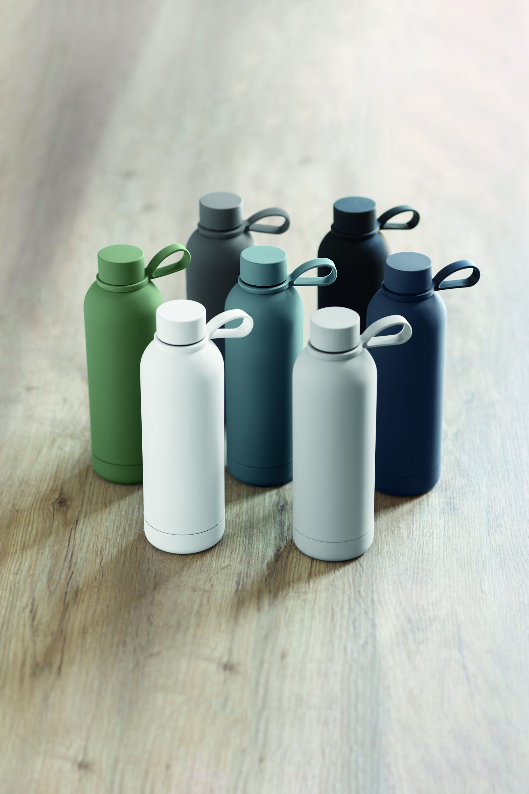 Dwuścienna butelka z izolacją próżniową z recyklingowanej stali nierdzewnej (90% z recyklingowanej stali nierdzewnej i 10% ze stali nierdzewnej) z gumowym wykończeniem i silikonowym uchwytem. Pojemność: 500 ml.