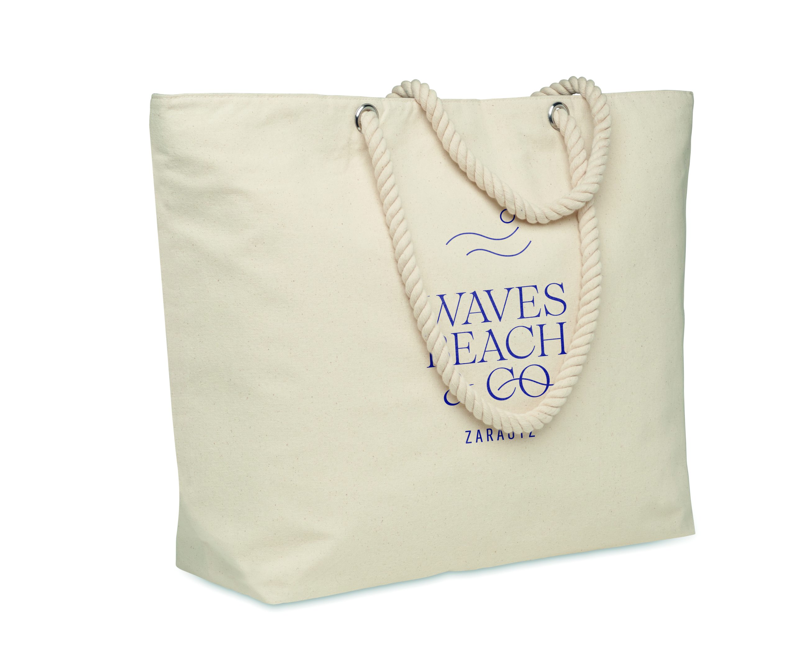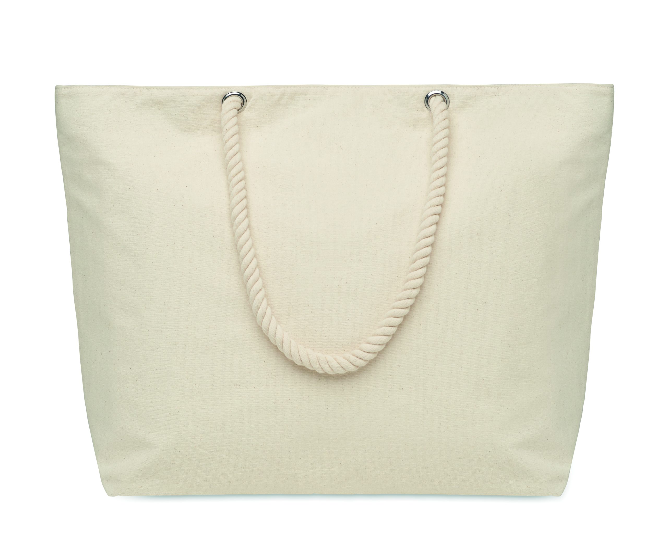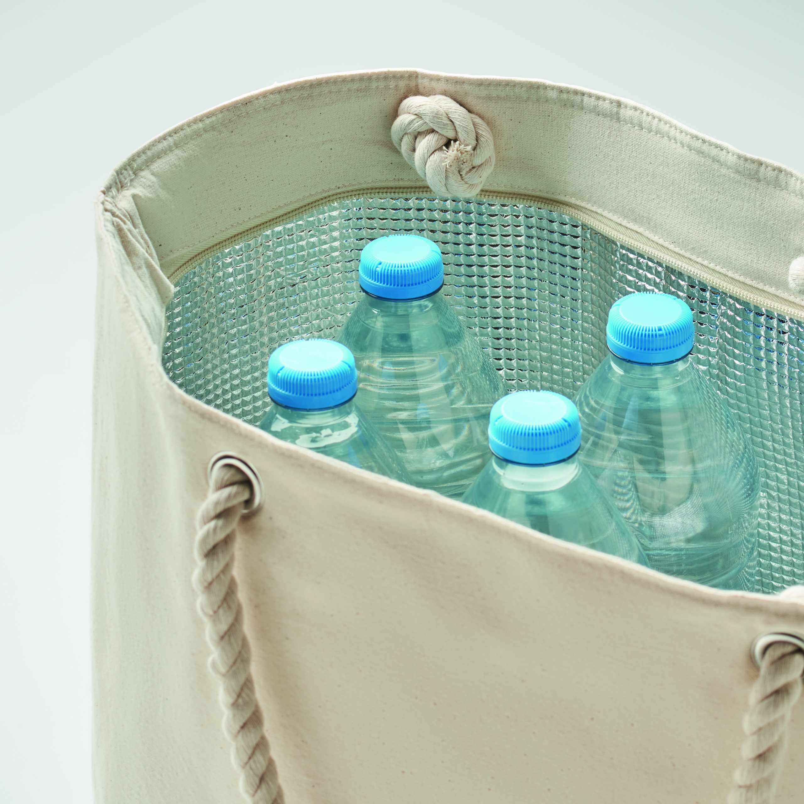 Zapinana na zamek chłodząca bawełniana torba plażowa z uchwytem sznurkowym. 220 gr/m². Izolacja z folii aluminiowej 2 mm.
