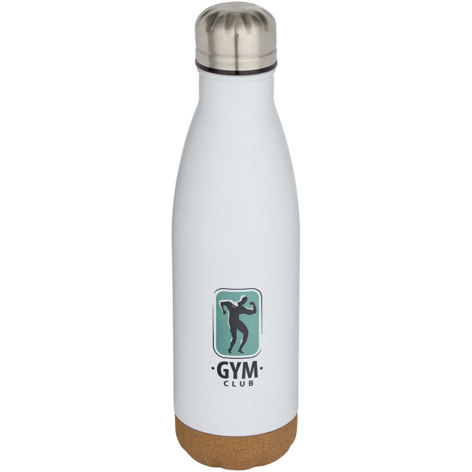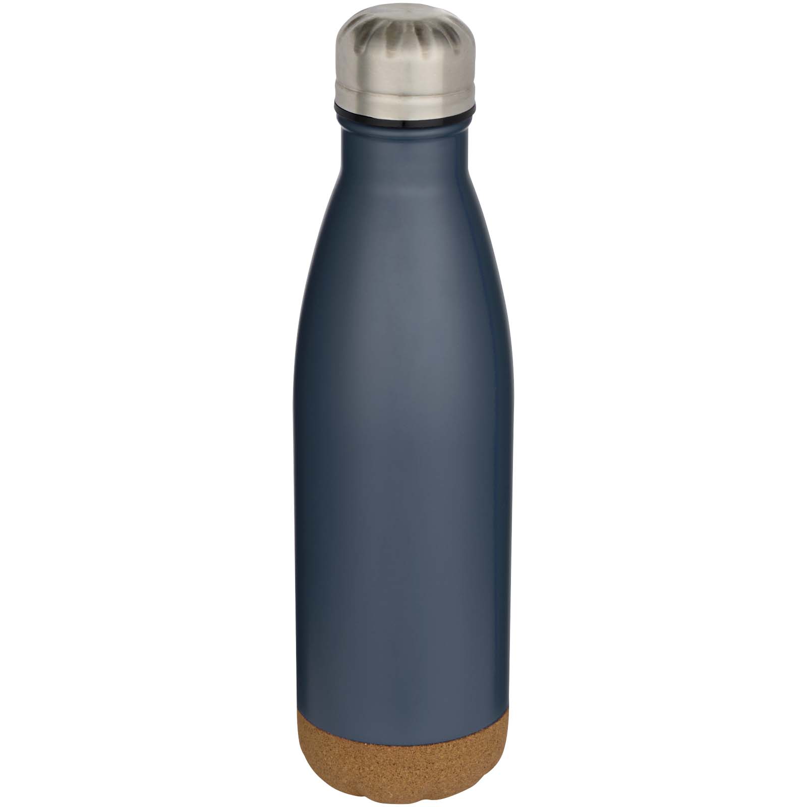 Butelka na wodę ze stali nierdzewnej, izolowana próżniowo, z detalami z korka na spodzie. Podwójna ścianka izolacyjna utrzymuje napoje ciepłe lub zimne przez kilka godzin. Zapakowana w pudełko upominkowe wykonane z kartonu z recyklingu. Pojemność: 500 ml.