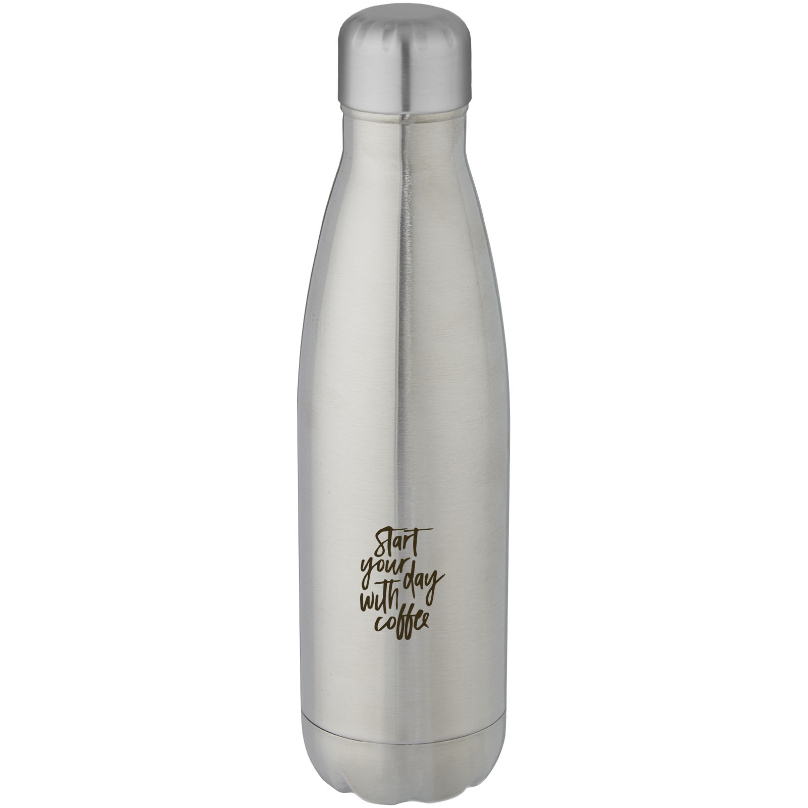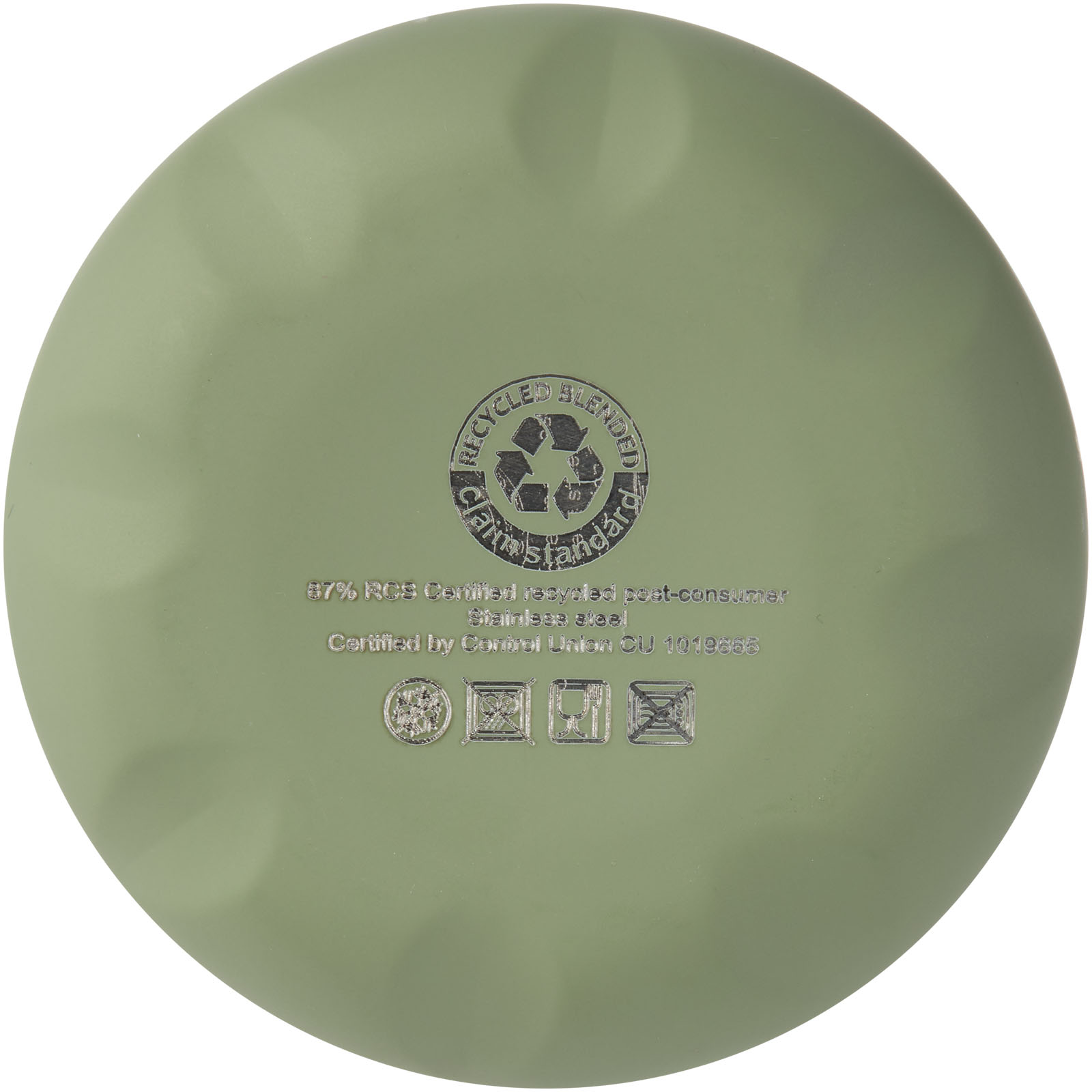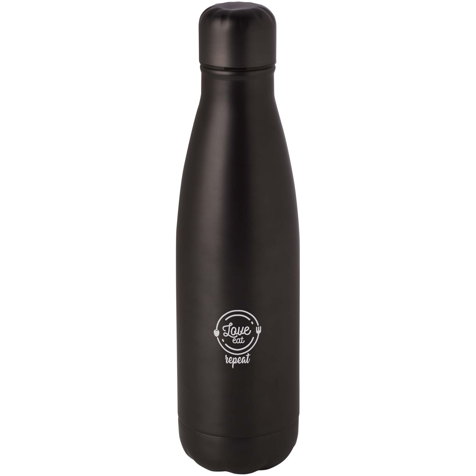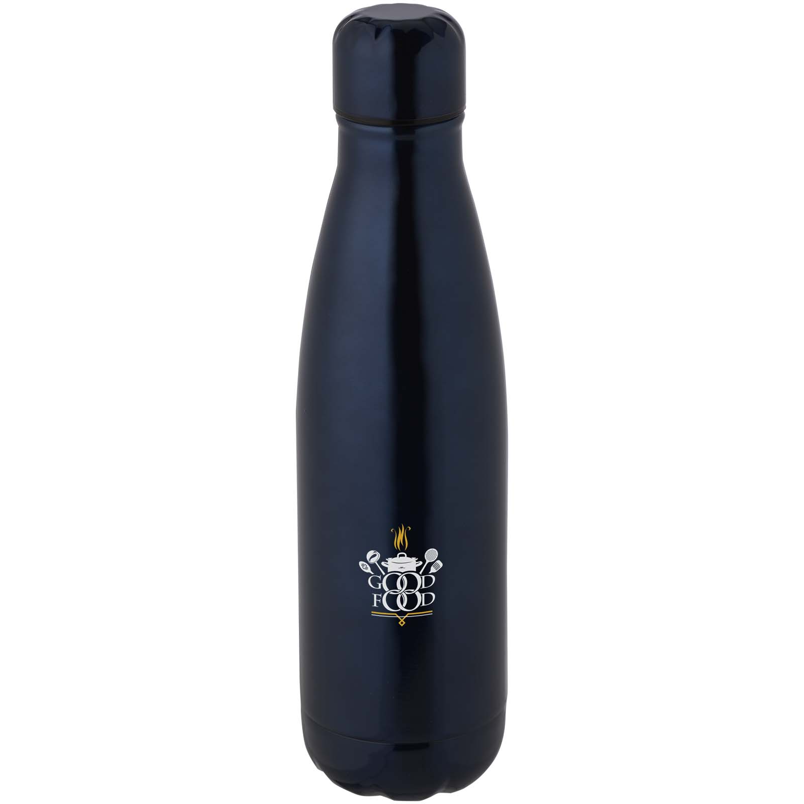 Charakterystycznie wyglądająca, izolowana próżniowo butelka ze stali nierdzewnej pochodzącej z recyklingu z certyfikatem RCS. Ta elegancko wyglądająca butelka na wodę z podstawą, która pasuje do większości uchwytów na kubki, idealnie nadaje się do promocji. Przetestowany i zatwierdzony zgodnie z niemieckimi przepisami dotyczącymi bezpieczeństwa żywności (LFGB), oraz poddany testom na zawartość ftalanów zgodnie z przepisami REACH. Pojemność 500 ml. Zapakowana w pudełko upominkowe wykonane z kartonu z recyklingu. Utrzymuje temperaturę napojów przez 12 godzin, a zimno przez 24 godziny.