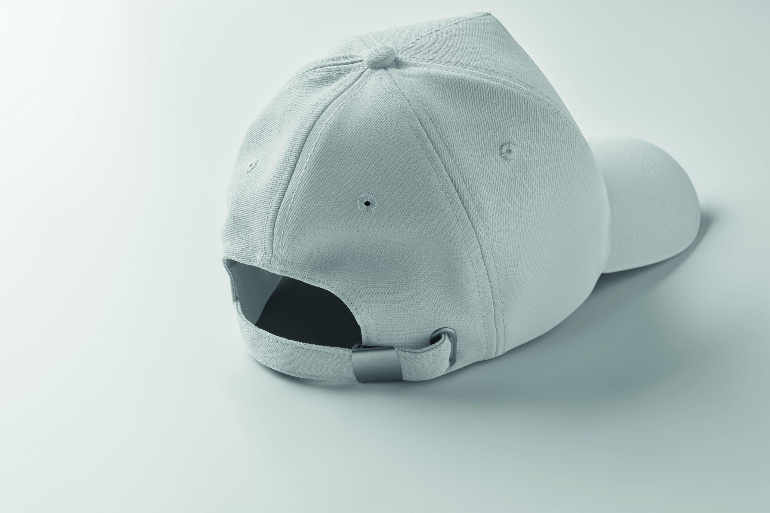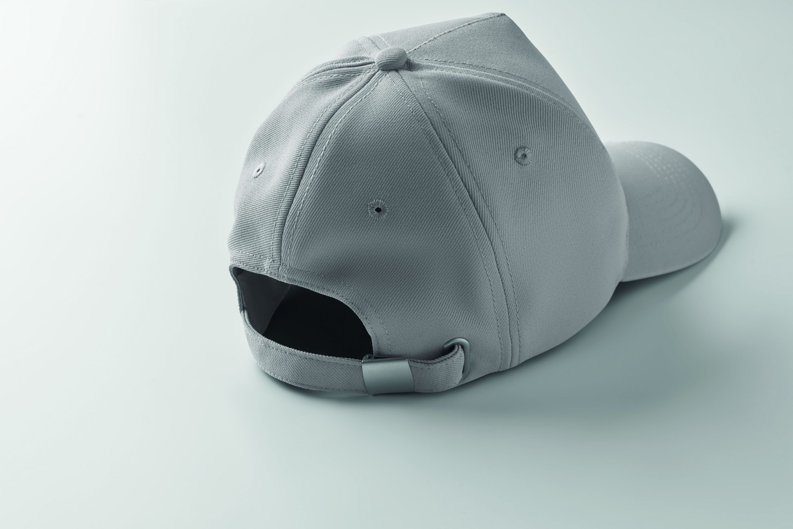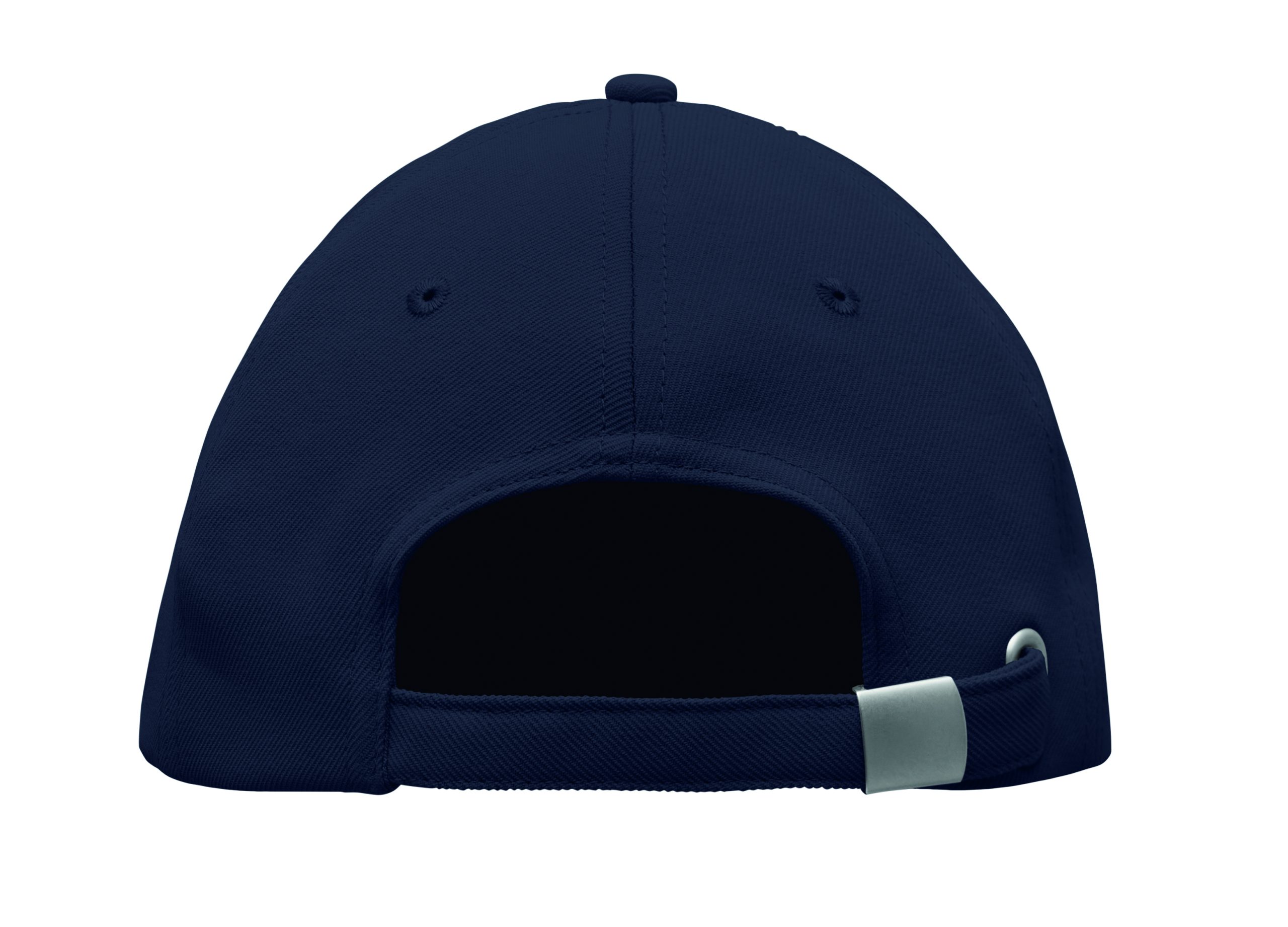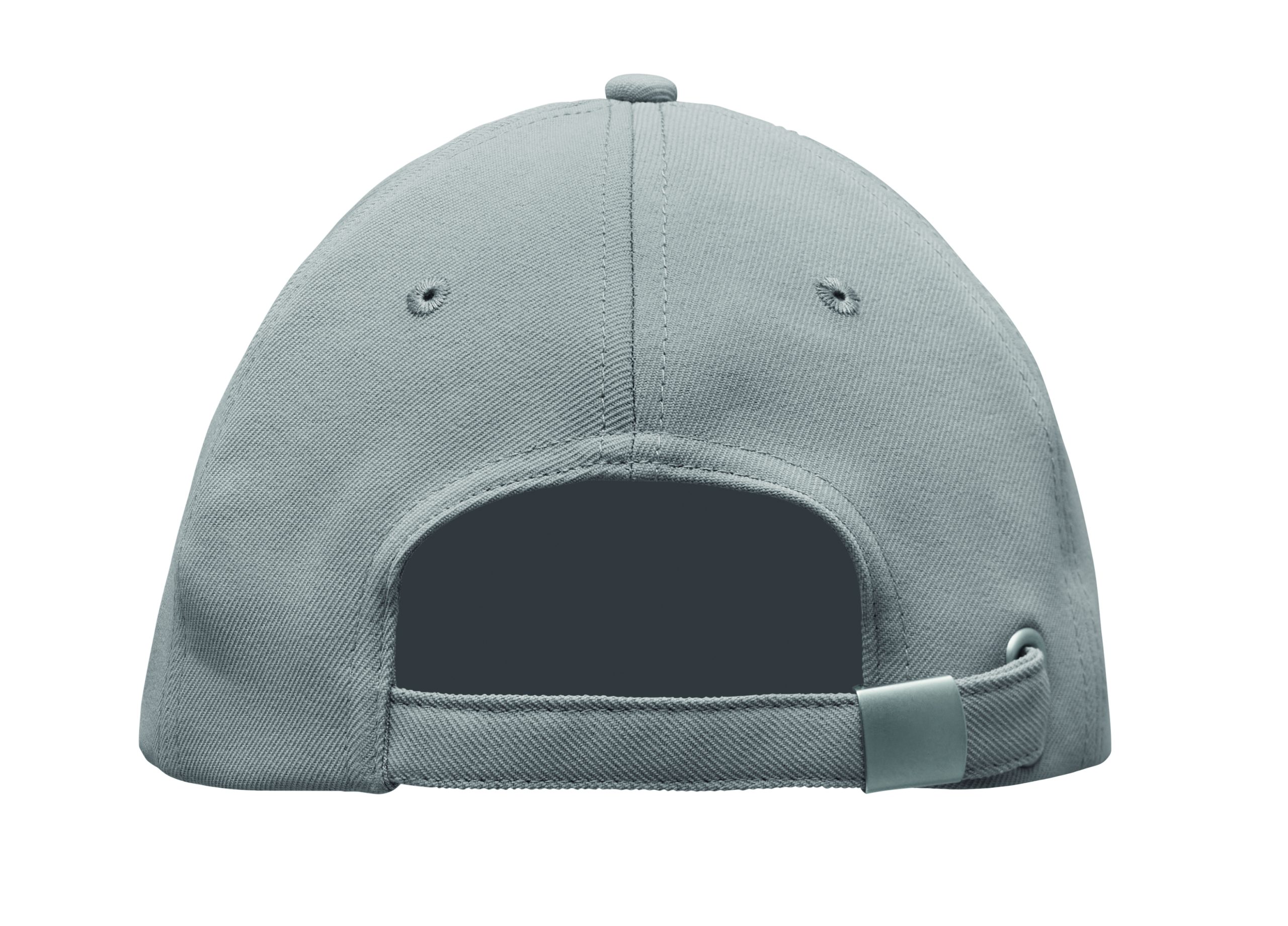 Czapka z daszkiem z 5 paneli z poliestru RPET 210 gm/m2 ze srebrną stalową sprzączką. 4 haftowane oczka w dopasowanym kolorze. Rozmiar 7 1/4.