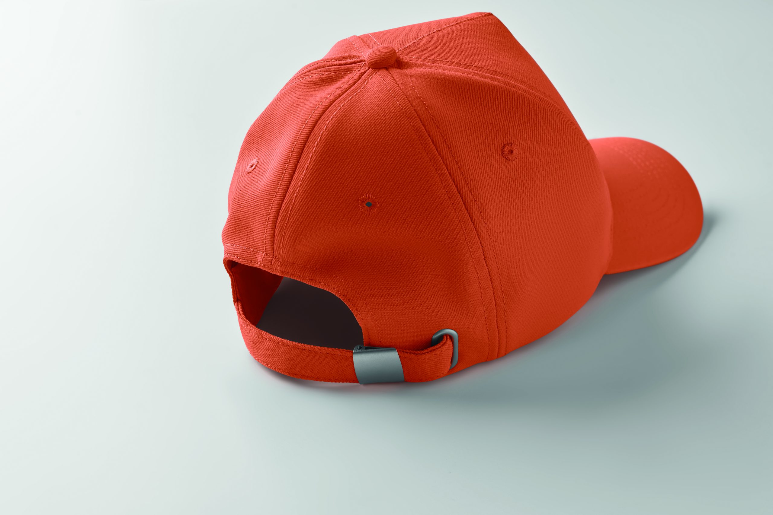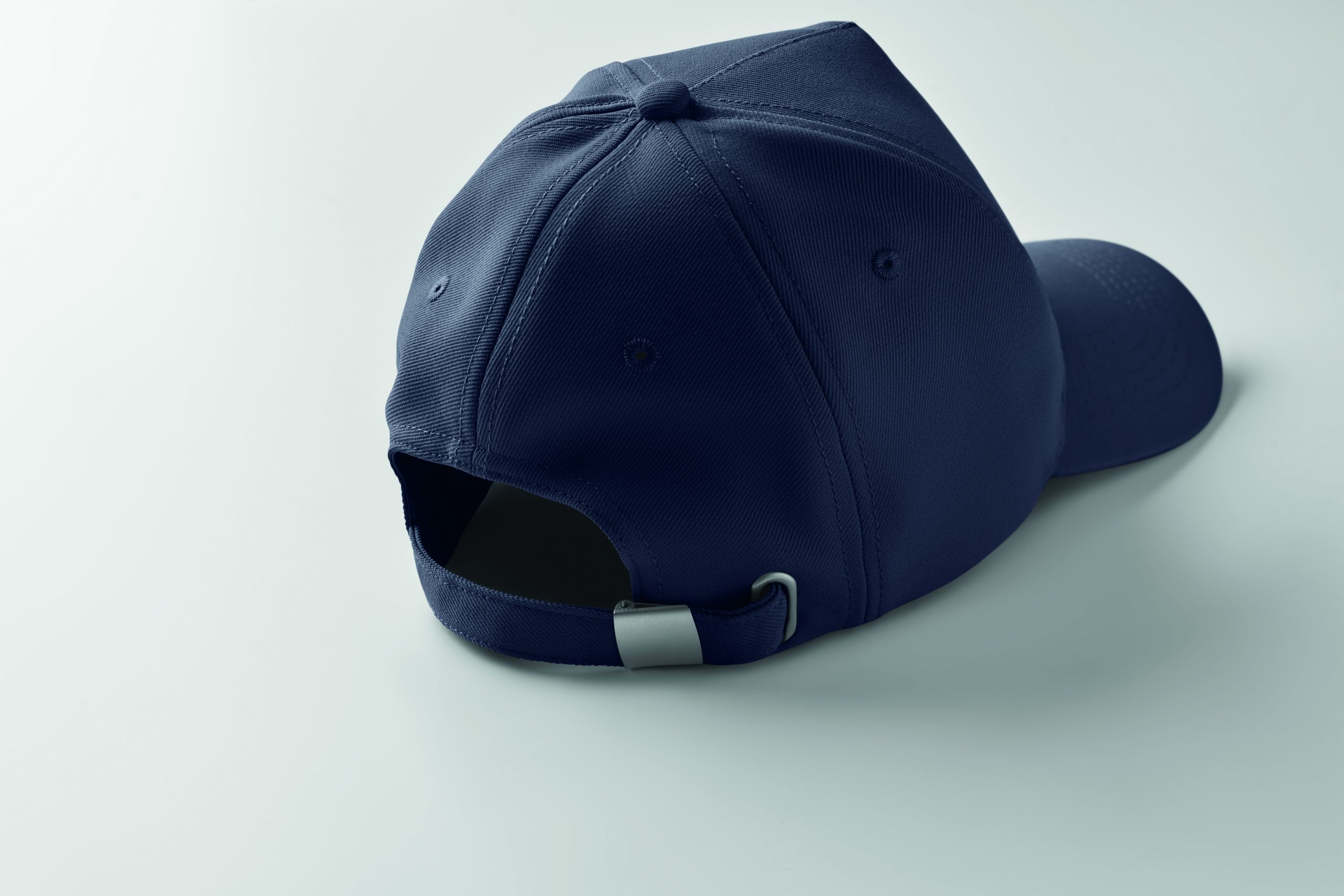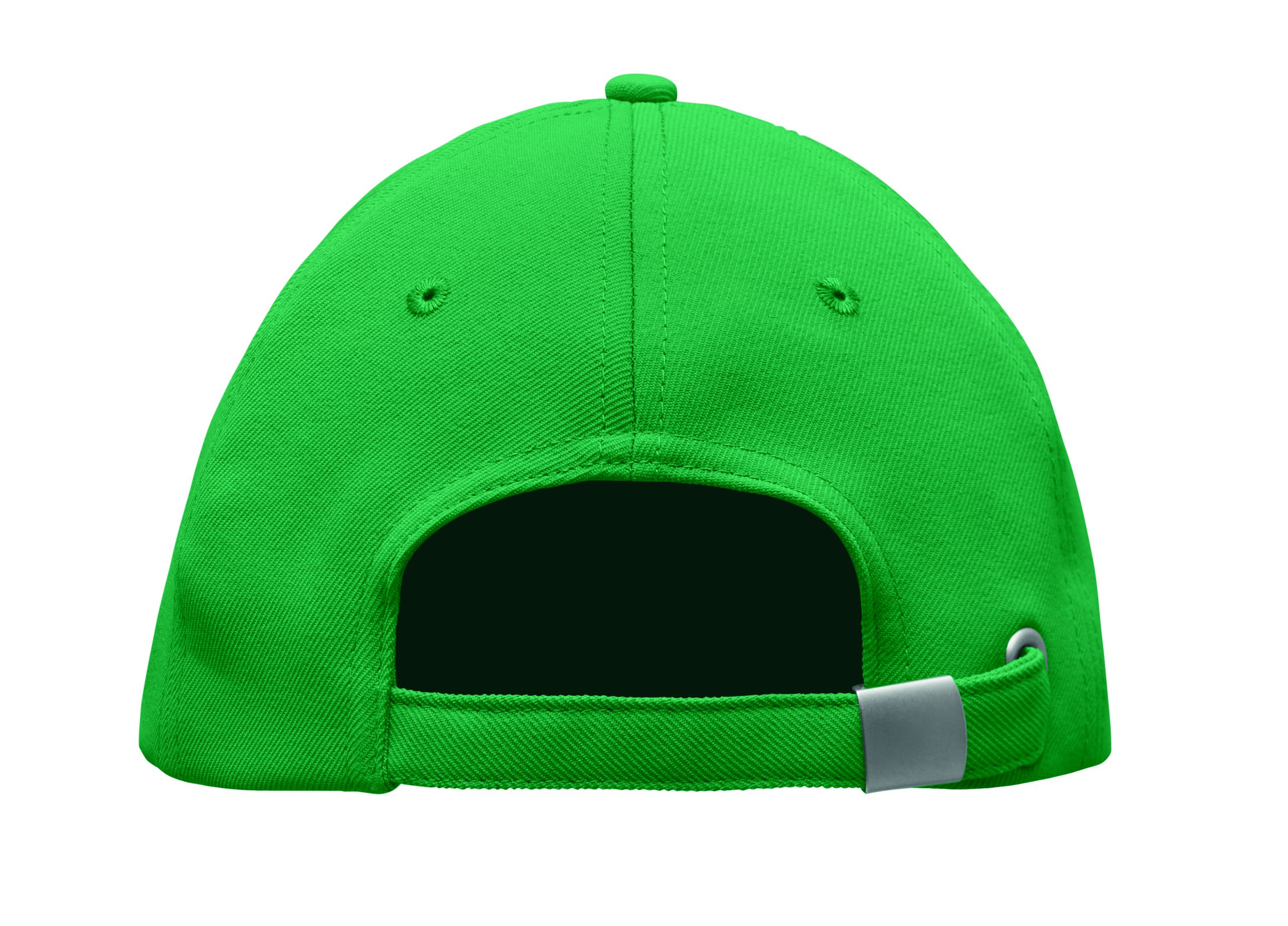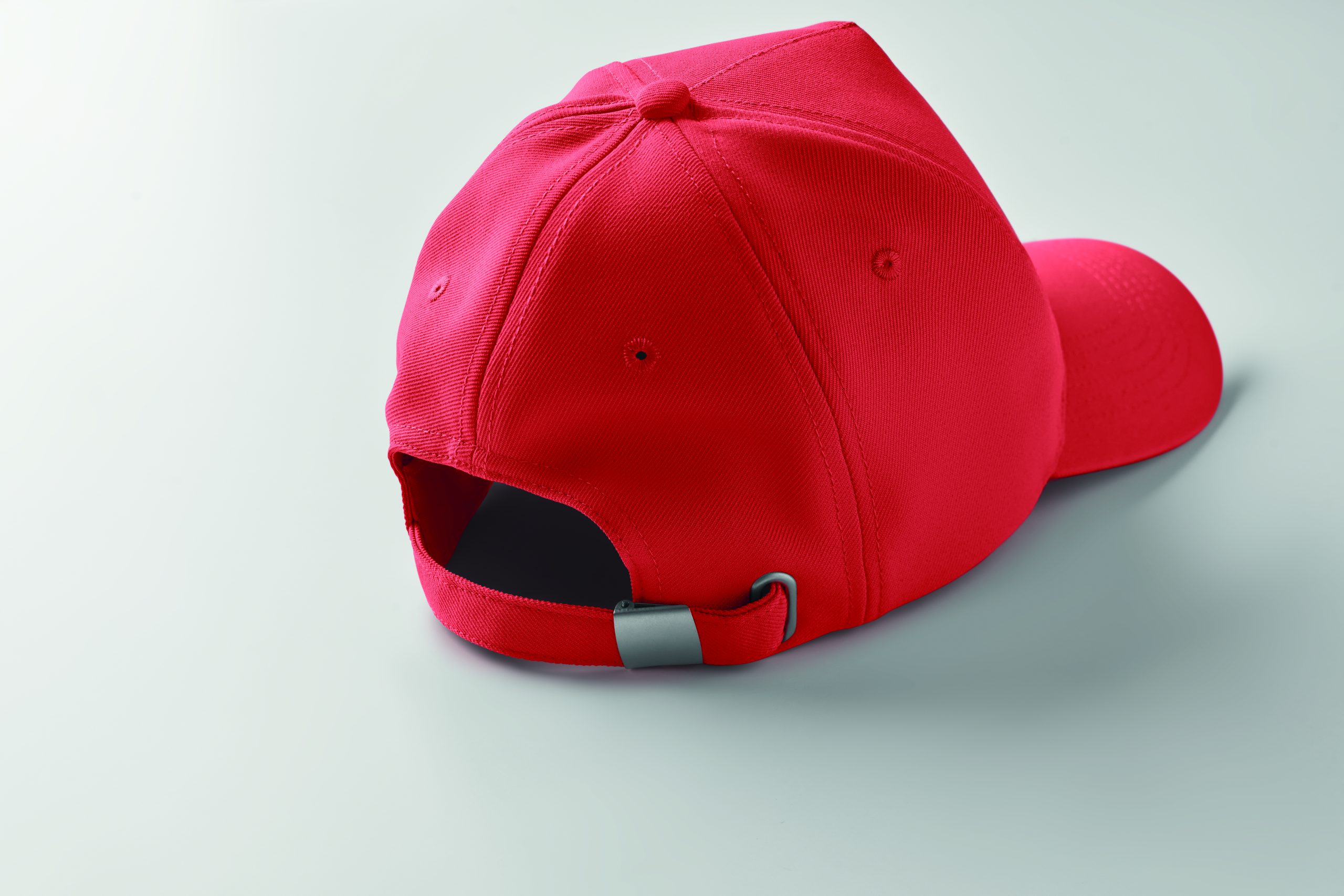 Czapka z daszkiem z 5 paneli z poliestru RPET 210 gm/m2 ze srebrną stalową sprzączką. 4 haftowane oczka w dopasowanym kolorze. Rozmiar 7 1/4.