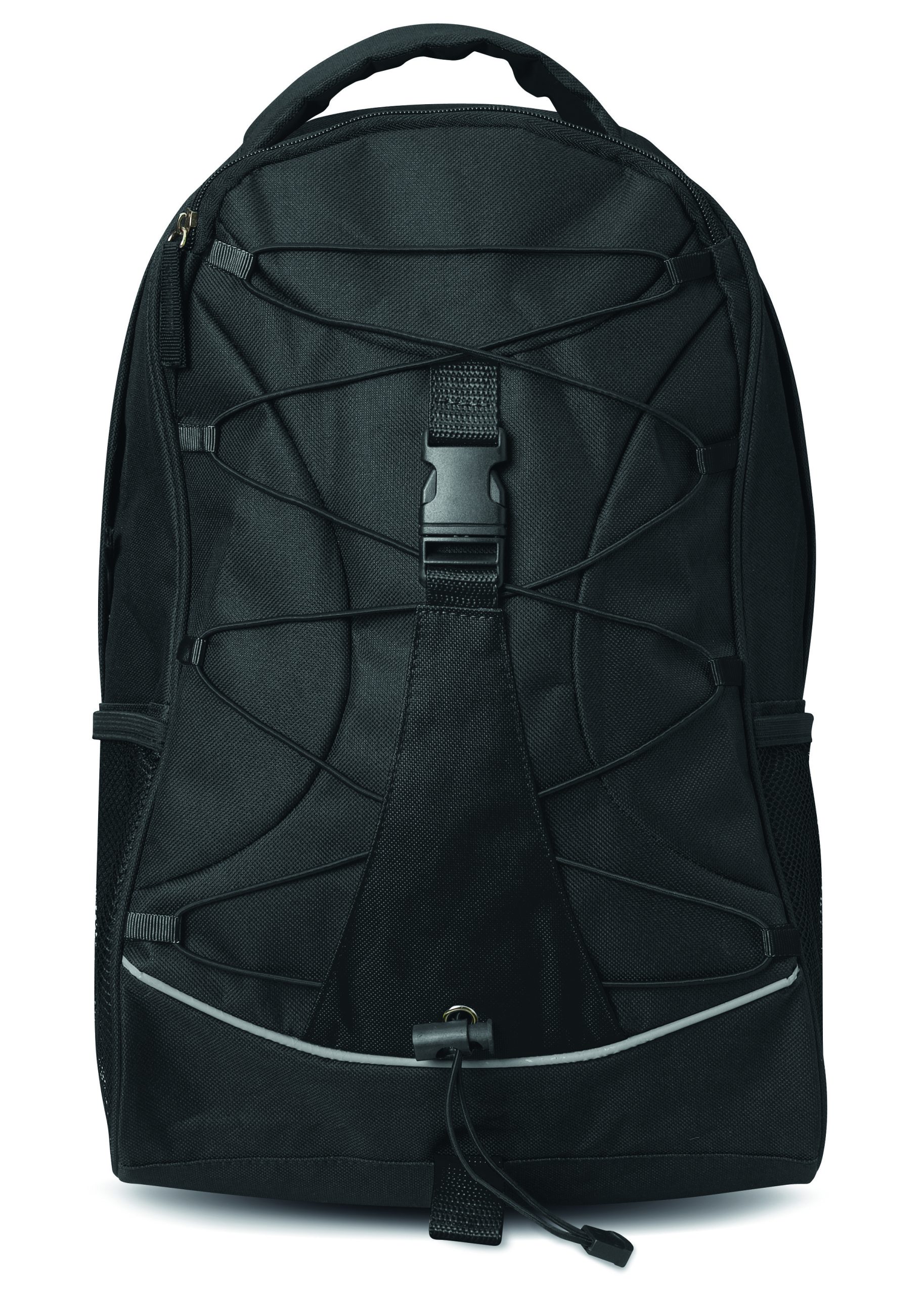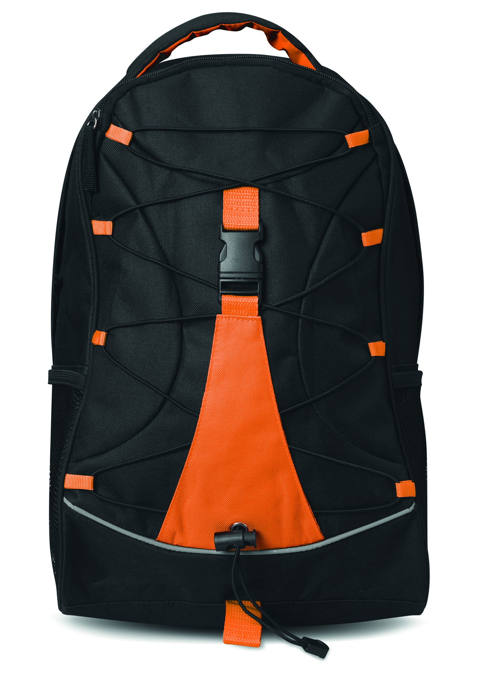 Czarny plecak z kolorową, kontrastową wkładką i dekoracyjną linką z przodu, boczne kieszenie z siatki. Wykonany z poliestru 600D.