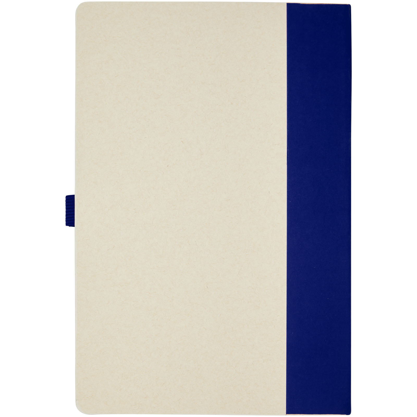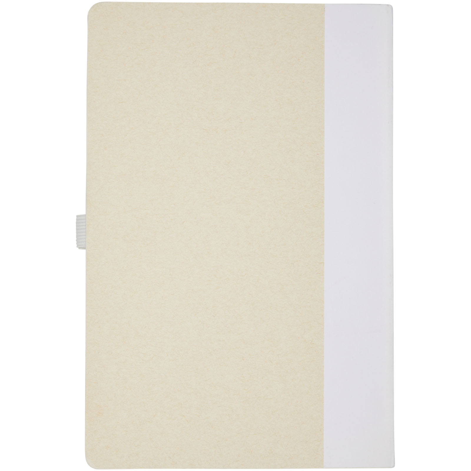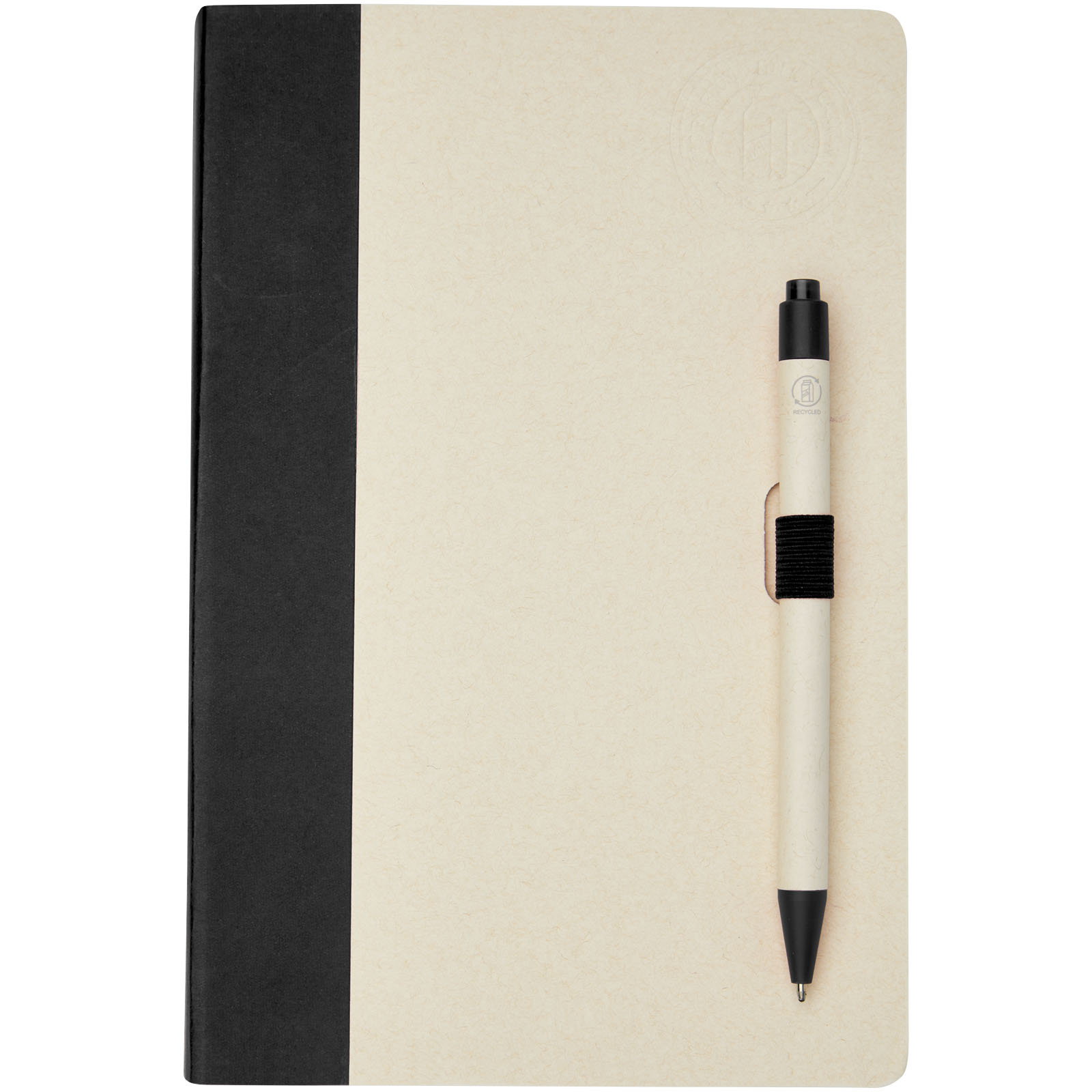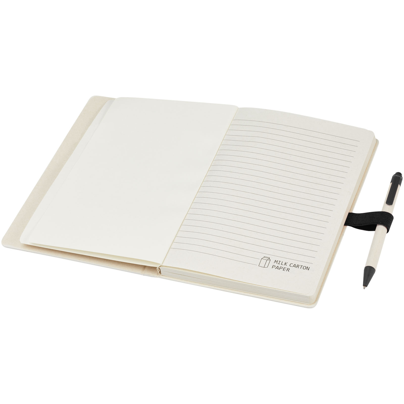 Zestaw z notatnikiem w formacie A5 i długopisem. Notatnik zawiera 80 kartek w linie (80 g/m²) wykonanych z poddanych recyklingowi kartonów po mleku (do 70%), grzbiet z kolorowego papieru i pętelkę na długopis. W pętelce na długopis znajduje się długopis na przycisk w dopasowanym do notatnika kolorze. Długopis ma korpus wykonany z tego samego materiału z kartonów mleka poddanych recyklingowi, a przycisk, klips i końcówka są wykonane z kolorowego tworzywa sztucznego PLA. W środku długopisu znajduje się czarny wkład. Zużyte kartony po mleku są zbierane, sortowane, przetwarzane i zamieniane w papier, co pozwala na przekształcenie odpadów w coś użytecznego.