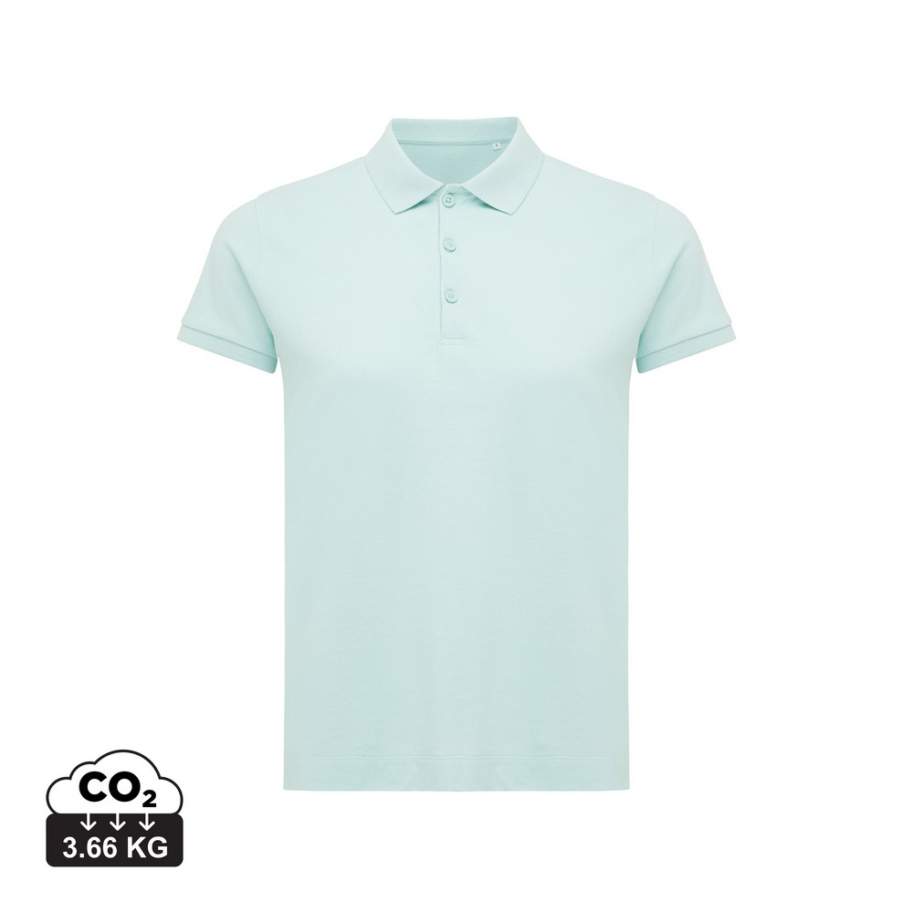 Koszulka polo, damska, zapięcie na 3 guziki, krój medium, splot Pique, krótkie rękawy, wykonana w 50% z bawełny z recyklingu i w 50% z bawełny organicznej o gramaturze 220 g/m2, bez dodatku poliestru, posiada wbudowany znacznik AWARE™, który potwierdza wykorzystanie materiałów z recyklingu, posiada kod QR na metce, który prowadzi do cyfrowego paszportu produktu, 2% wpływów z każdego sprzedanego produktu jest przekazywane na rzecz Water.org