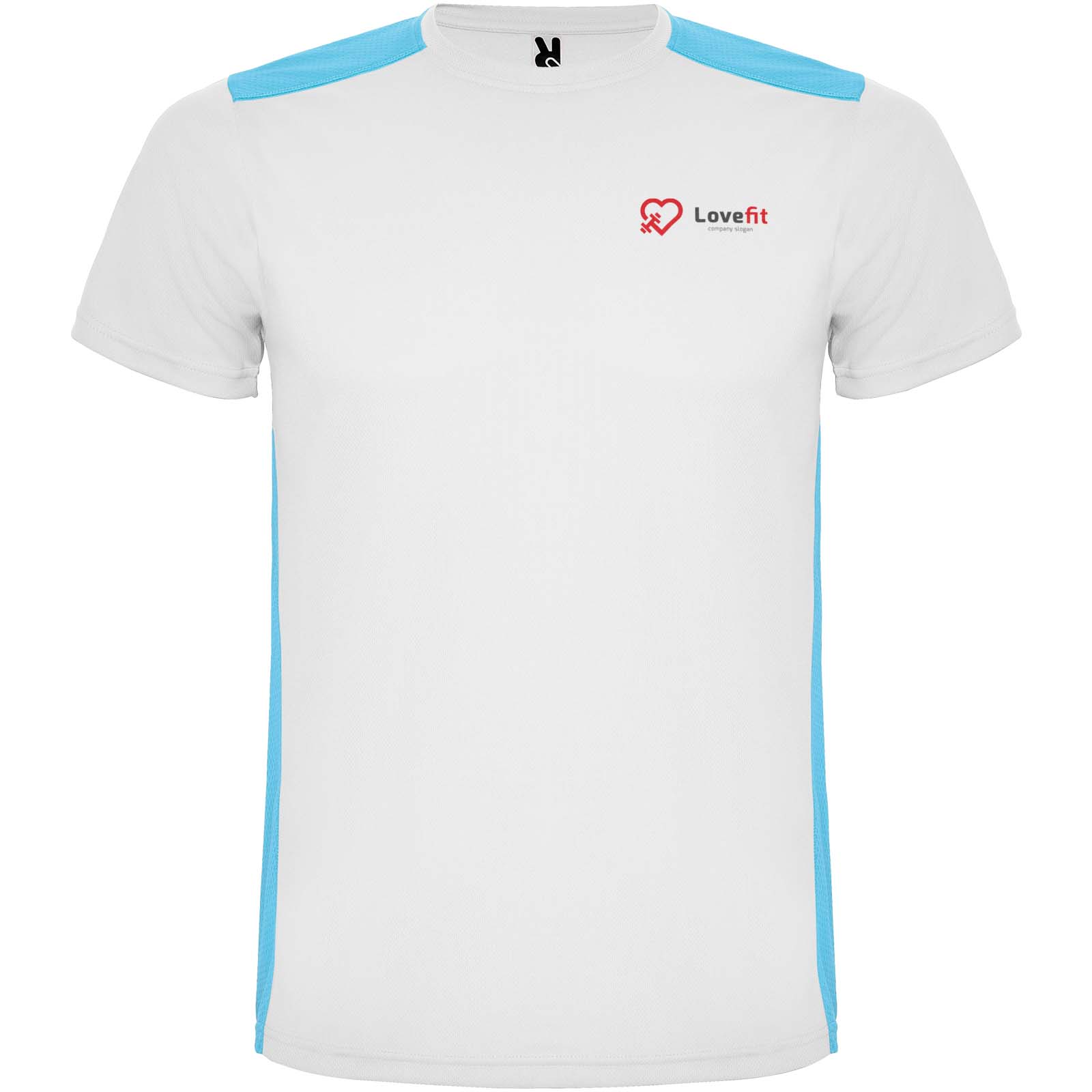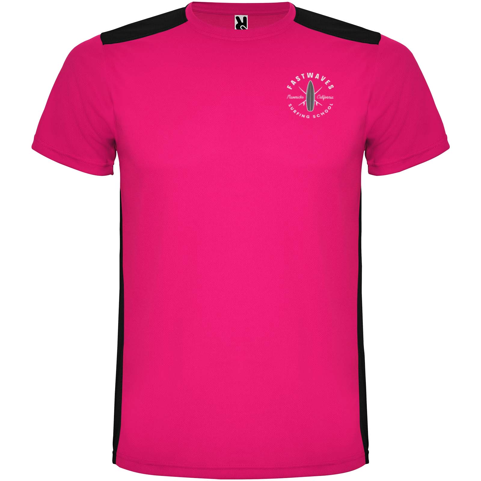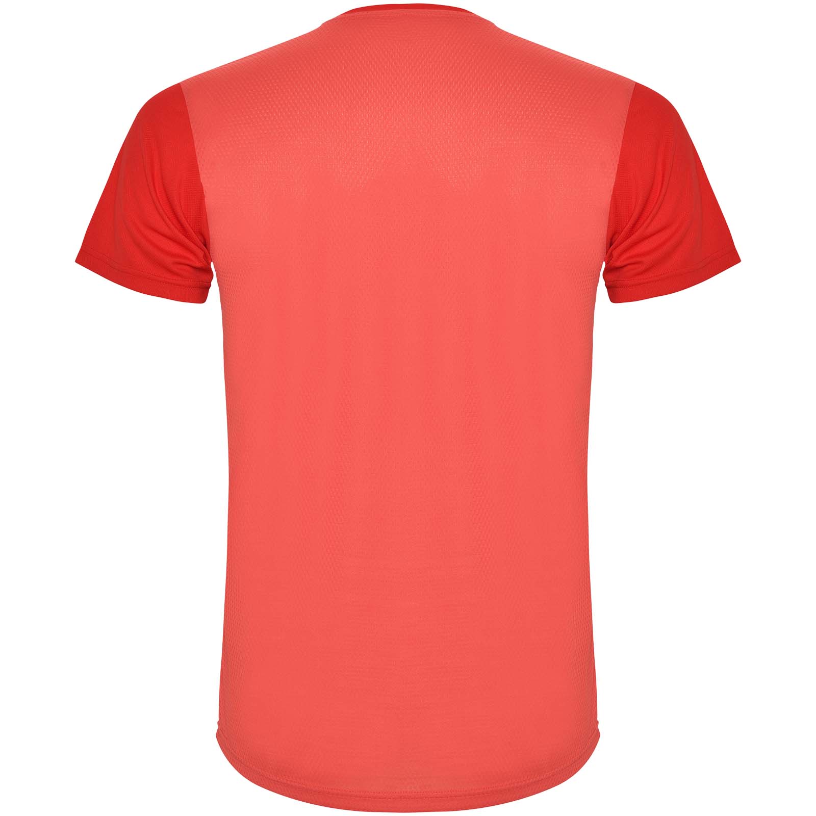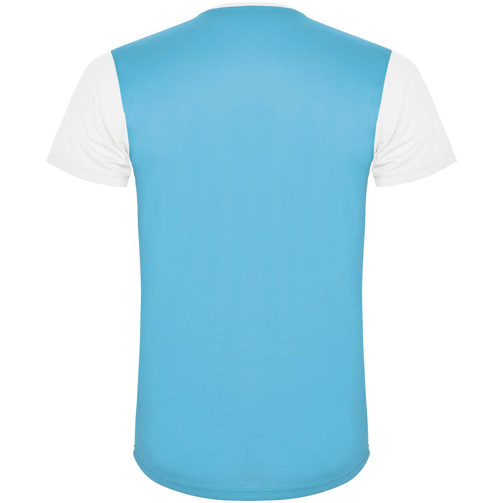 Łatwoschnący, techniczny i oddychający materiał. Okrągły kołnierzyk. Połączenie dwóch materiałów poliestrowych na plecach i ramionach. Materiał o splocie Birdseye z przodu i oddychająca siateczka 3D z tyłu. Materiał przygotowany na wchłanianie wilgoci. Ozdobny ścieg zygzakowy po bokach i na ramionach. Wzór na plecach nieco dłuższy. Usuwalna etykieta.