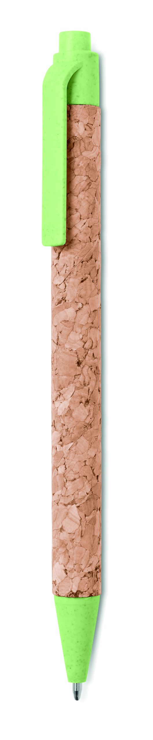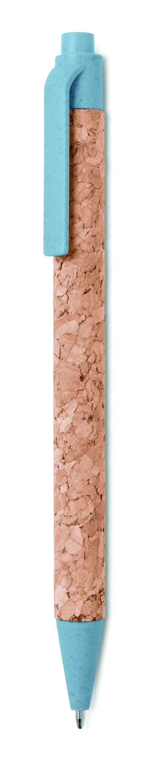Przyciskany ekologiczny długopis z korpusem z korka i wykończeniami z mieszanki pszenicy/ słomy (50%) i plastiku ABS (50%). Niebieski wkład. Korek jest materiałem naturalnym, ze względu na jego strukturalną naturę i porowatość powierzchni ostateczny wygląd nadruku na każdym artykule może się różnić.