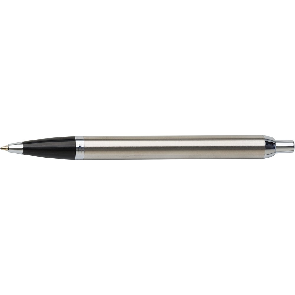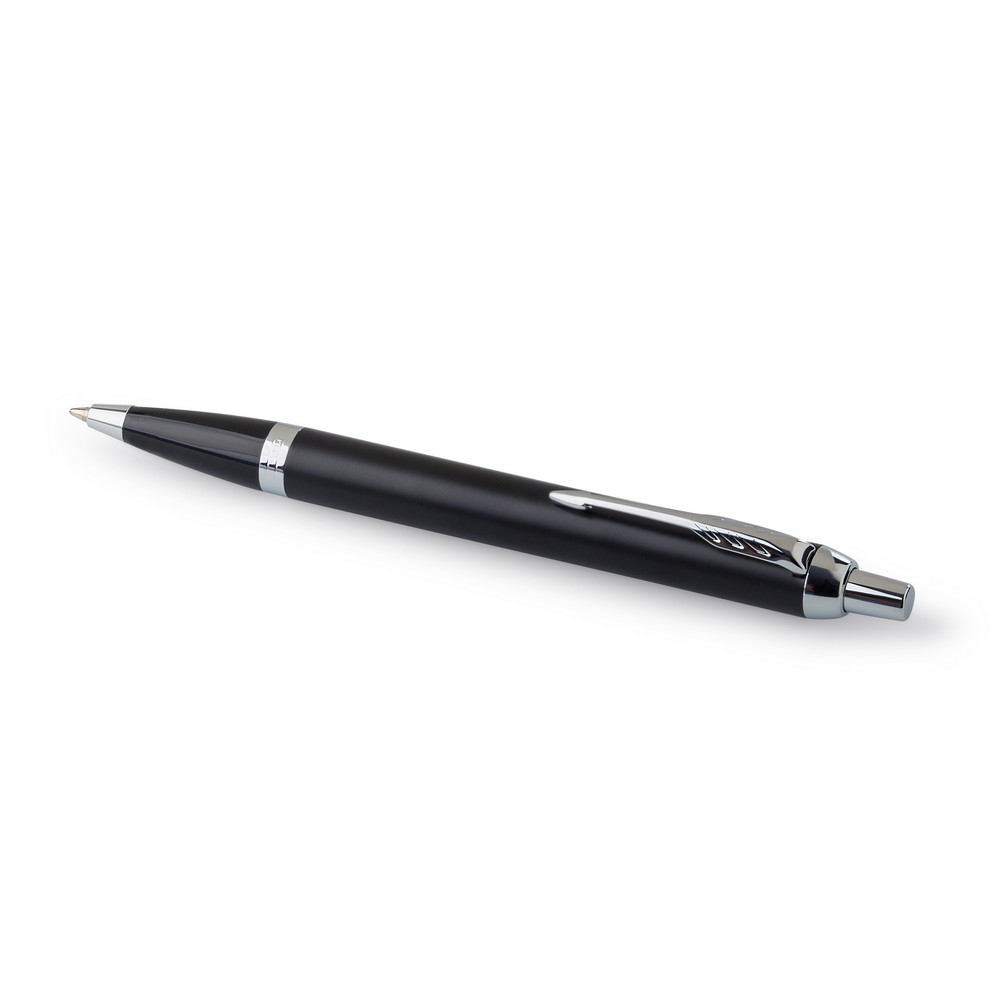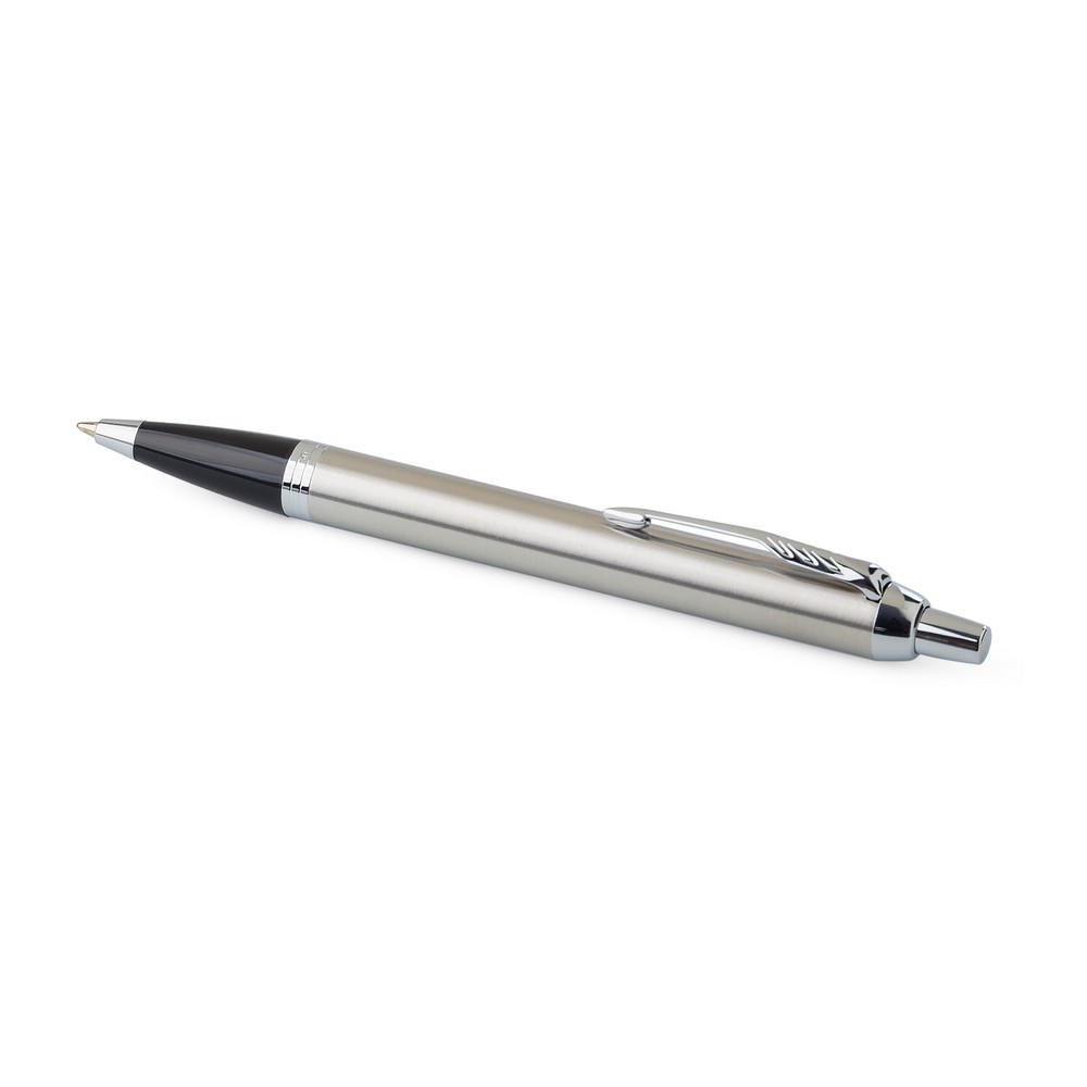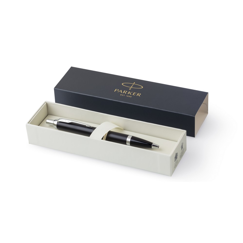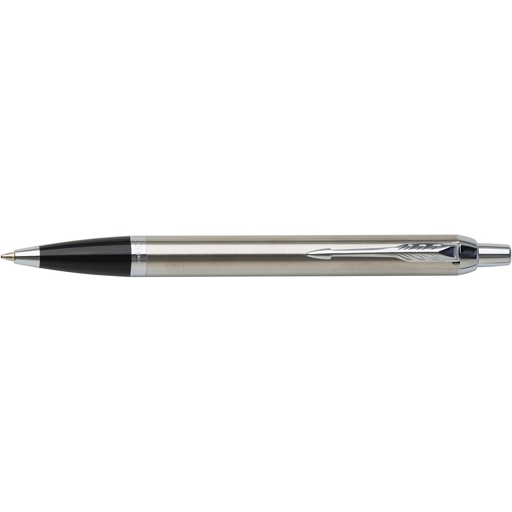 Długopis Parker IM, wkład w niebieskim kolorze, grawe ukazuje powierzchnię w kolorze złotym, zapakowany w pudełko upominkowe, produkt wykonany z metalu
