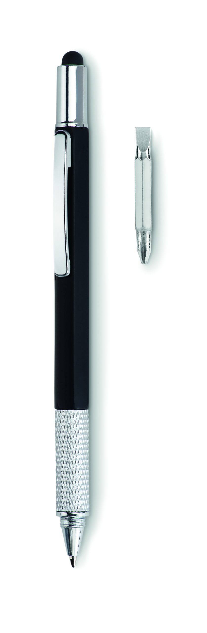 Przekręcany długopis z poziomicą, wykonany z ABS. Wyposażony w linijkę, rysik oraz podwójny śrubokręt gwiazdka i płaski. Czarny tusz.