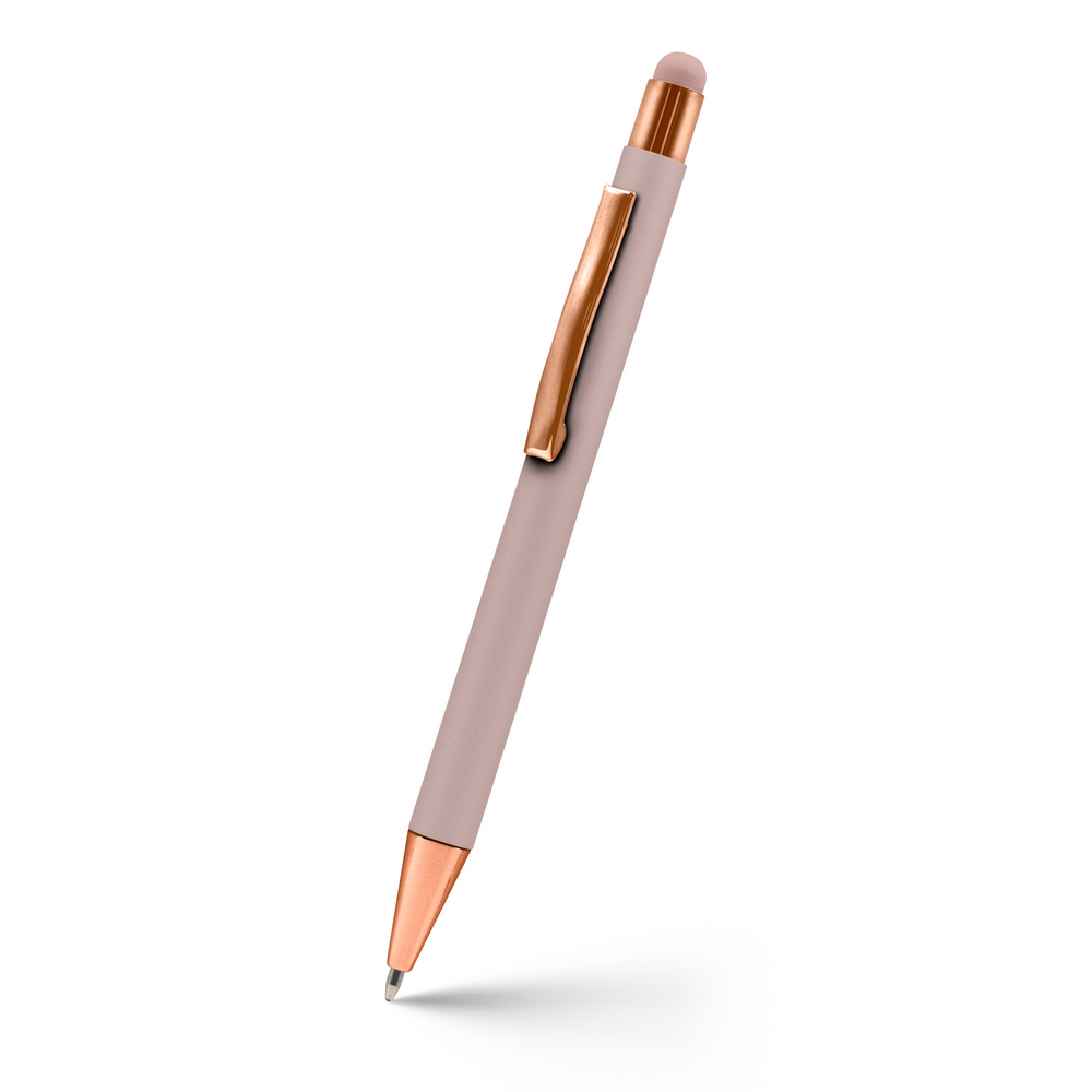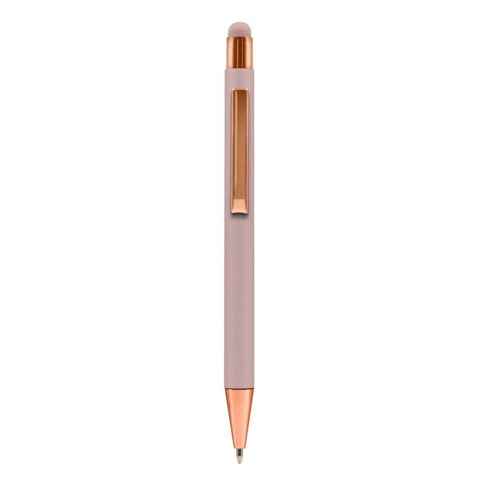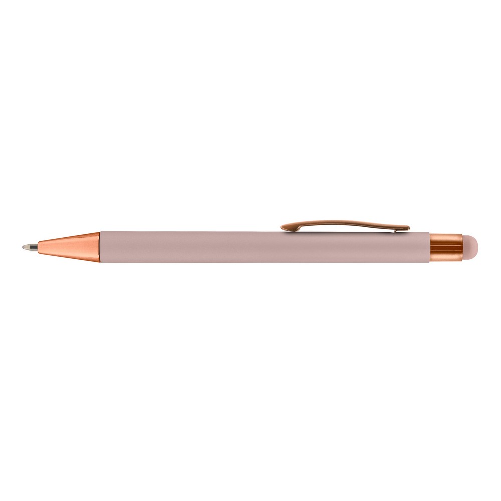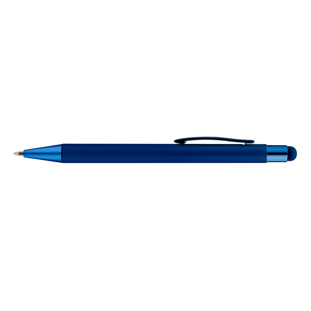 Długopis z kolorowym trzonem i błyszczącymi elementami, końcówka touch pen umożliwiająca obsługę ekranów dotykowych, wkład w niebieskim kolorze, produkt wykonany z aluminium