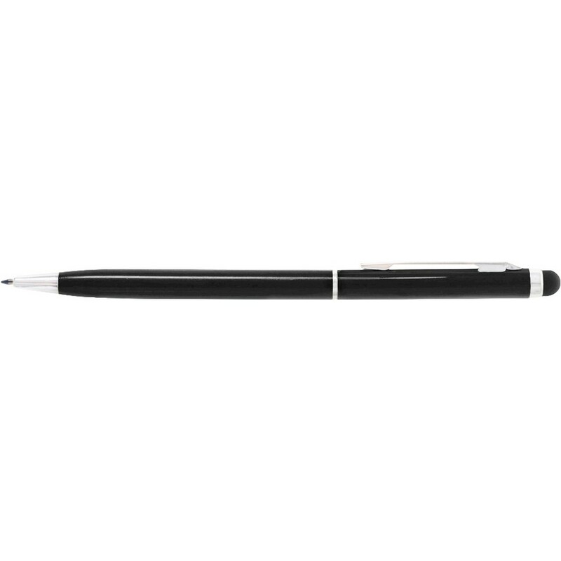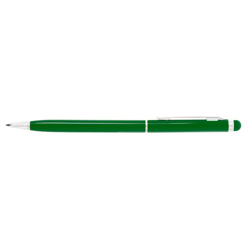 Długopis z kolorowym trzonem o błyszczącym wykończeniu, niewielka średnica nadaje nowoczesnego wyglądu, dopasowana kolorystycznie końcówka touch pen umożliwiająca obsługę ekranów dotykowych, wkład w niebieskim kolorze, produkt wykonany z aluminium