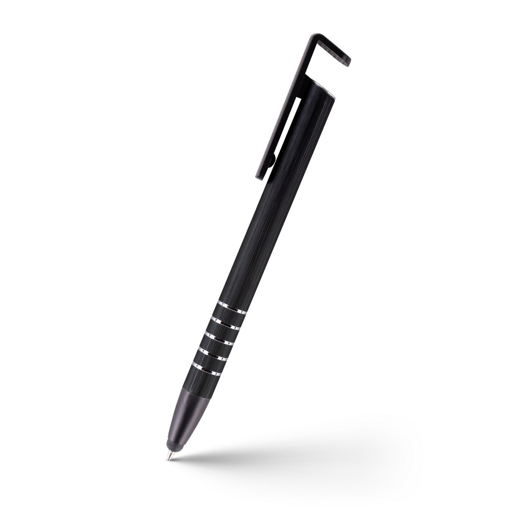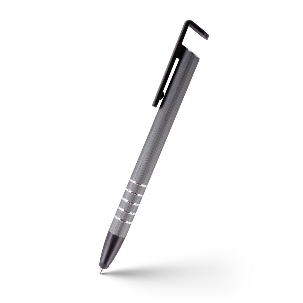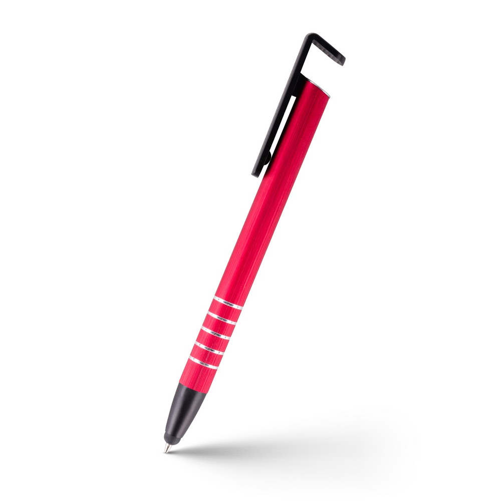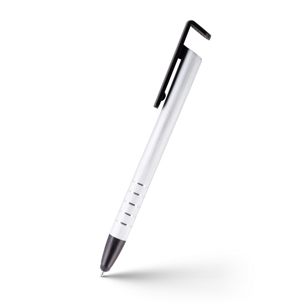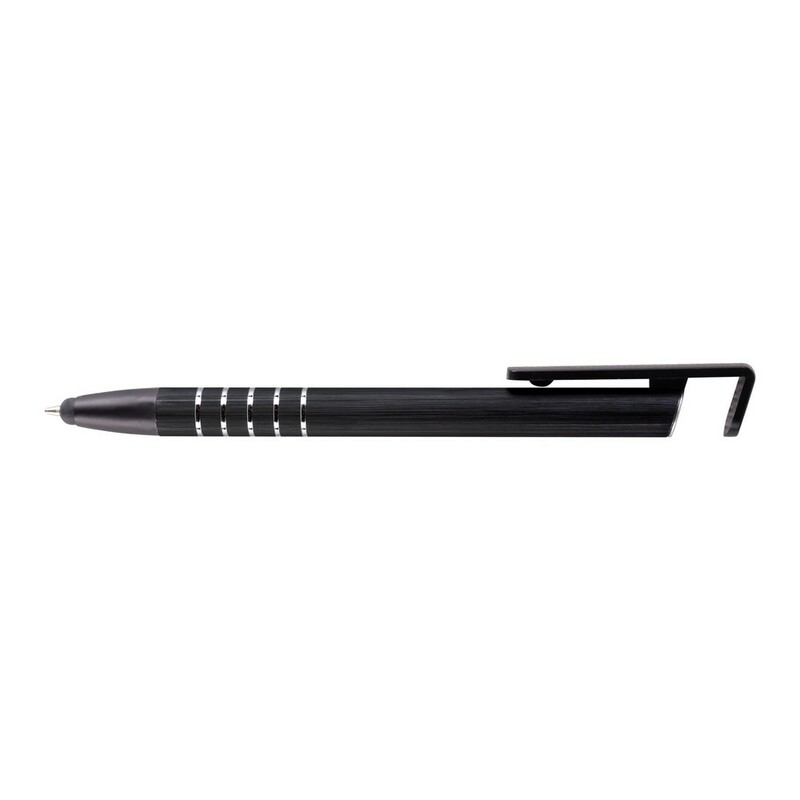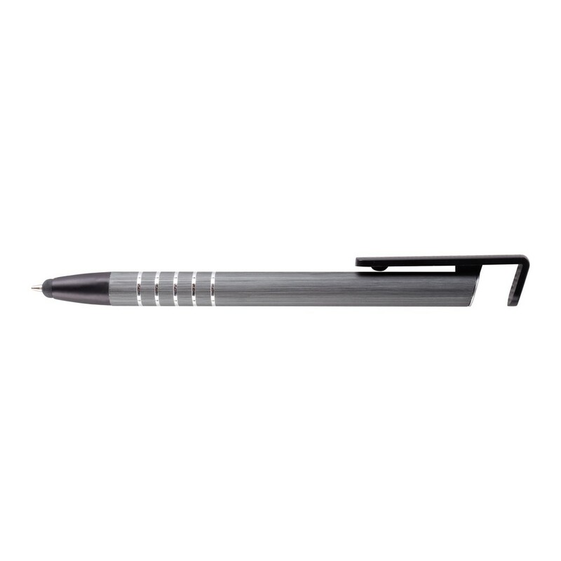 Długopis z kolorowym trzonem i elementami w srebrnym kolorze, specjalny klip może służyć jako stojak na telefon, końcówka touch pen umożliwiająca obsługę ekranów dotykowych, wkład w niebieskim kolorze, produkt wykonany z aluminium i plastiku