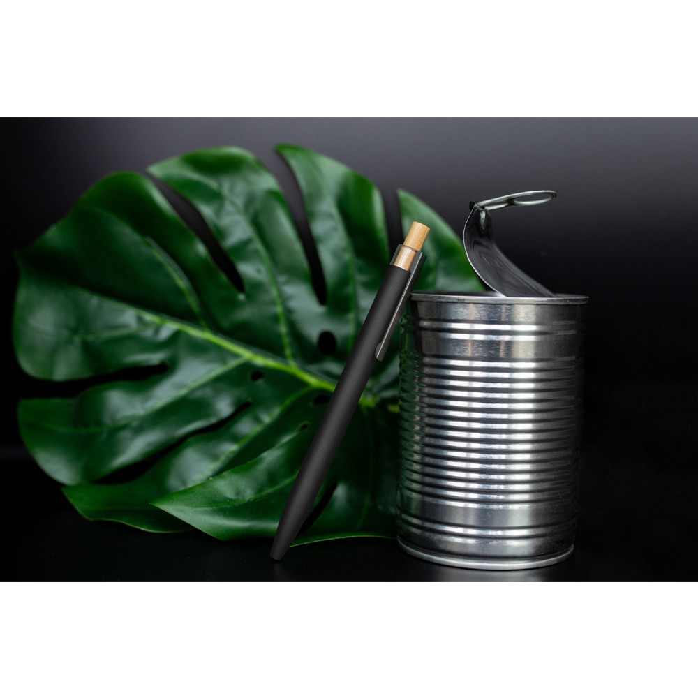 Długopis z kolorowym trzonem i elementami w szarym kolorze, posiada bambusowy przycisk, wkład w granatowym kolorze, produkt wykonany z aluminium z recyklingu, bambusa i RPET