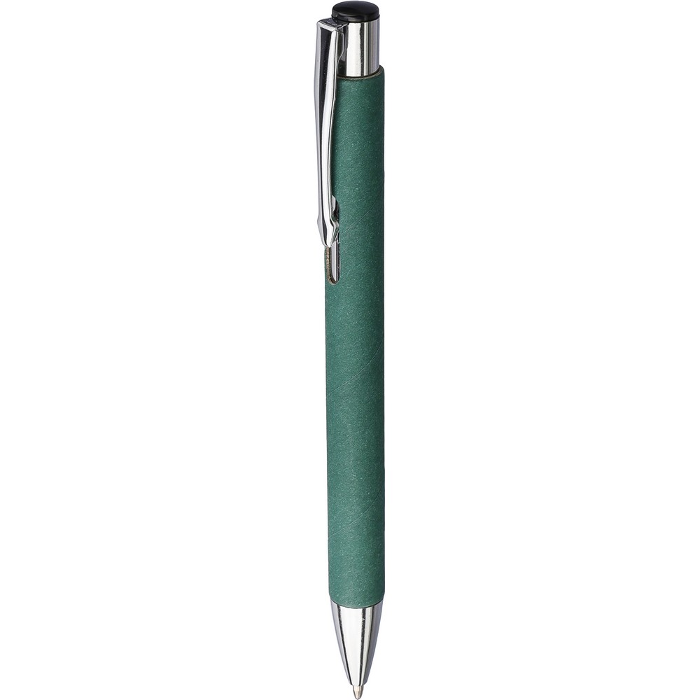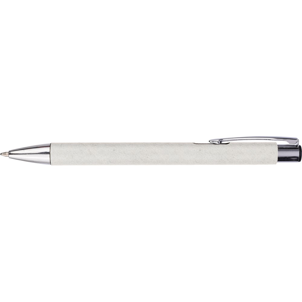 Długopis, klip ułatwiający zawieszanie na kieszeni albo okładce notatnika, wkład w czarnym kolorze, trzon wykonany z papieru z recyklingu, klips z metalu, końcówka z plastiku
