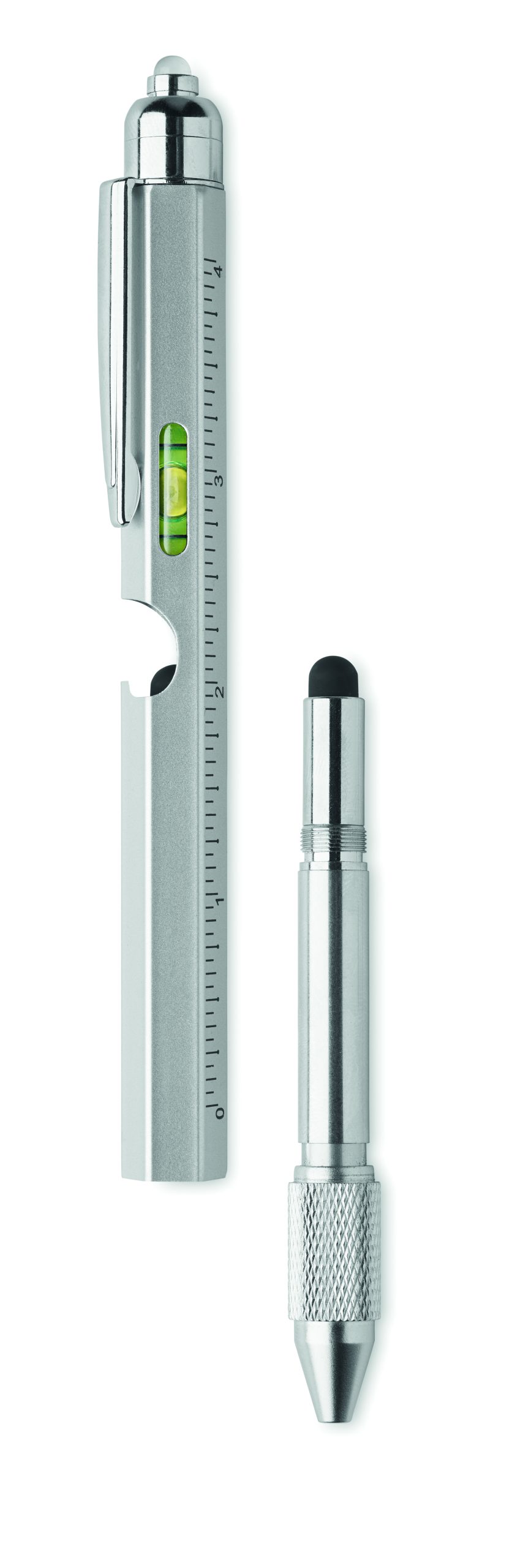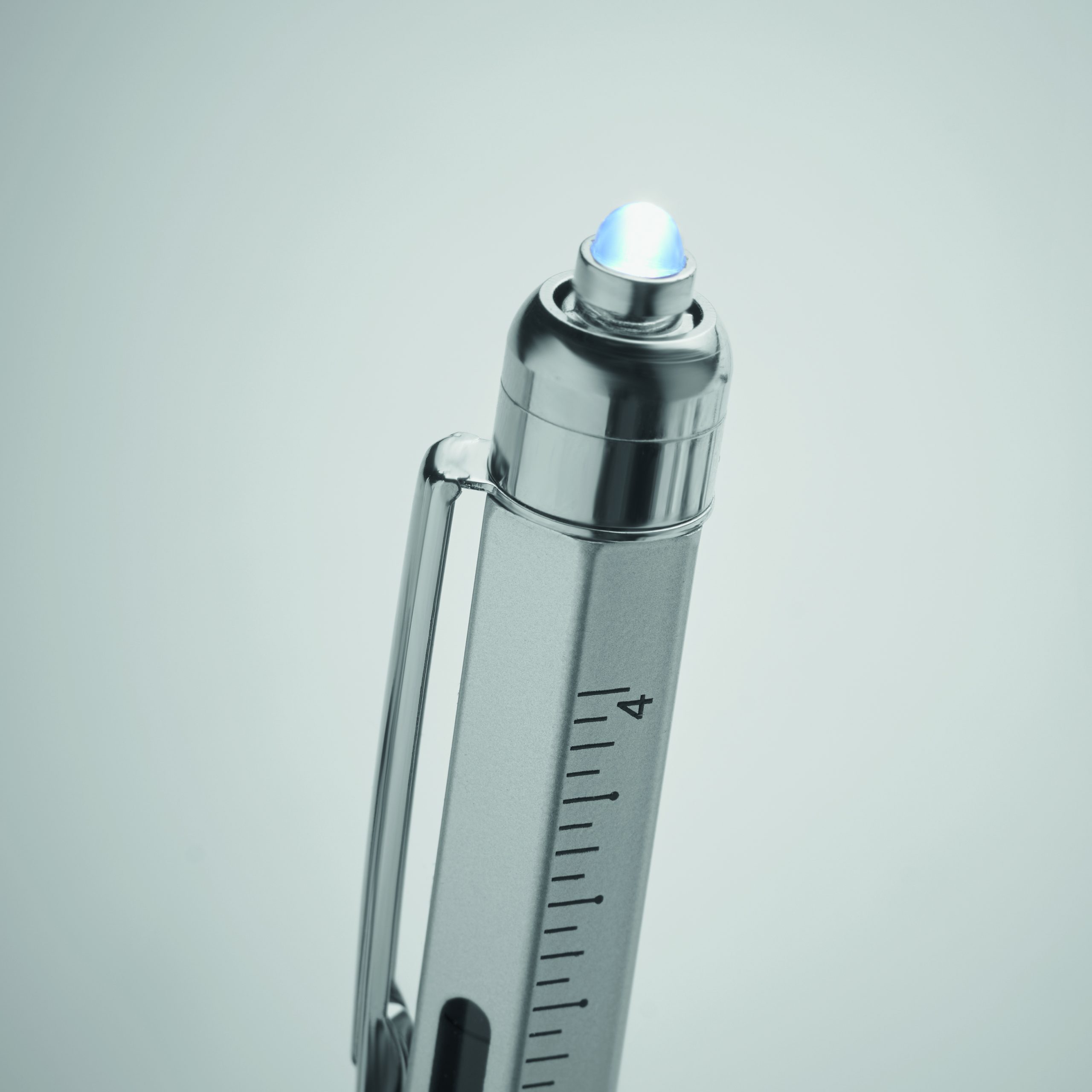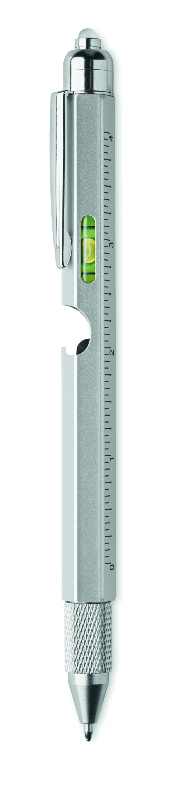 Długopis ze stali nierdzewnej z poziomicą, linijką, rysikiem i końcówką śrubokrętu krzyżakowego i płaskiego oraz z diodą LED. 3 baterie AG w zestawie. Niebieski tusz.