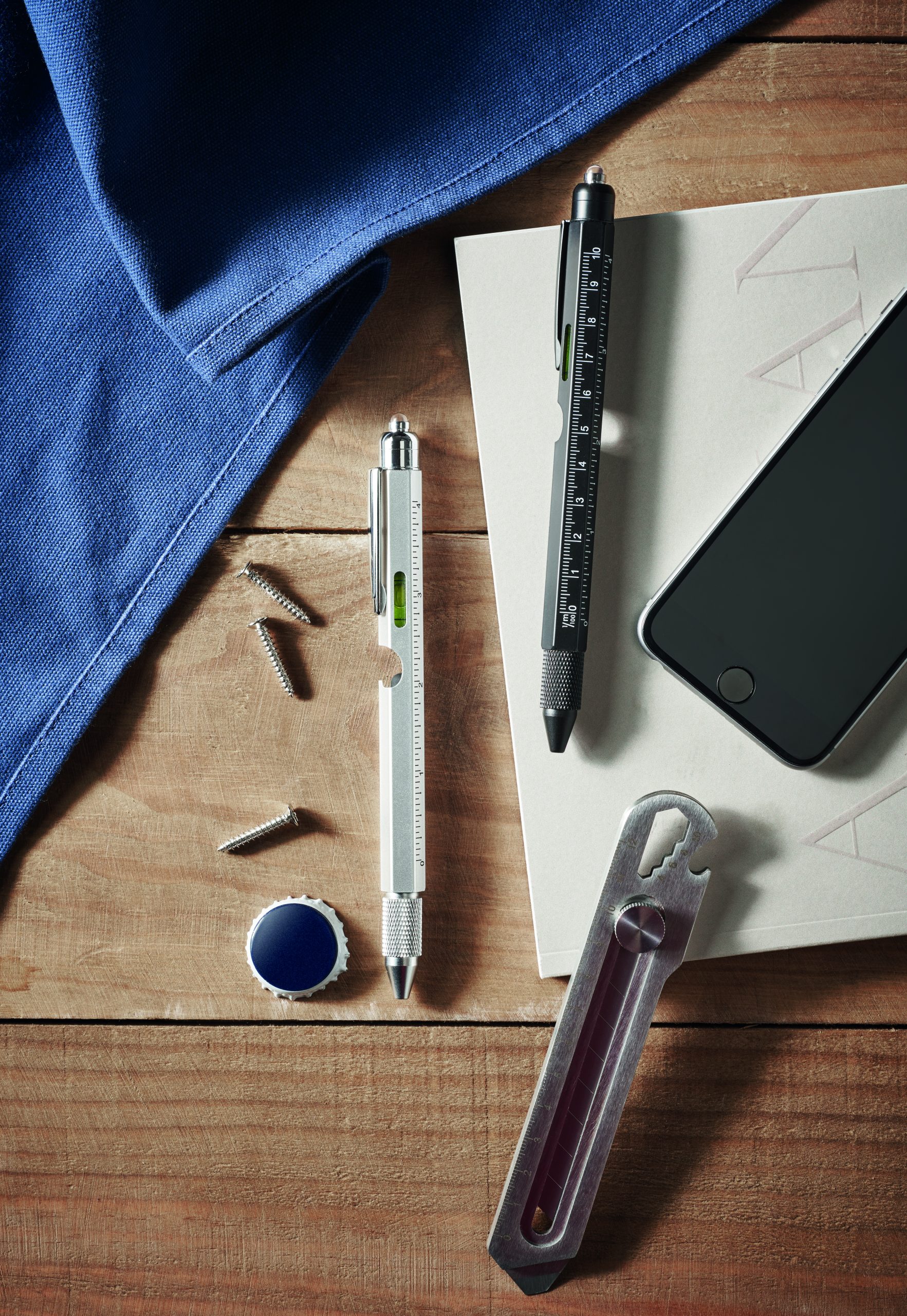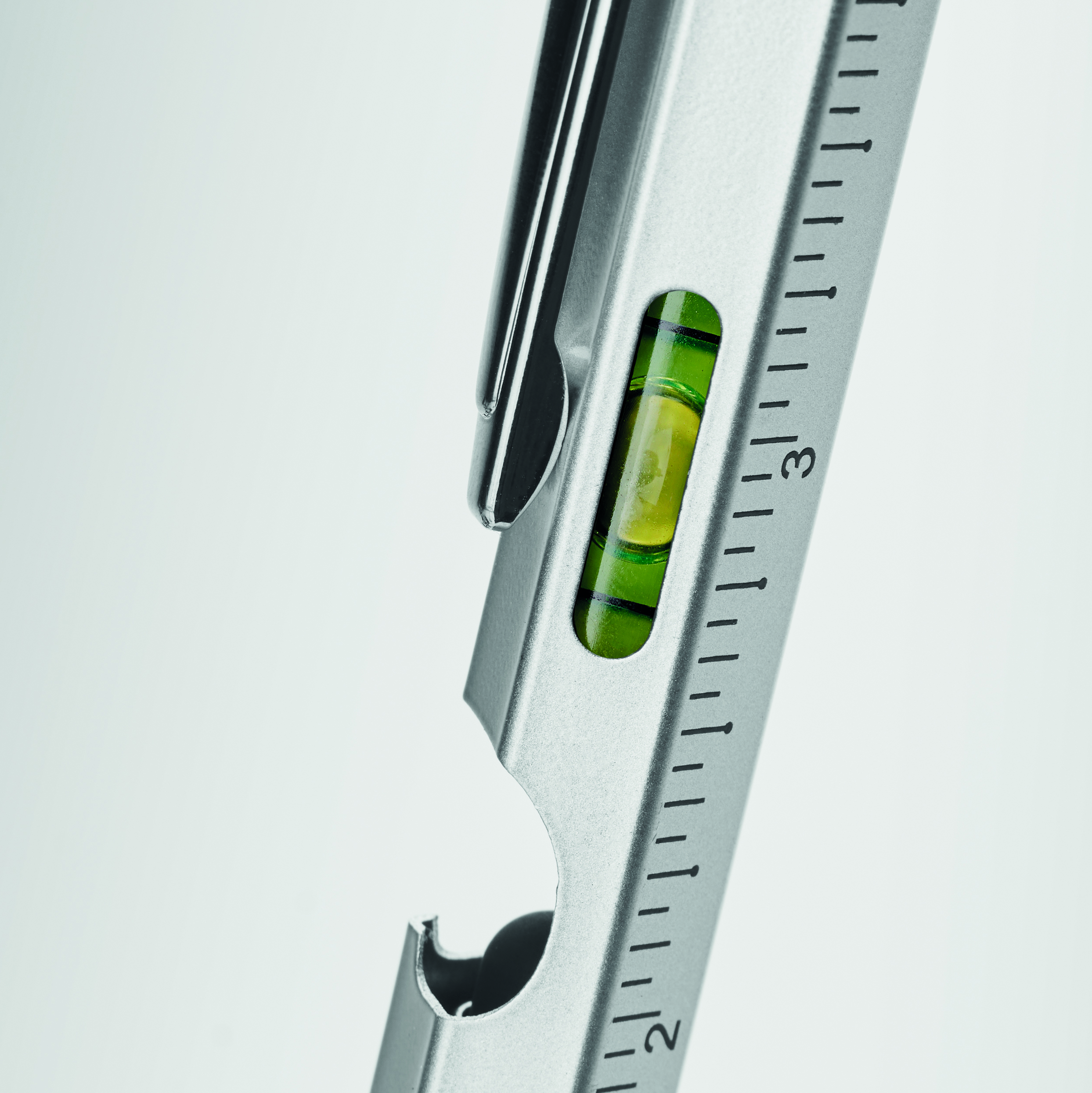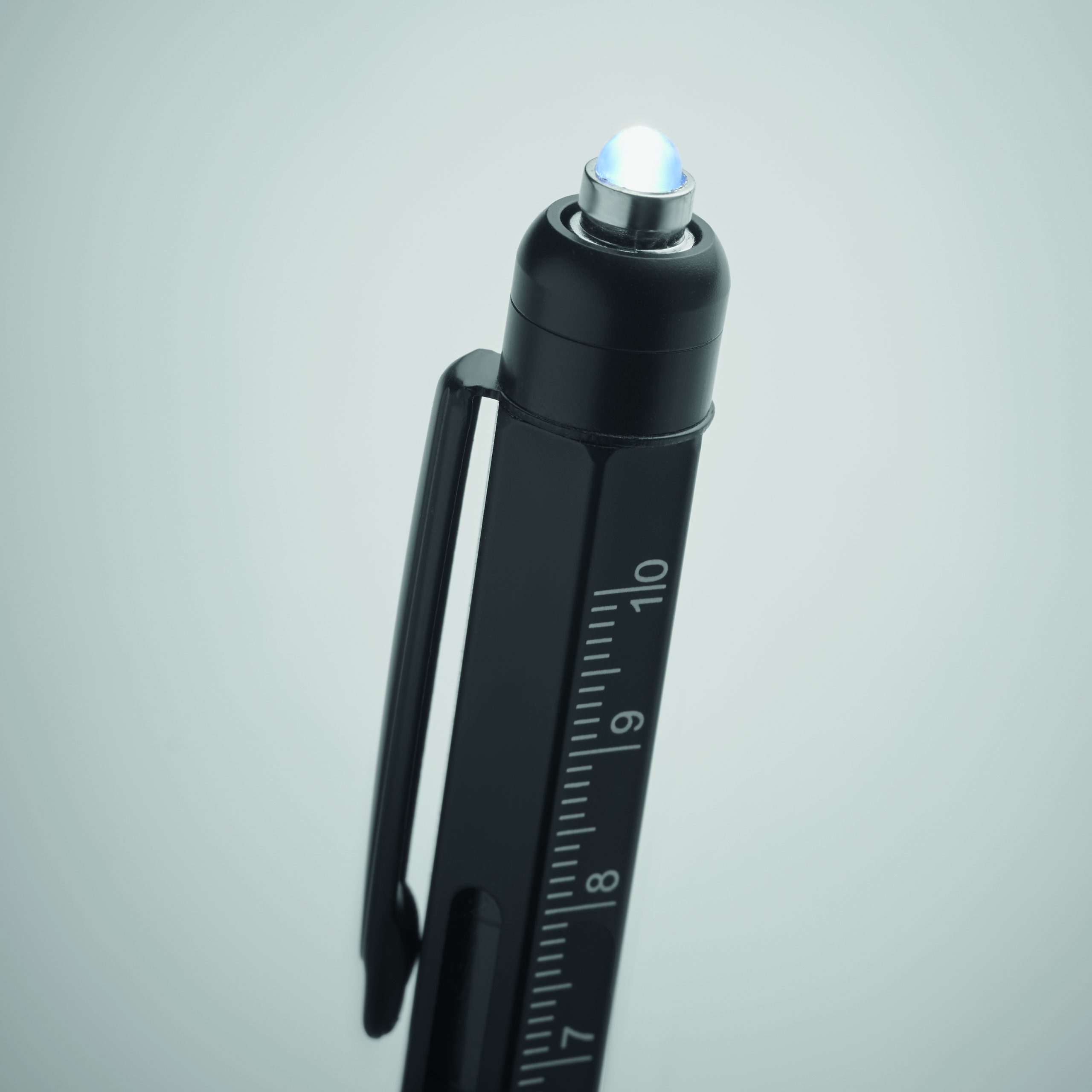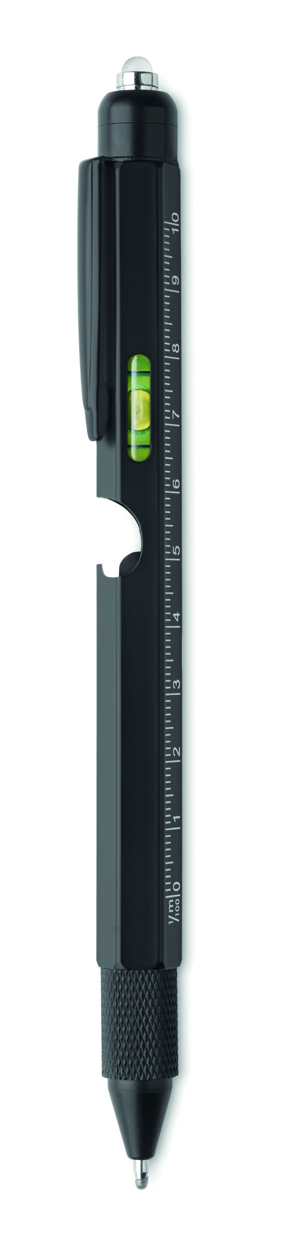 Długopis ze stali nierdzewnej z poziomicą, linijką, rysikiem i końcówką śrubokrętu krzyżakowego i płaskiego oraz z diodą LED. 3 baterie AG w zestawie. Niebieski tusz.