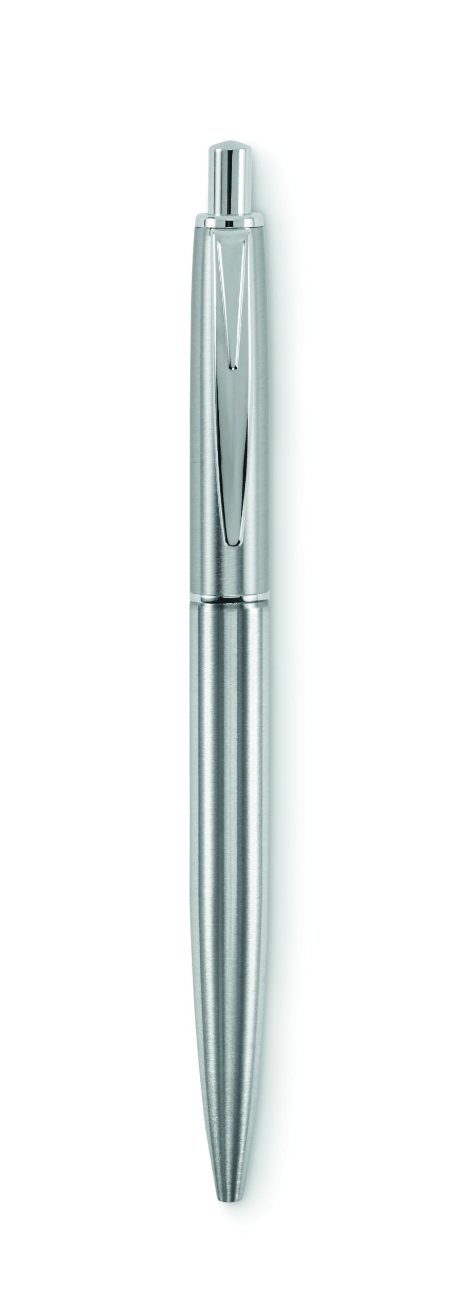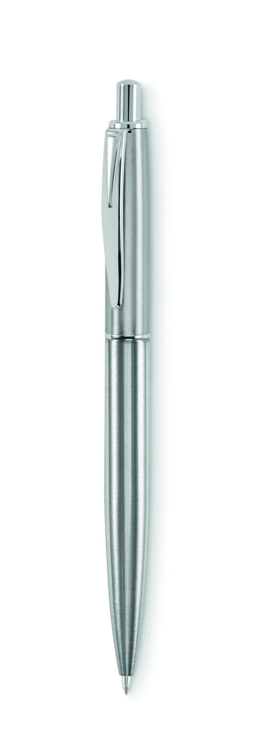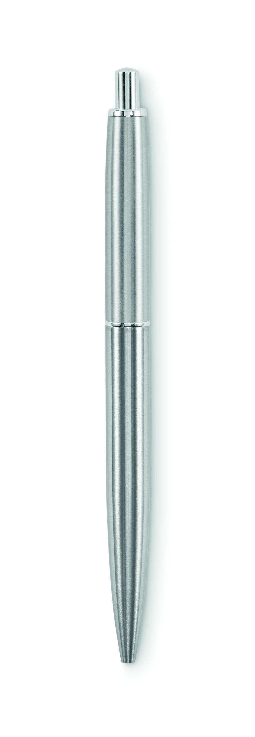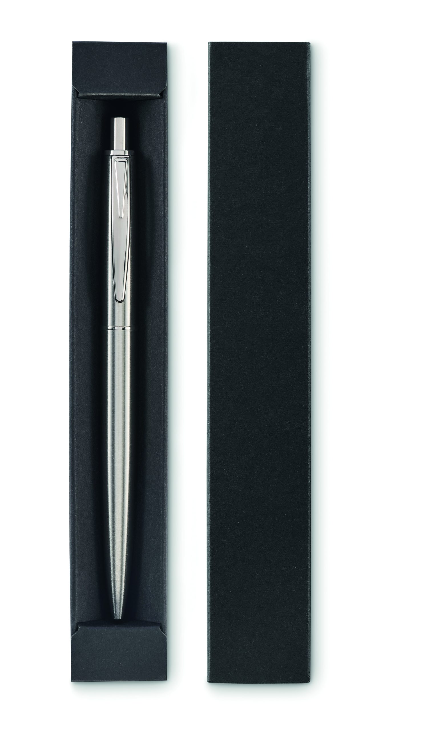 Przyciskany długopis z korpusem z recyklingowanej stali nierdzewnej. Niebieski tusz. Prezentowany w czarnym pudełku.