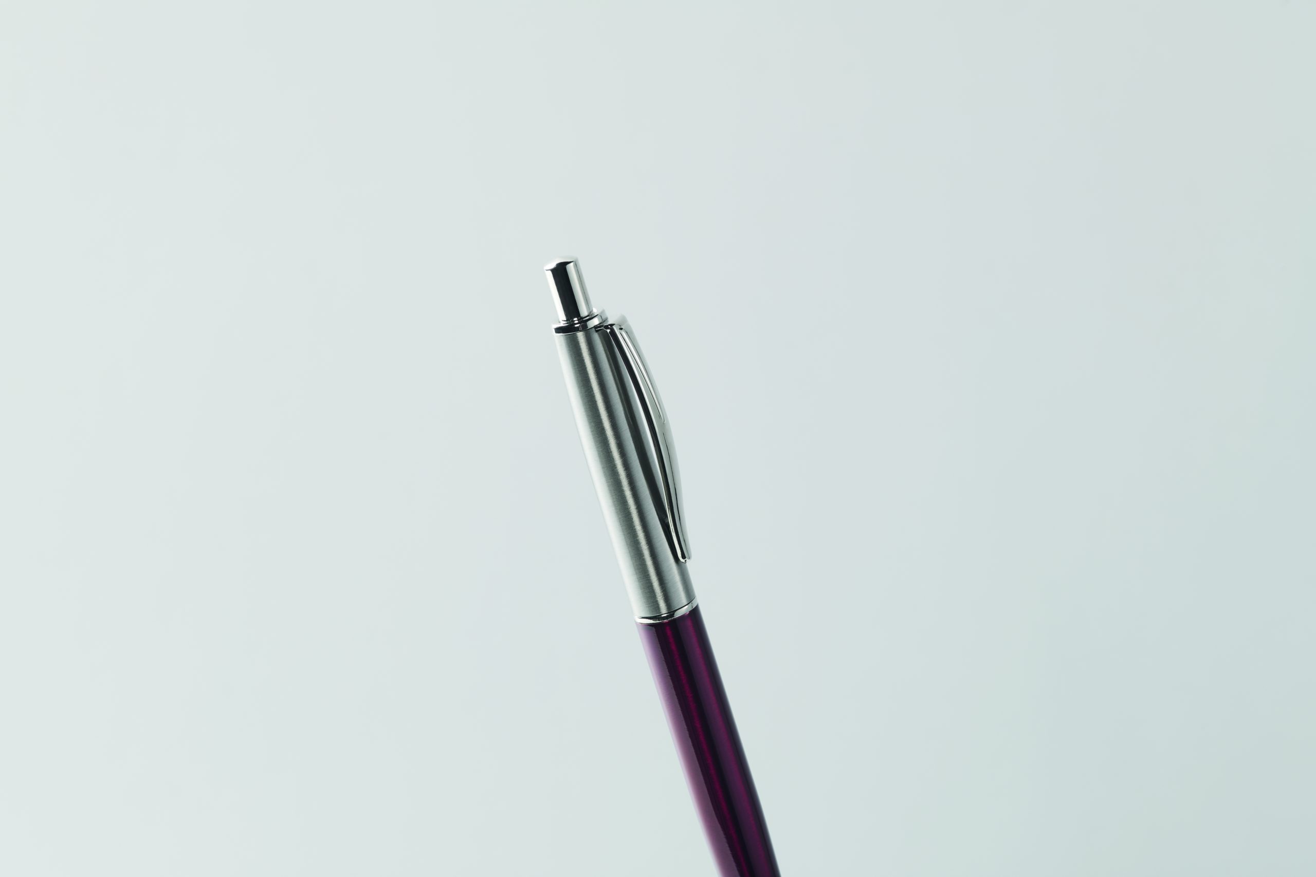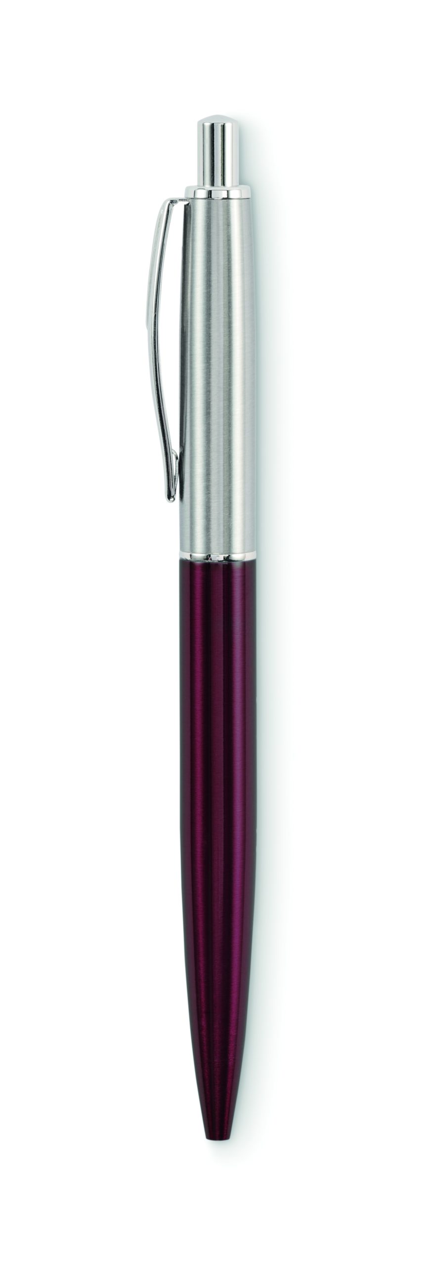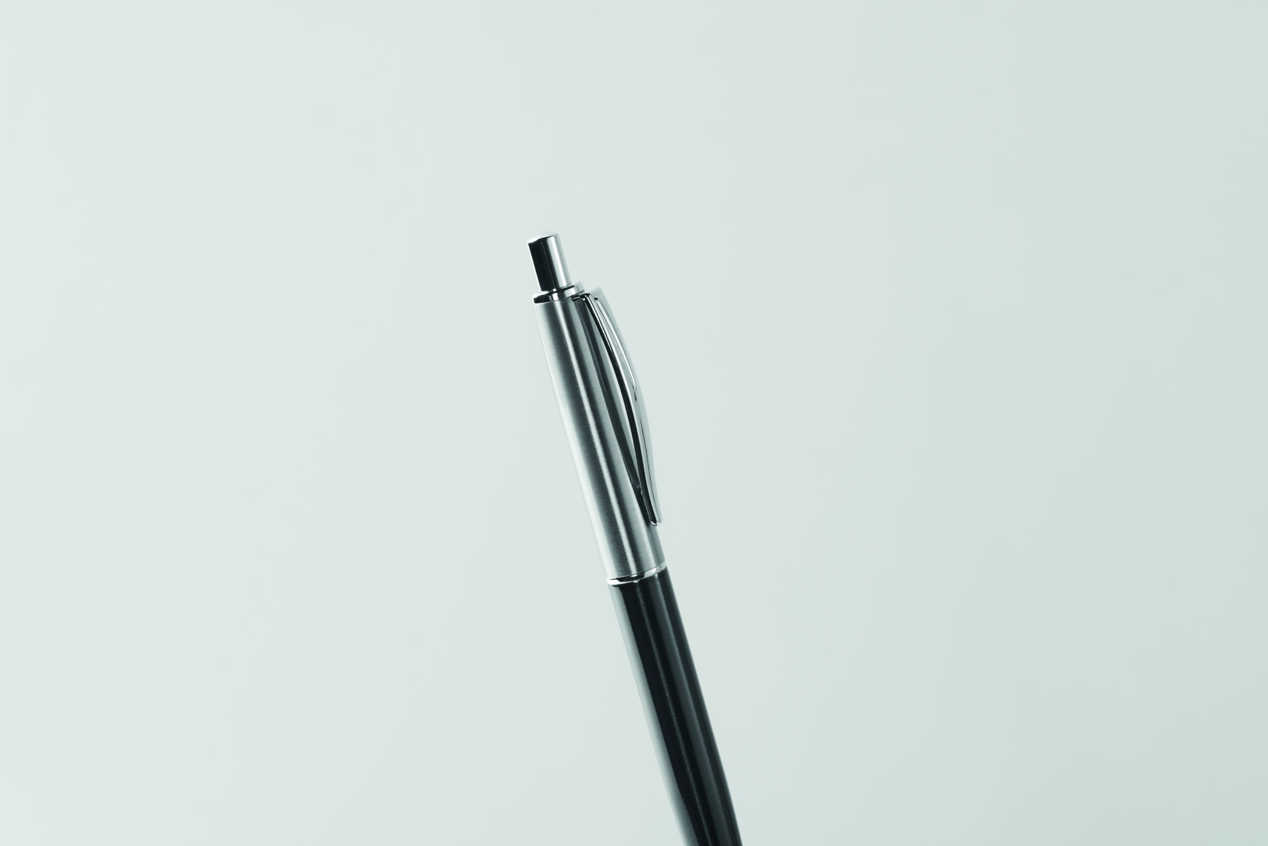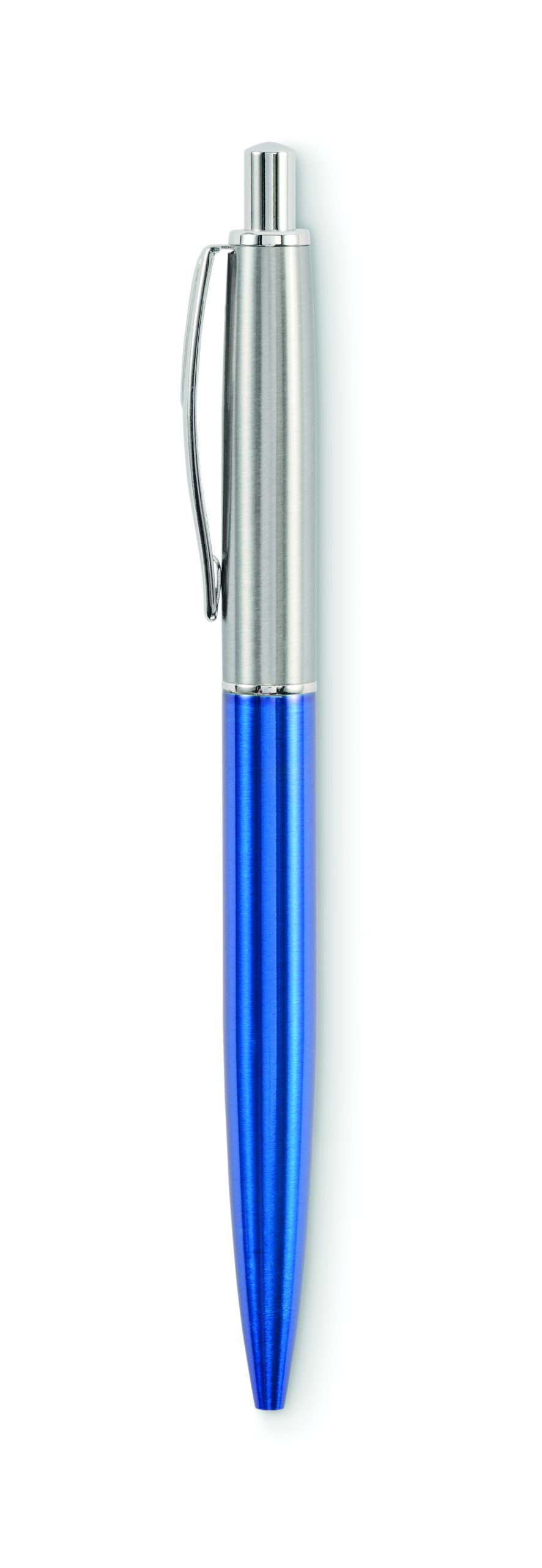 Przyciskany długopis z korpusem z recyklingowanej stali nierdzewnej. Niebieski tusz. Prezentowany w czarnym pudełku.