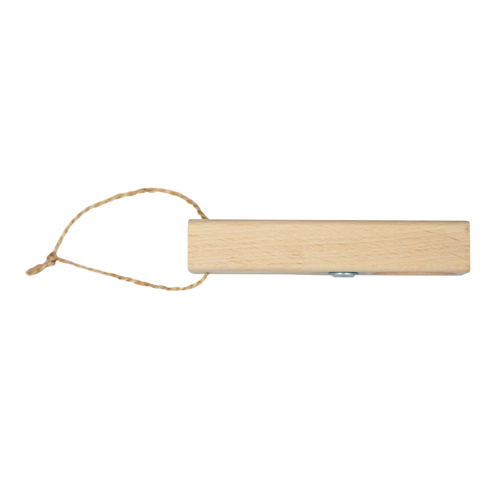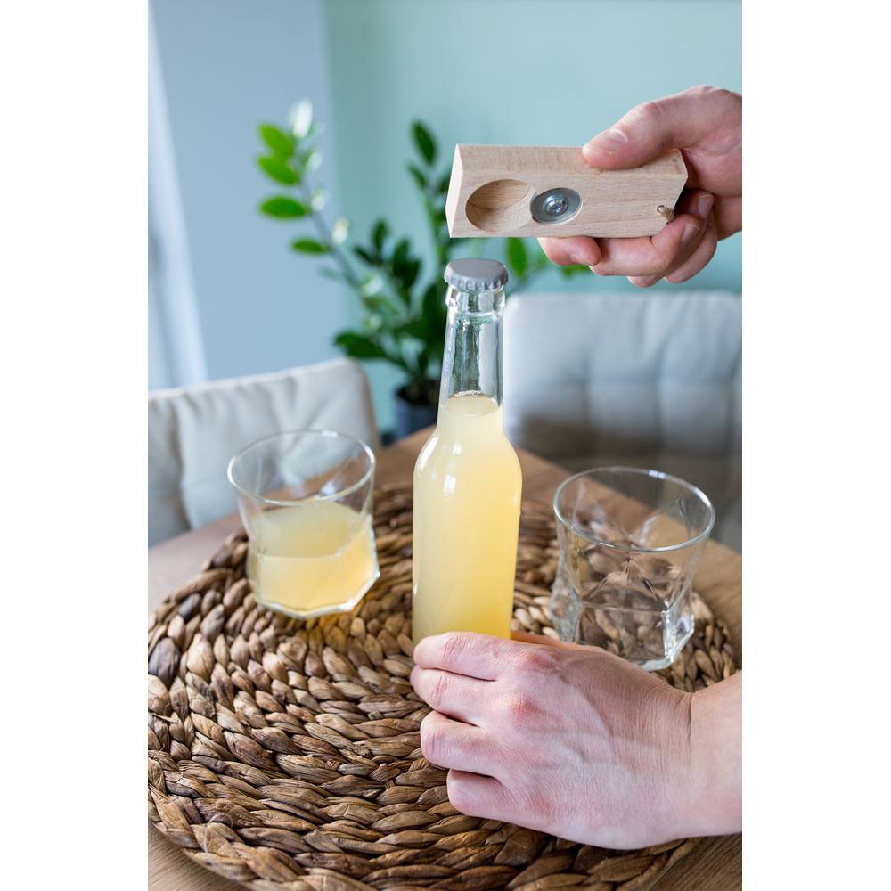 Otwieracz do butelek ze sznurkiem do łatwego zawieszania, produkt wykonany z drewna i metalu. Wyprodukowany w Europie.