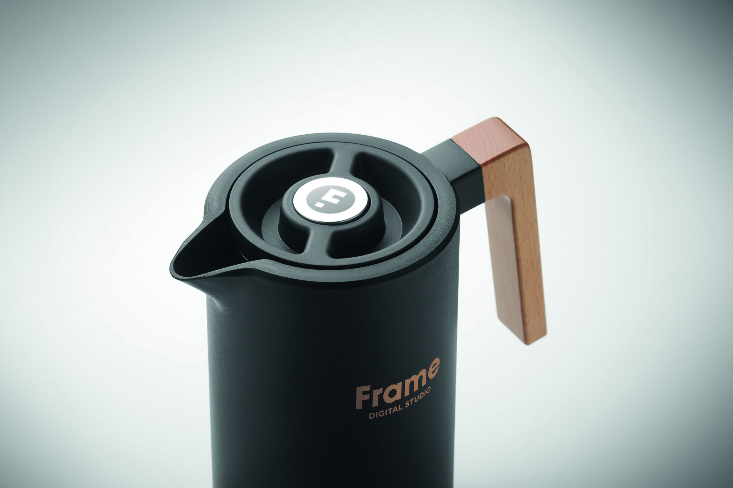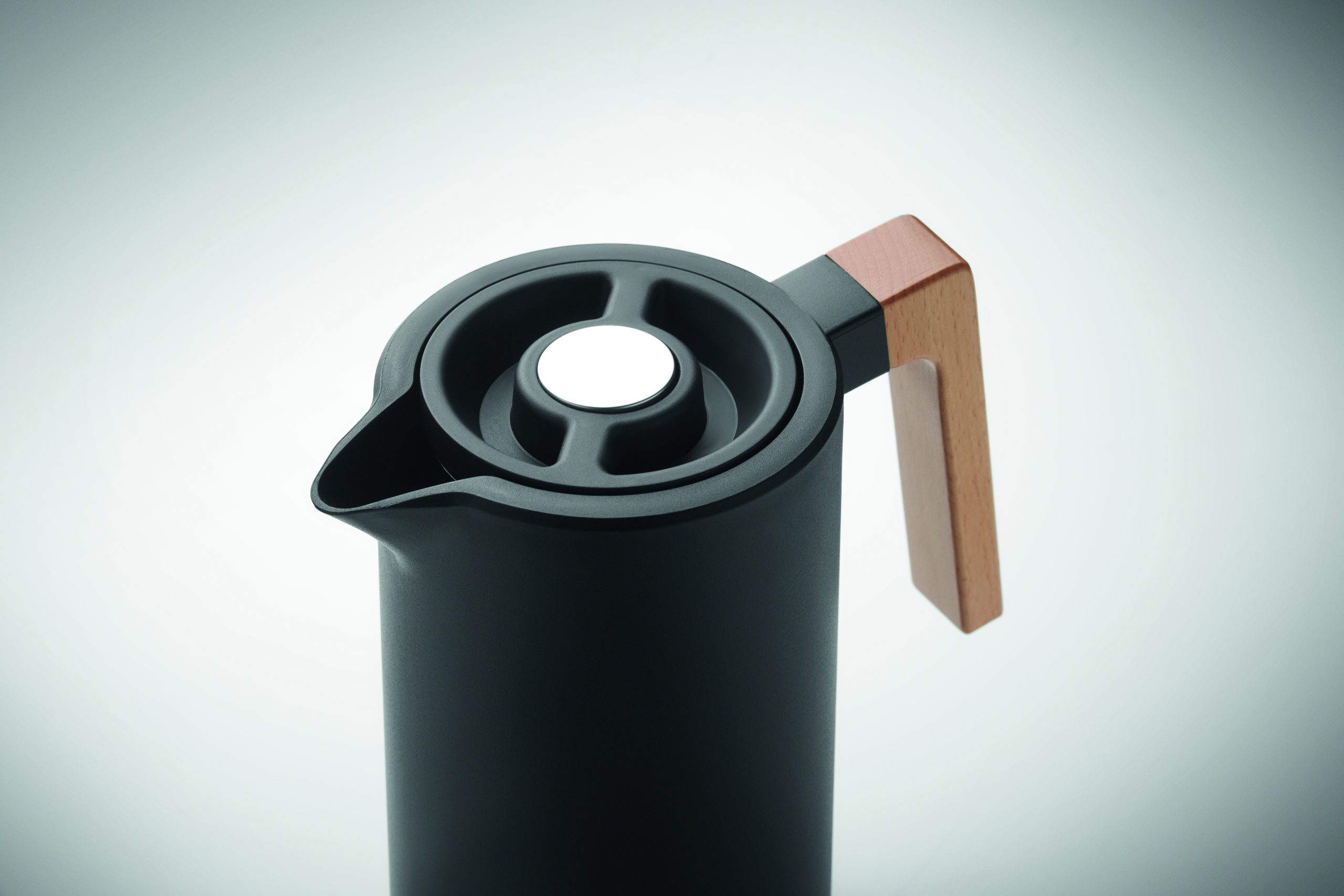 Podwójnie izolowany dzbanek próżniowy z recyklingowanej stali nierdzewnej wewnątrz i PP na zewnątrz z drewnianym uchwytem. Pojemność: 1 l.