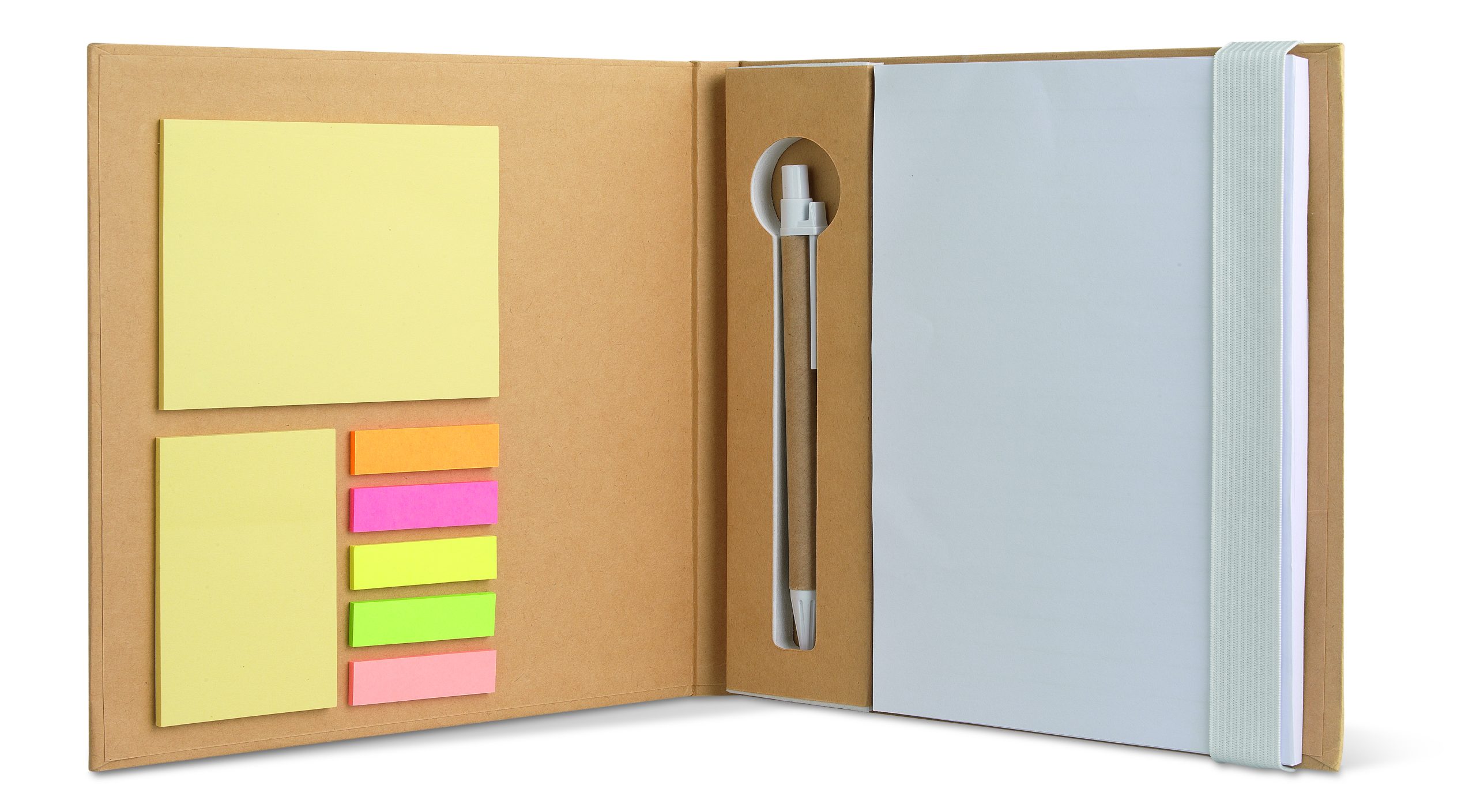 Notes z okładką z kartonu pochodzącego z recyklingu. 100 gładkich kartek. 3-częściowy zestaw karteczek samoprzylepnych. Duże i średnie żółte karteczki samoprzylepne oraz 5 znaczników w różnych kolorach. Dopasowany długopis z przyciskiem i papierowym korpusem. Uchwyt na długopis. Elastyczna taśma zamykająca. FSC®-certified | FSC MIX, P7.1, FSC-C213206