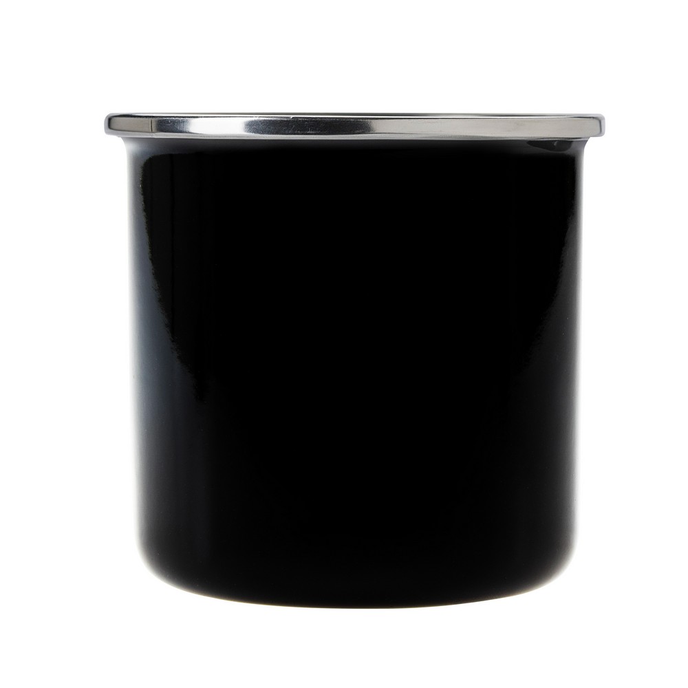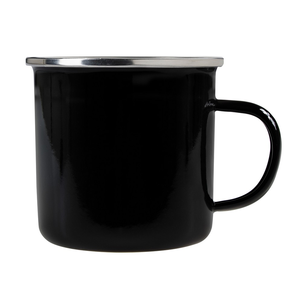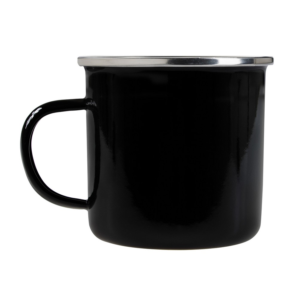 Emaliowany kubek 360 ml o błyszczącym wykończeniu, posiada białe wnętrze oraz krawędź w kolorze srebrnym, produkt wykonany z metalu