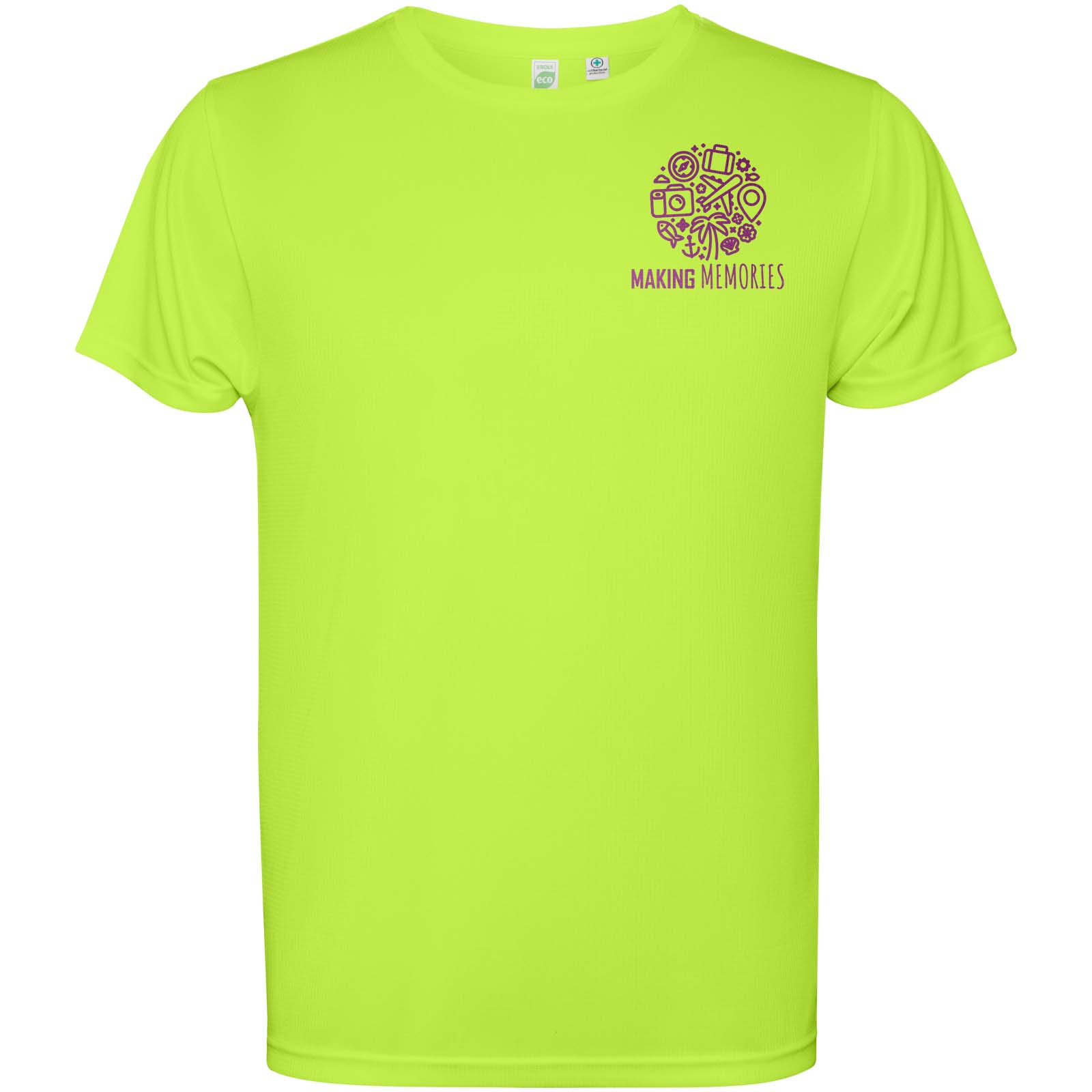 Short-sleeved technical t-shirt for kids. Collar with matching seams. Back hem slightly longer than the front. Side seams shifted forward.