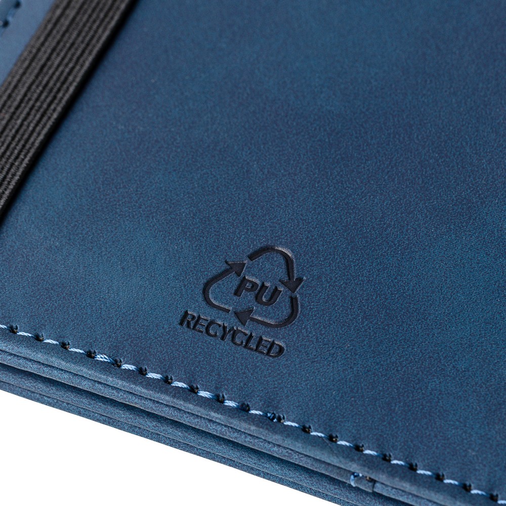 Etui do paszportu, zawieszka do bagażu, ikona recyklingu na obu produktach, zapakowane razem w brązowe pudełko, produkt wykonany z PU z recyklingu