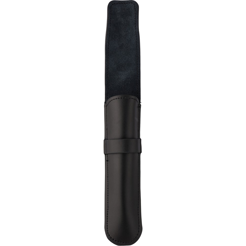 Dwuwarstwowe etui na długopisy ze skóry z klapką i paskiem zapinającym, miękka wyściółka od środka, zapakowane w rękaw papieru