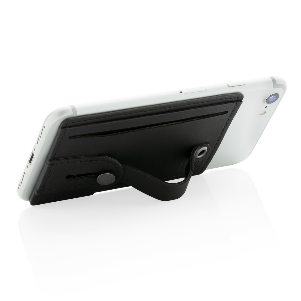 Etui na karty kredytowe 3 w 1, stojak na telefon, uchwyt do telefonu, ochrona RFID, mieści do 2 kart, wykonane z PU, posiada taśmę umożliwiającą przyczepienie do płaskiej powierzchni telefonu, po wysunięciu paska działa jako uchwyt lub stojak na telefon, ślad węglowy produktu: 0,09 kg CO2
