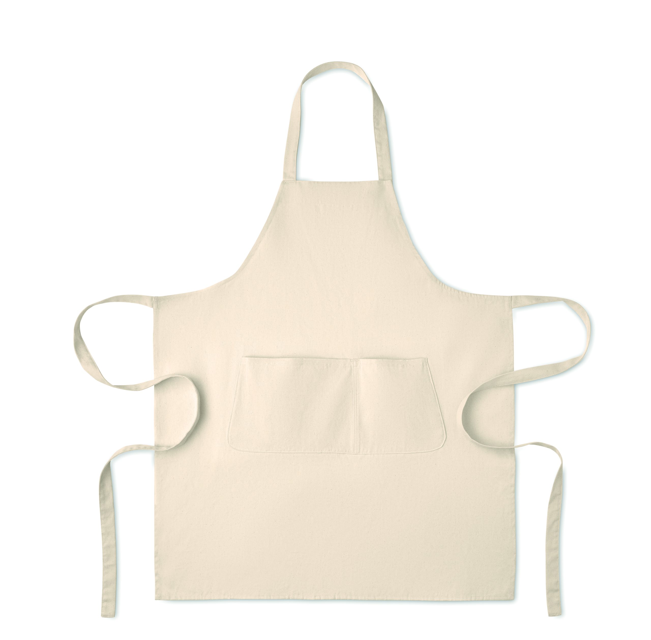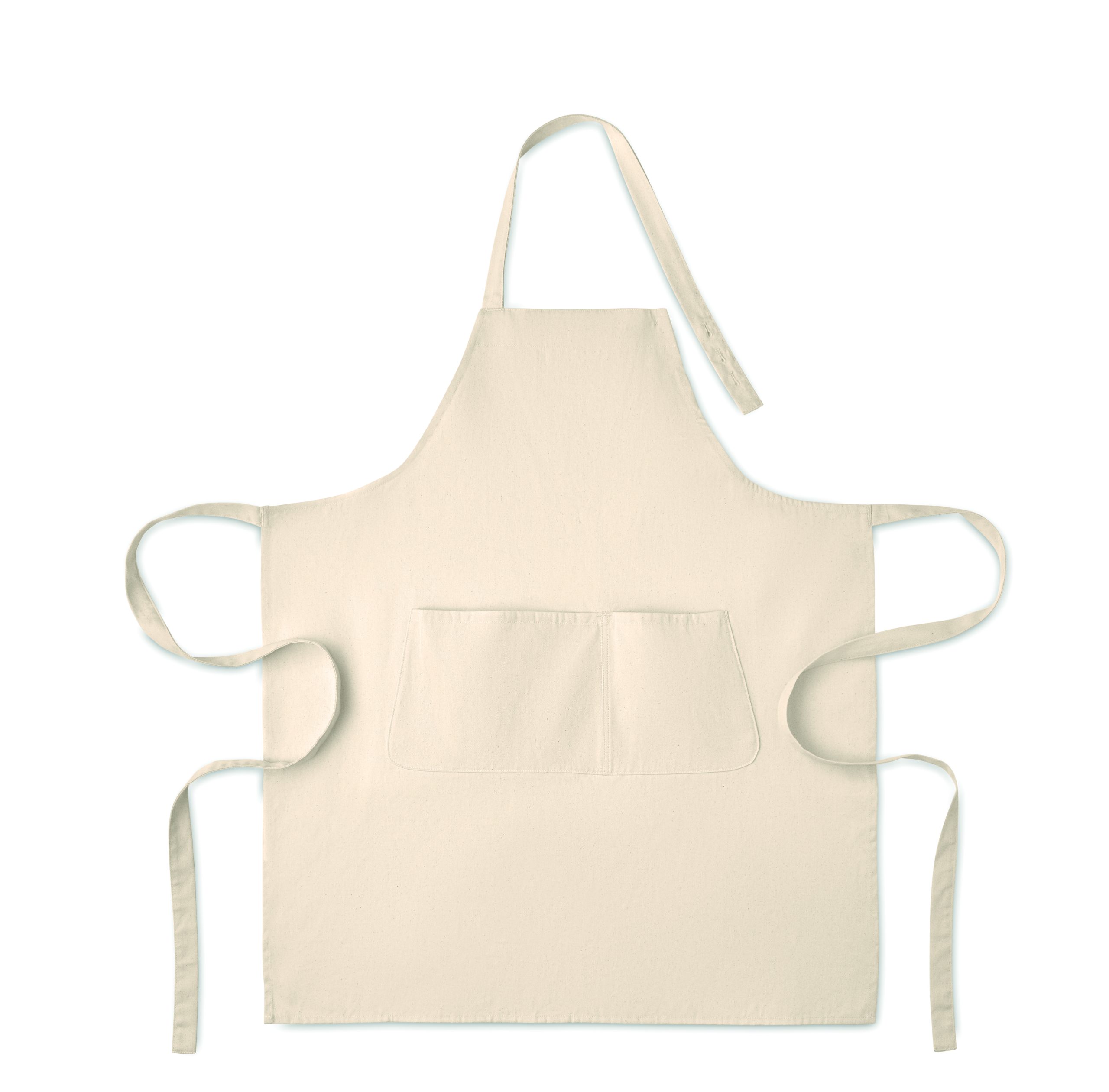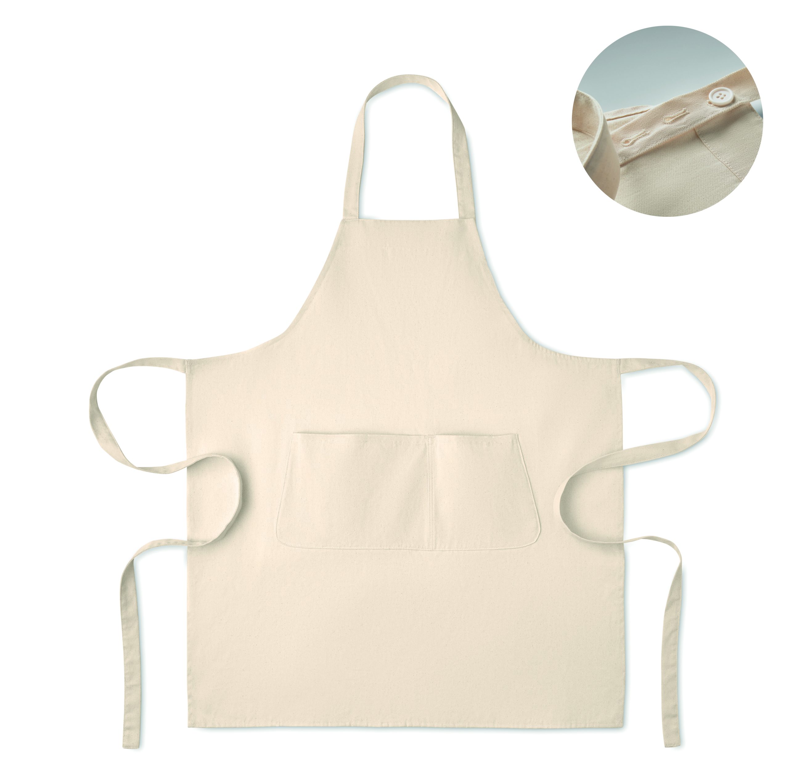 Regulowany fartuch z 1 dużą kieszenią z przodu i 2 przegrodami z bawełny organicznej 240 gr/m². Regulowany guzik na pasku na szyję.