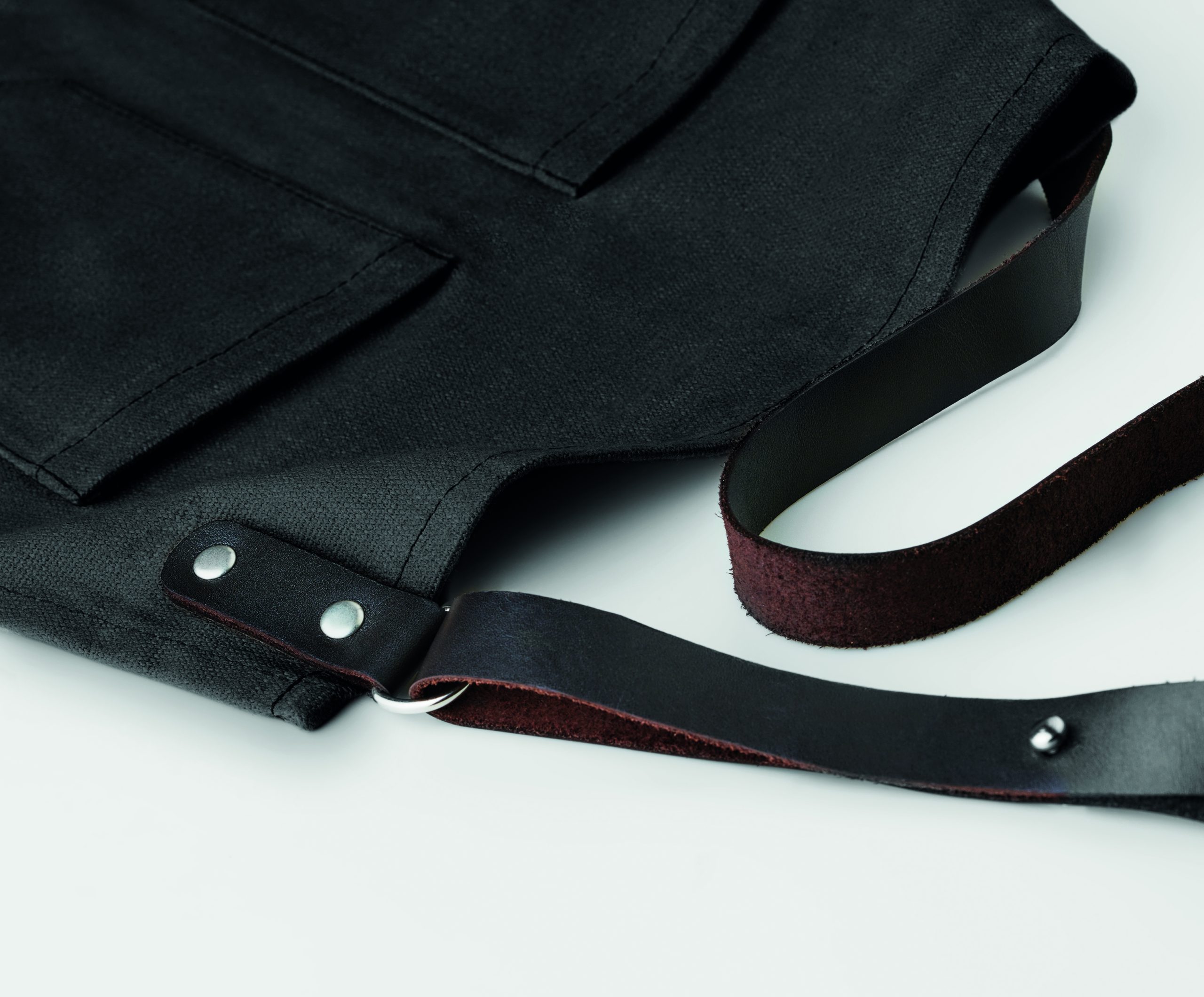 Fartuch z woskowanego płótna z elementami ze skóry. Regulowany pasek, 2 mniejsze kieszenie i 1 większa w dolnej części fartucha.