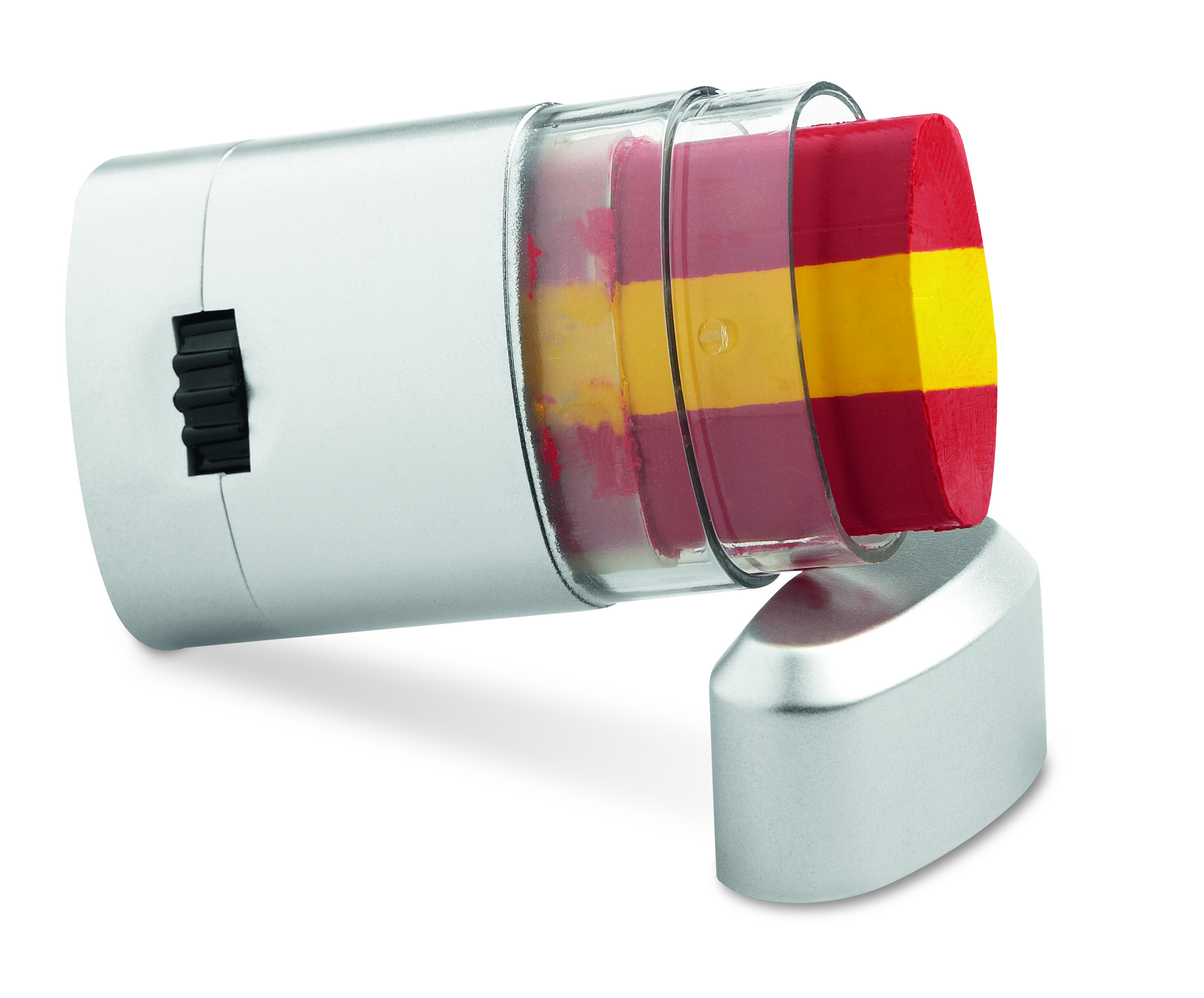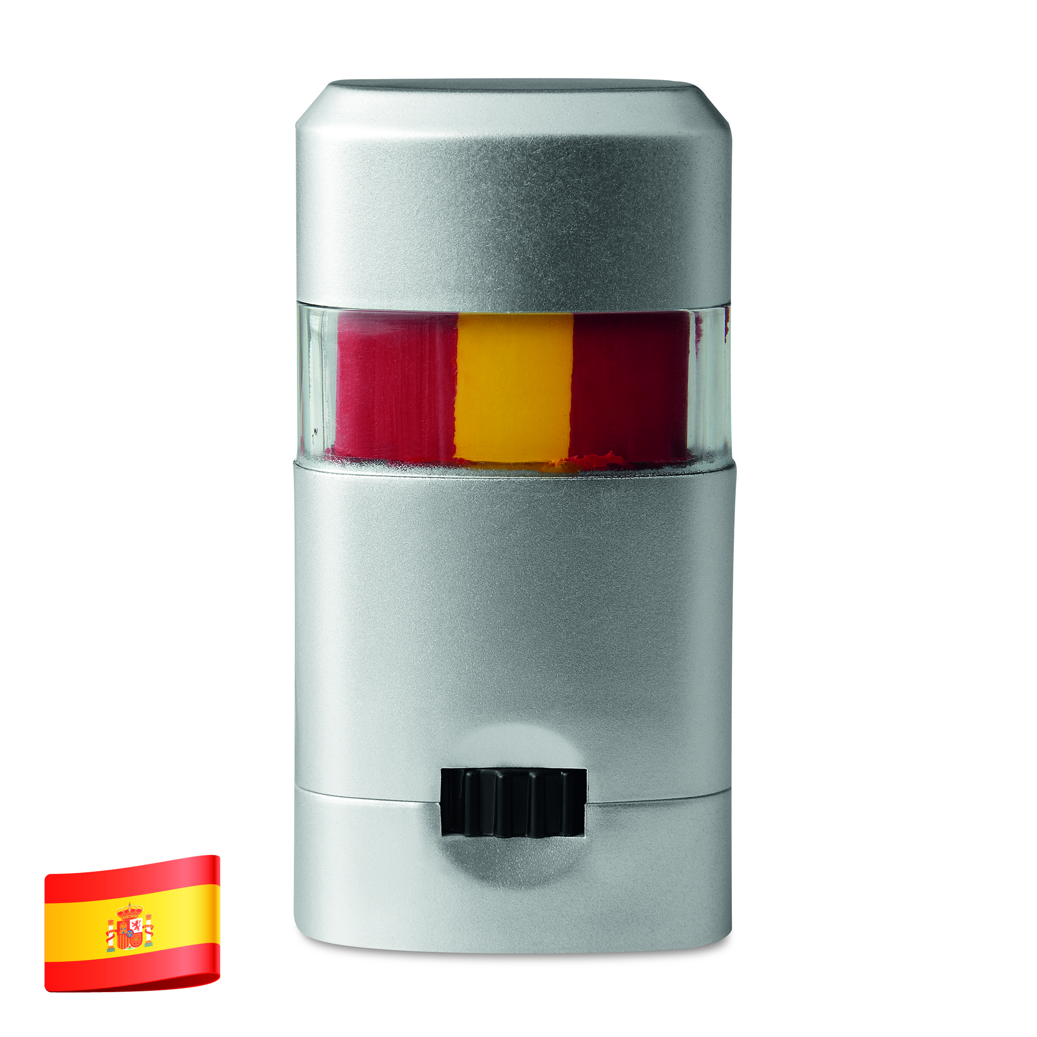 Trójkolorowe flamastry do malowania po twarzy. Pakowane w srebrne plastikowe pudełko z przezroczystym wieczkiem. Barwy flag Hiszpanii, Niemiec, Włoch, Holandii.