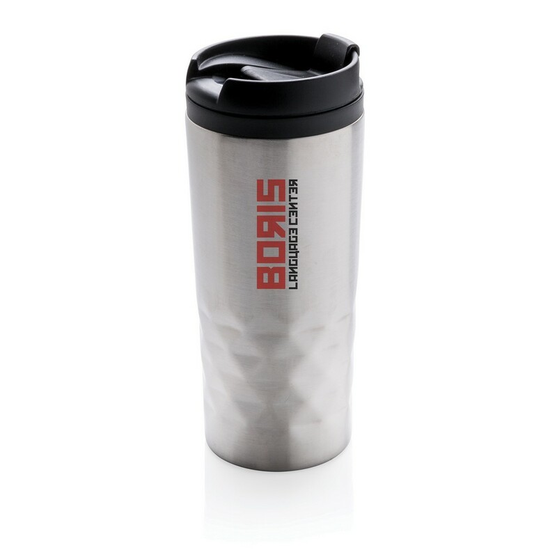 Geometryczny kubek termiczny 300 ml, plastikowe wnętrze, stal nierdzewna na zewnątrz, wyłącznie mycie ręczne, utrzymuje temperaturę napojów gorących do 4 godzin