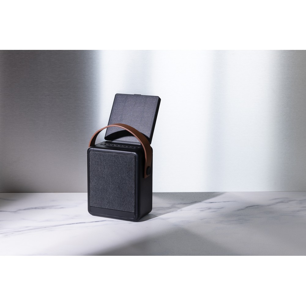 Głośnik bezprzewodowy 12W, BT 5.3, zintegrowany panel słoneczny do ładowania głośnika, lampka LED, prędkość ładowania solarnego 5V/0.3A, wbudowany mikrofon, funkcja odbierania połączeń, wbudowany akumulator o pojemności 2000 mAh umożliwia odtwarzanie muzyki do 8 godzin, zasięg do 10 m, kabel z TPE z recyklingu z certyfikatem RCS, ślad węglowy produktu: 6,66 kg CO2