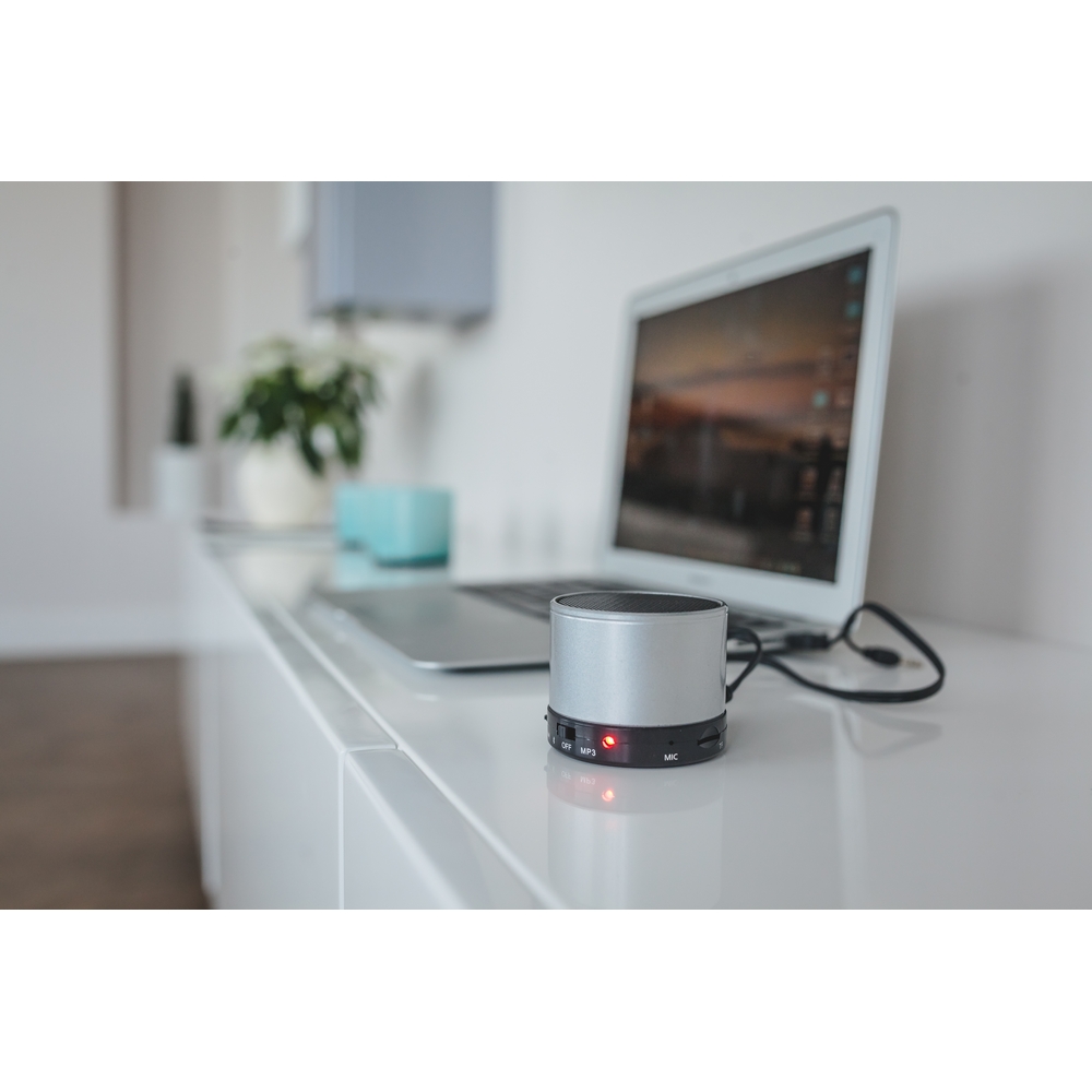 Głośnik bezprzewodowy BT 4.0 + EDR 3W z baterią 400 mAh, posiada radio, funkcję odbierania połączeń oraz czytnik kart TF/micro SD, zasięg do 10 m, w komplecie kabel audio 3,5 mm z końcówkami USB i mini USB