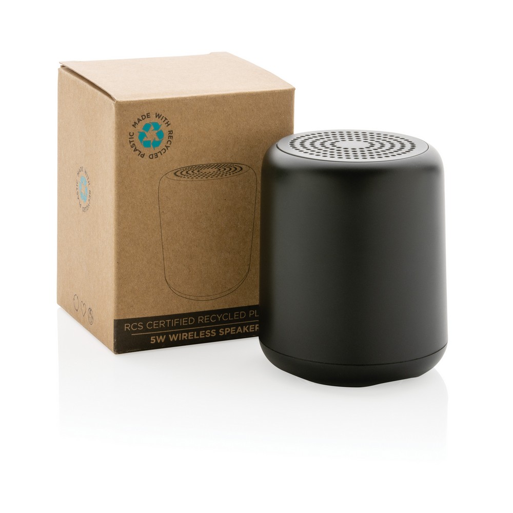Głośnik bezprzewodowy 5W, BT 5.0, wykonany z ABS i PET pochodzącego z recyklingu z certyfikatem RCS (Recycled Claim Standard), całkowita zawartość materiałów z recyklingu obliczona na podstawie wagi całkowitej przedmiotu: 38%, akumulator o pojemności 300 mAh umożliwia odtwarzanie muzyki do 5 godzin, zasięg do 10m, wbudowany mikrofon, funkcja odbierania połączeń, w pudełku kraftowym z certyfikatem FSC® mix, kabel wykonany z TPE z recyklingu w komplecie, nie zawiera PVC, ślad węglowy produktu: 3,75 kg CO2